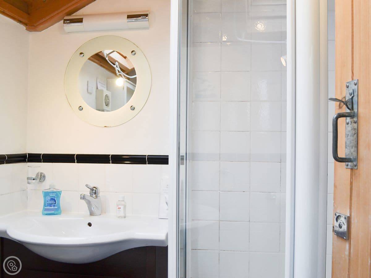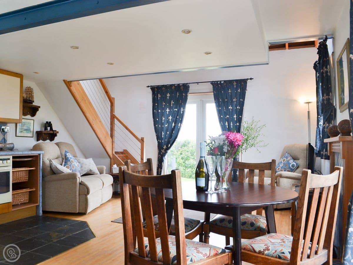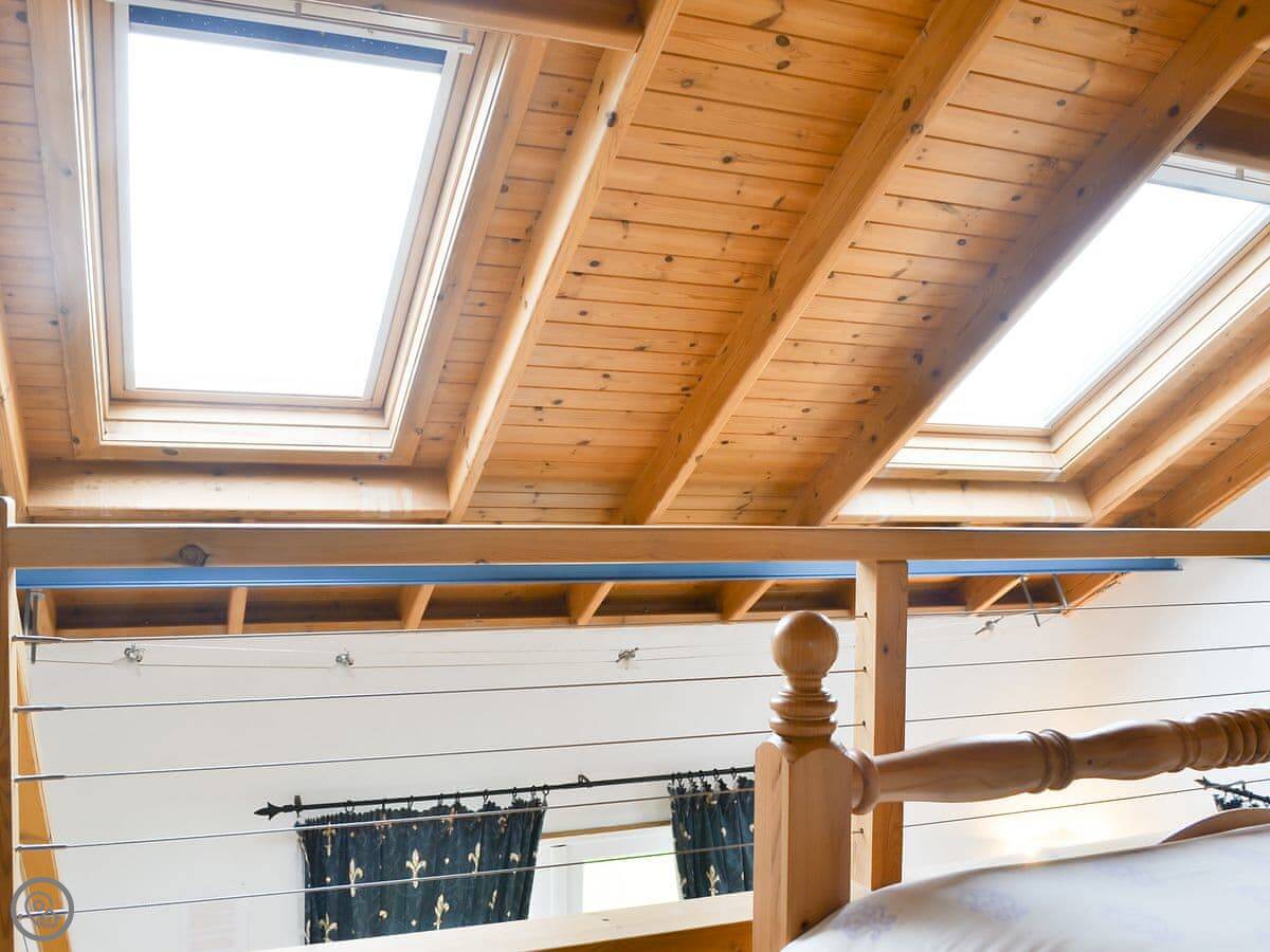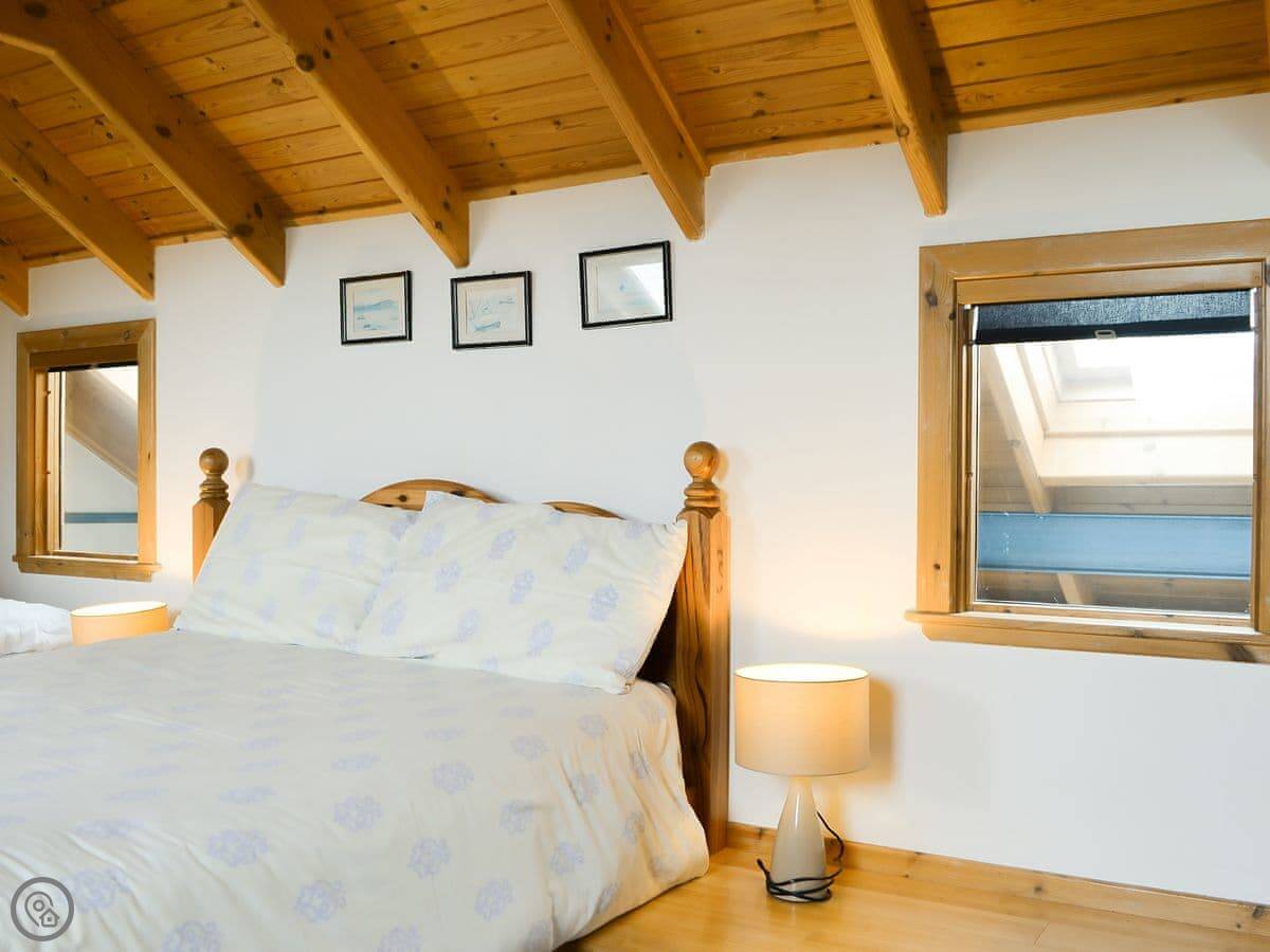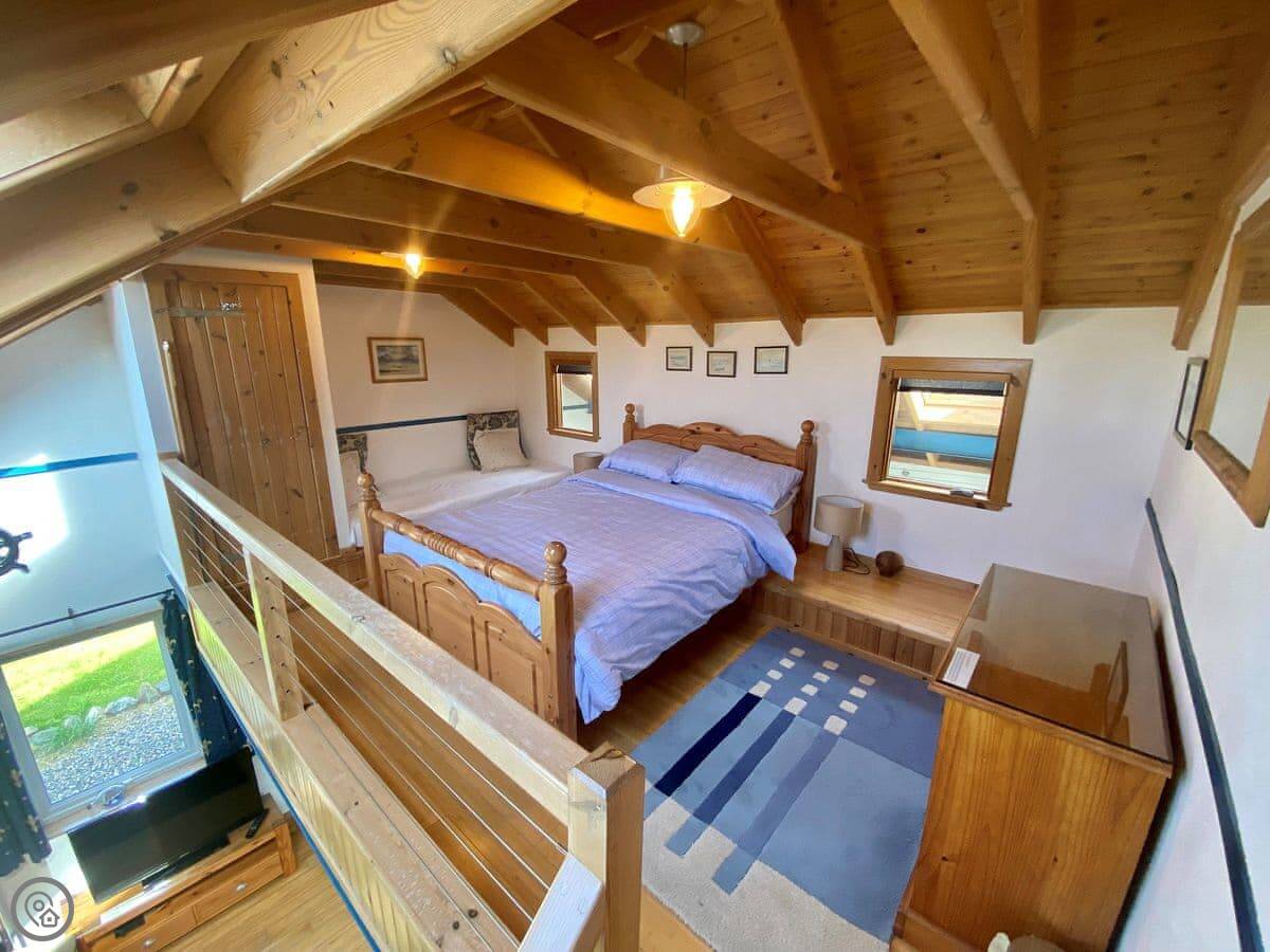 The bedroom is upstairs. The stairs are steep and spiral, so watch your head. Up there is a double bed and a small single.