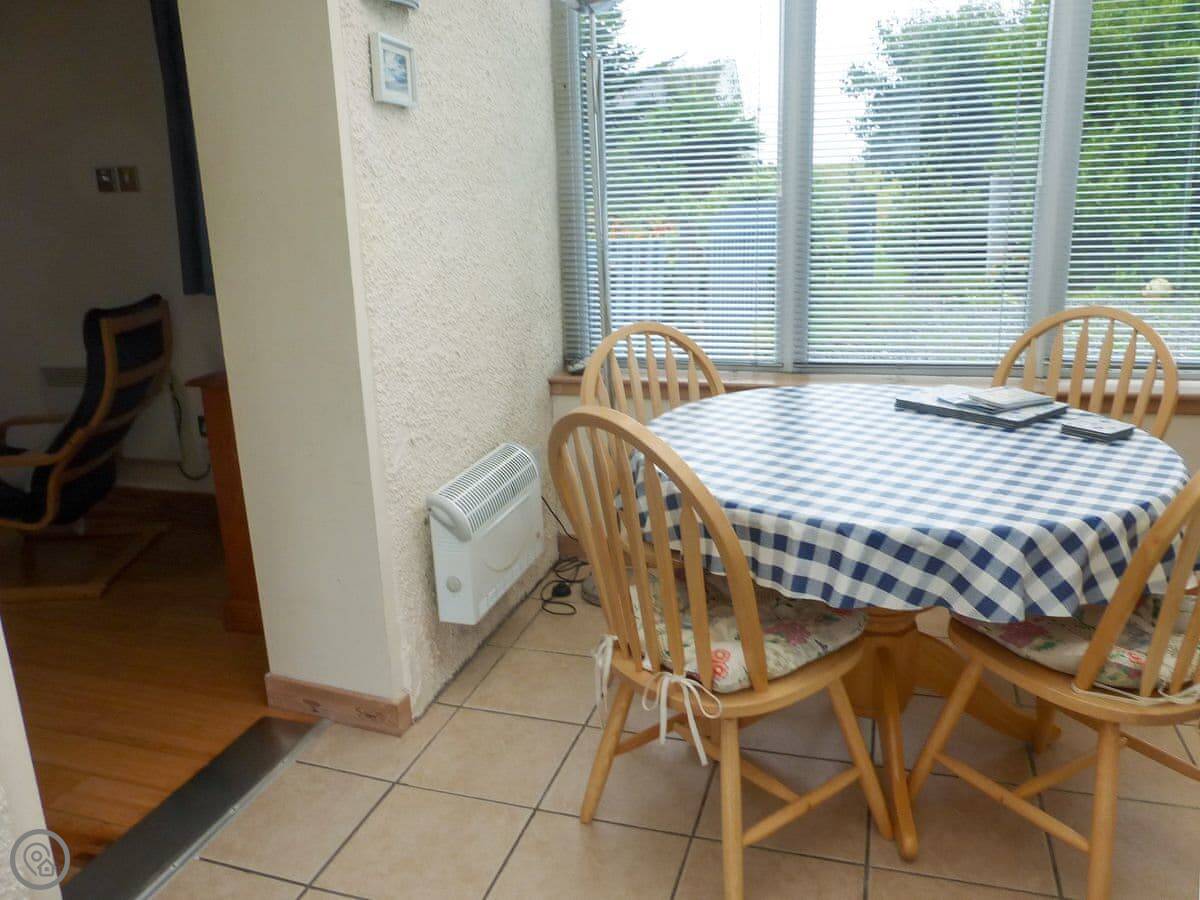 You come in through a little conservatory area. It's got a table and you get a good view of the sunset from there. Then you're into the main room, which is kitchen and living space. It's open plan with wooden floors. It's a good spot to sit after you've been out all day.