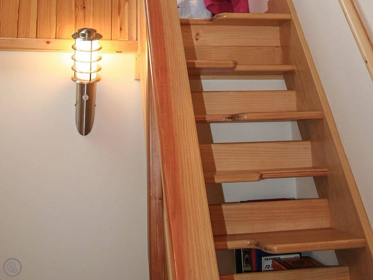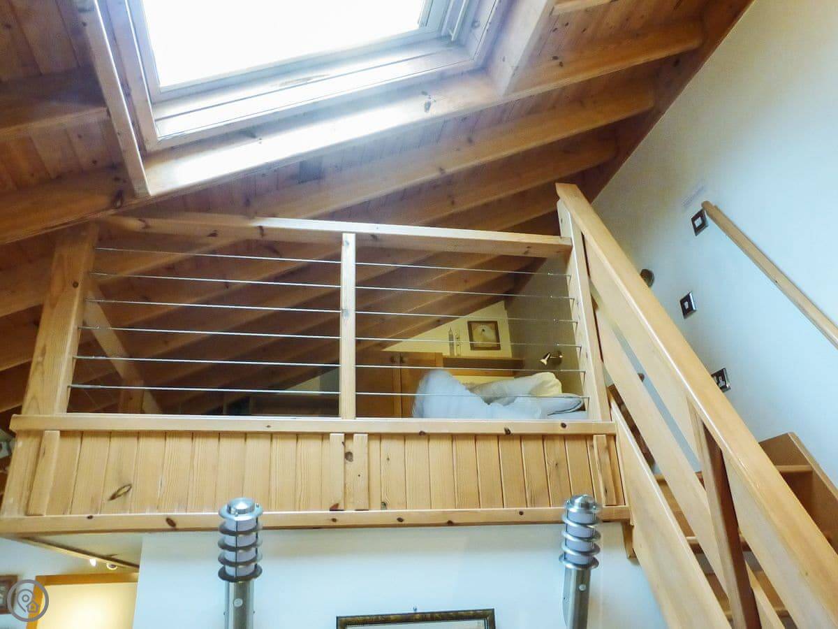 The bed is up on a mezzanine platform. The stairs up to it are the alternate tread type. They save space but they're steep and a bit narrow. Not great if you're unsteady on your feet.