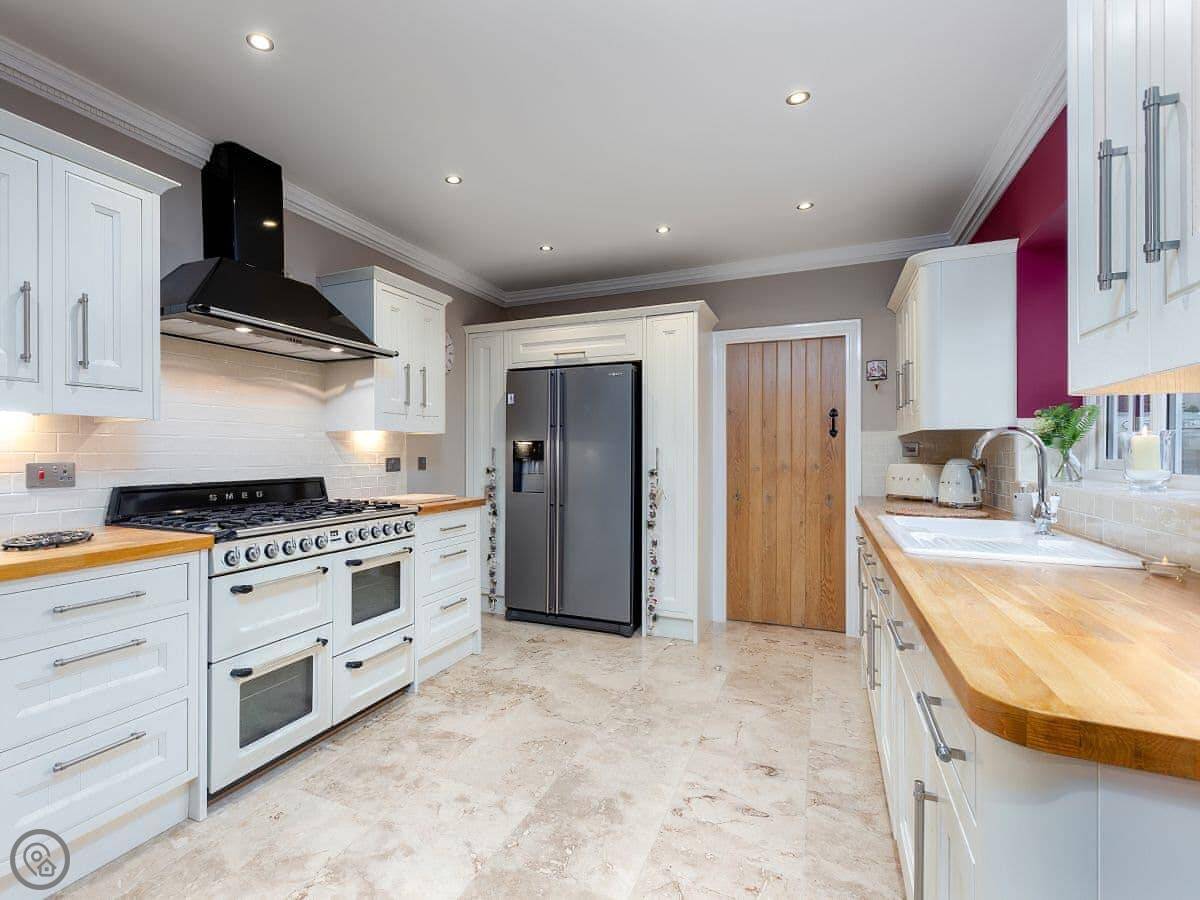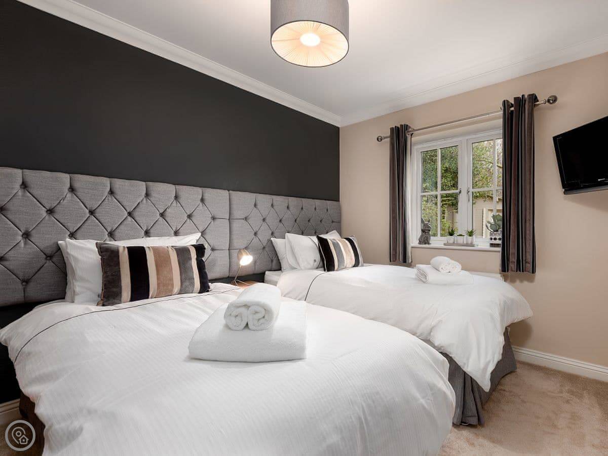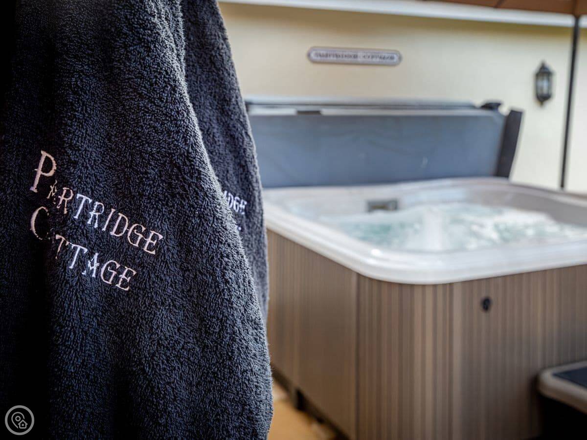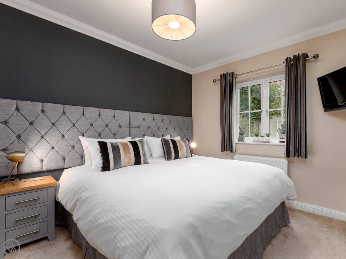 It's got a 5 Star rating, which mainly means it's well-finished and has the things you need. There's a big open plan kitchen and living area. Outside, there's an enclosed garden with a patio, a BBQ, and a private hot tub. There's also a separate, large enclosed green space with some play things for kids, which you share with the neighbour.