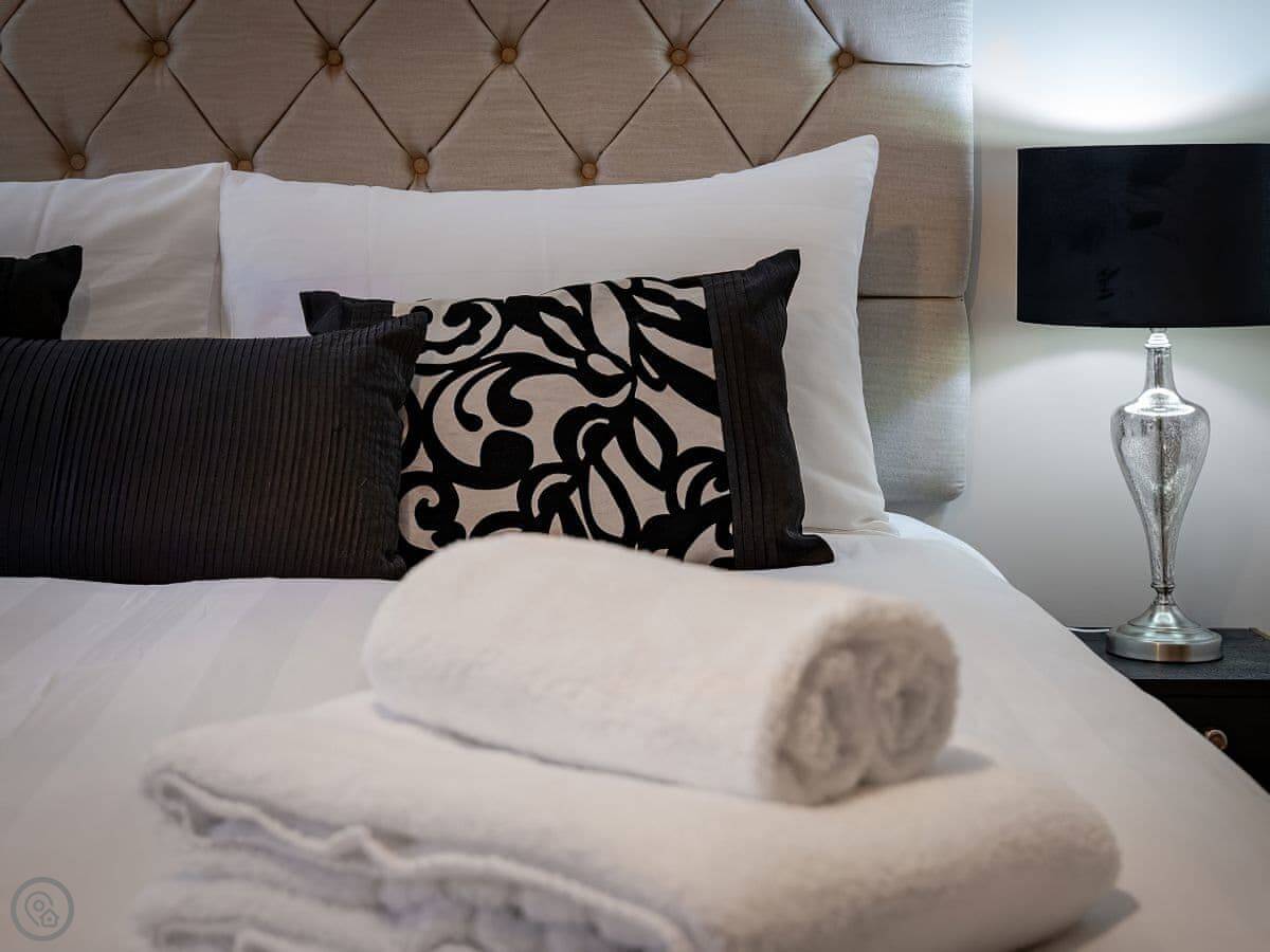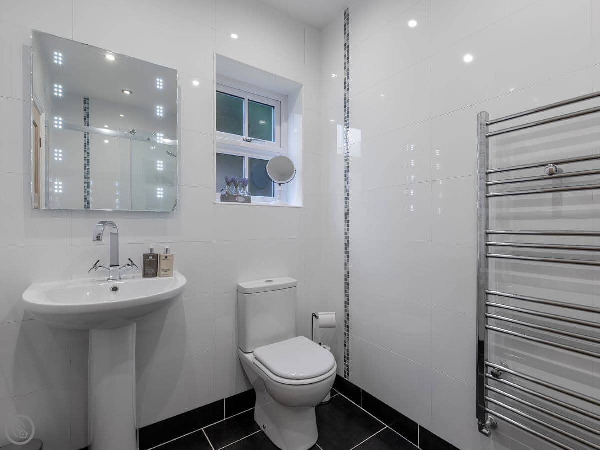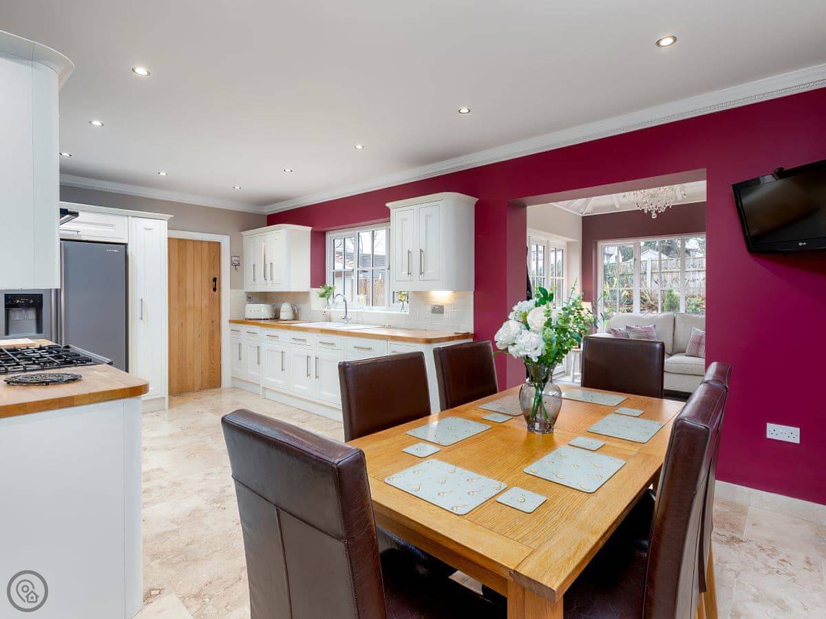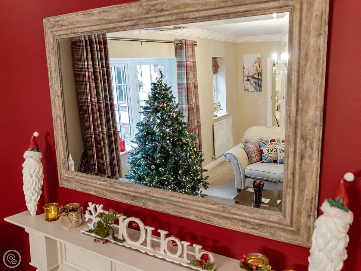It's got a 5 Star rating, which mainly means it's well-finished and has the things you need. There's a big open plan kitchen and living area. Outside, there's an enclosed garden with a patio, a BBQ, and a private hot tub. There's also a separate, large enclosed green space with some play things for kids, which you share with the neighbour.