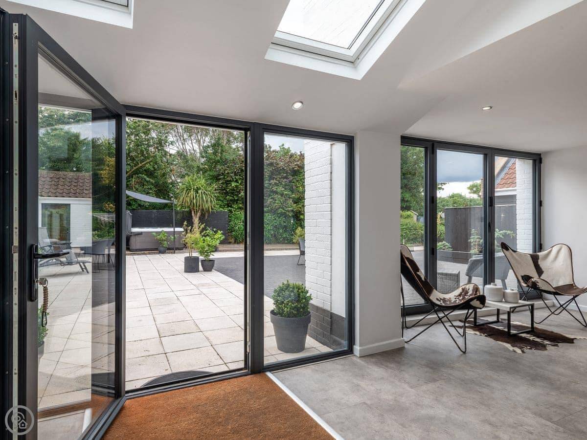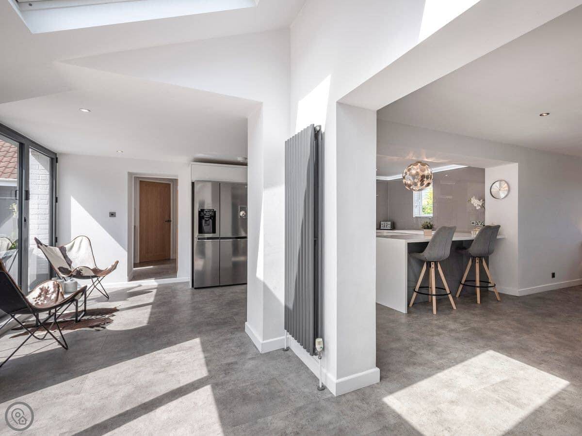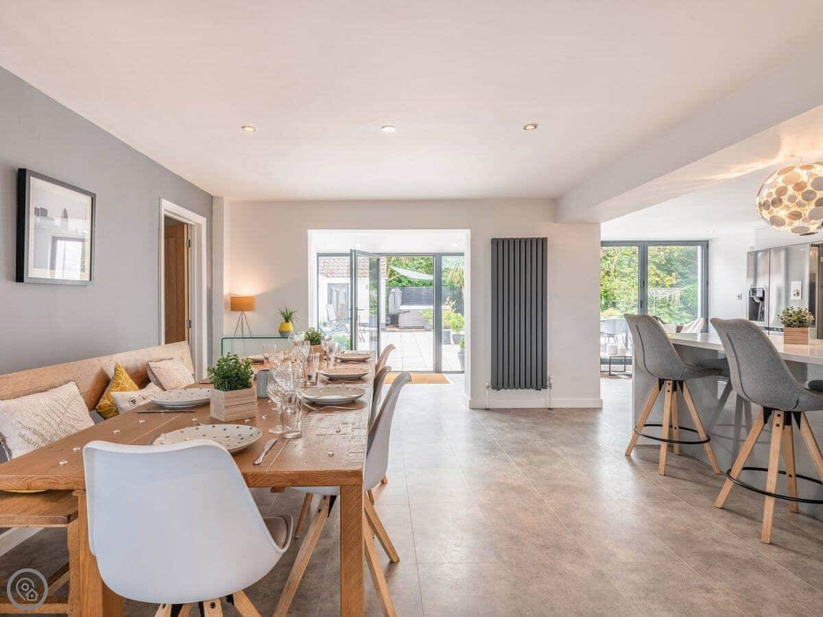 The main living area is open plan with big folding doors out to the garden. The kitchen's nice. There's a separate dining room if you need it. Upstairs, the bedrooms are a good size.