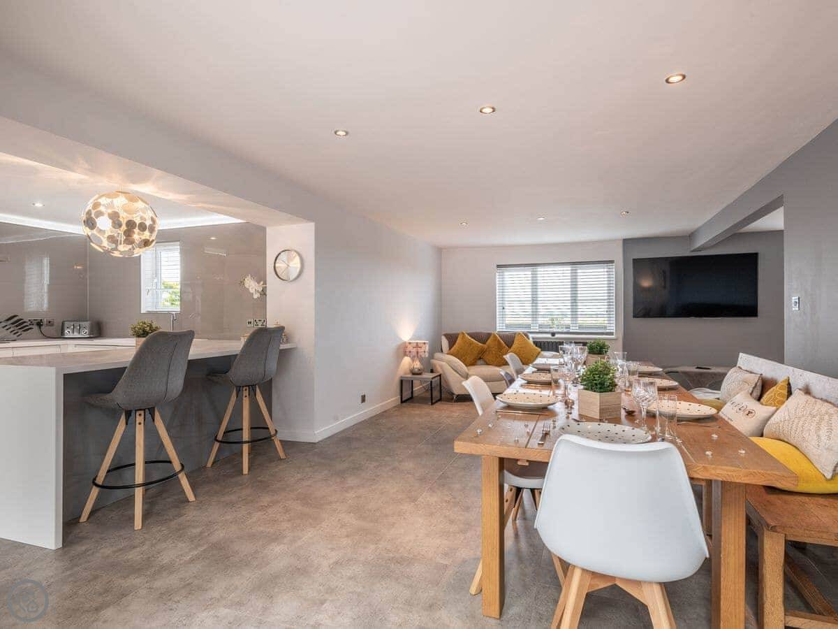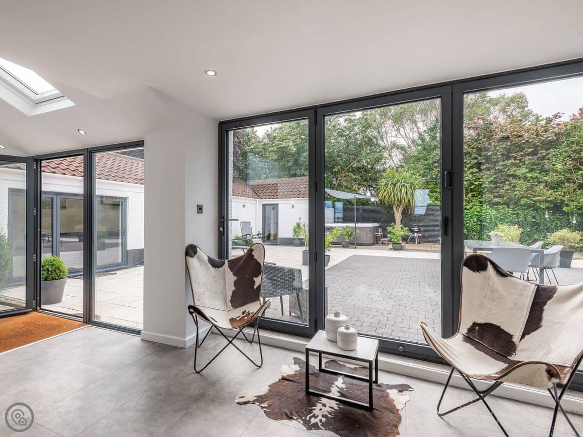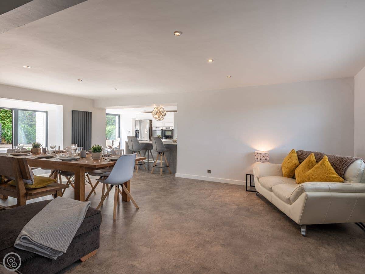 The main living area is open plan with big folding doors out to the garden. The kitchen's nice. There's a separate dining room if you need it. Upstairs, the bedrooms are a good size.