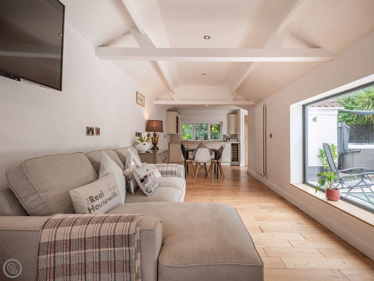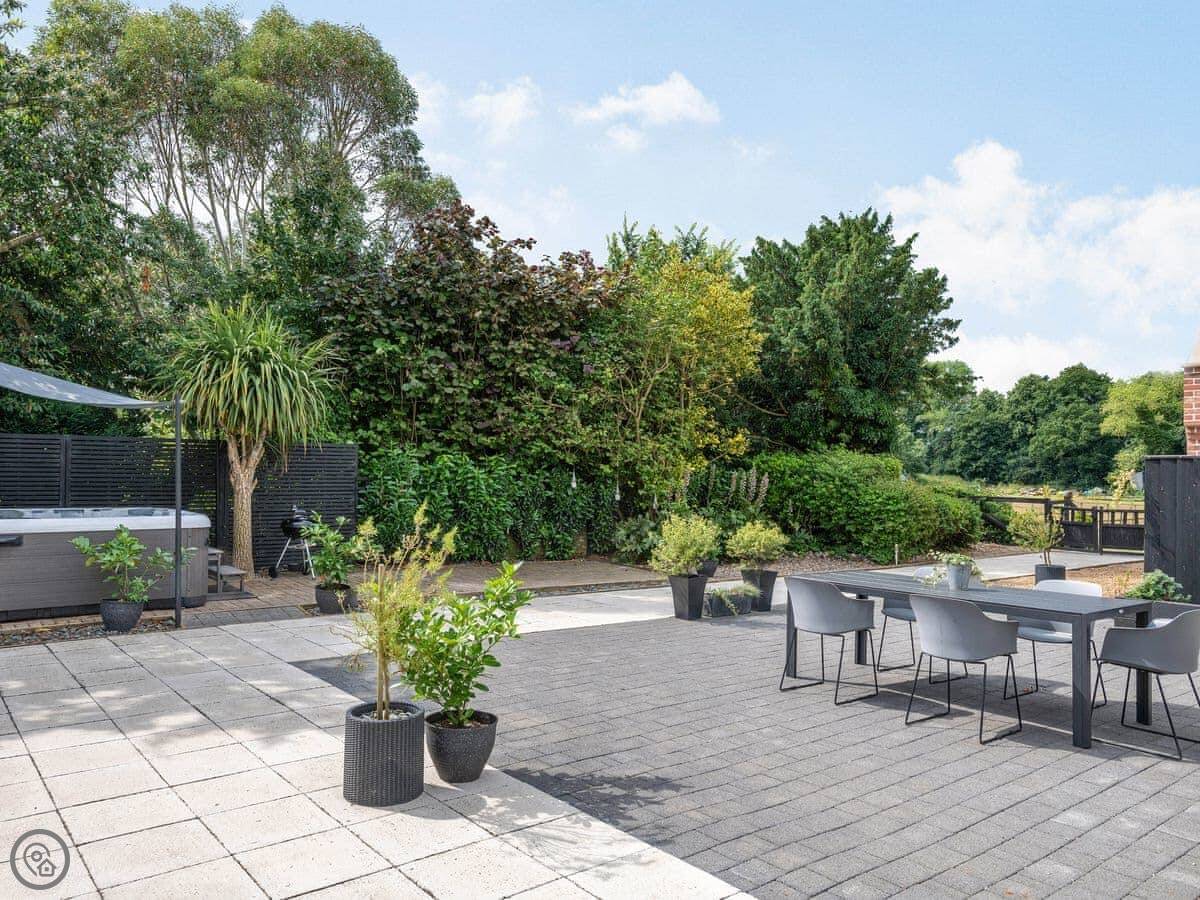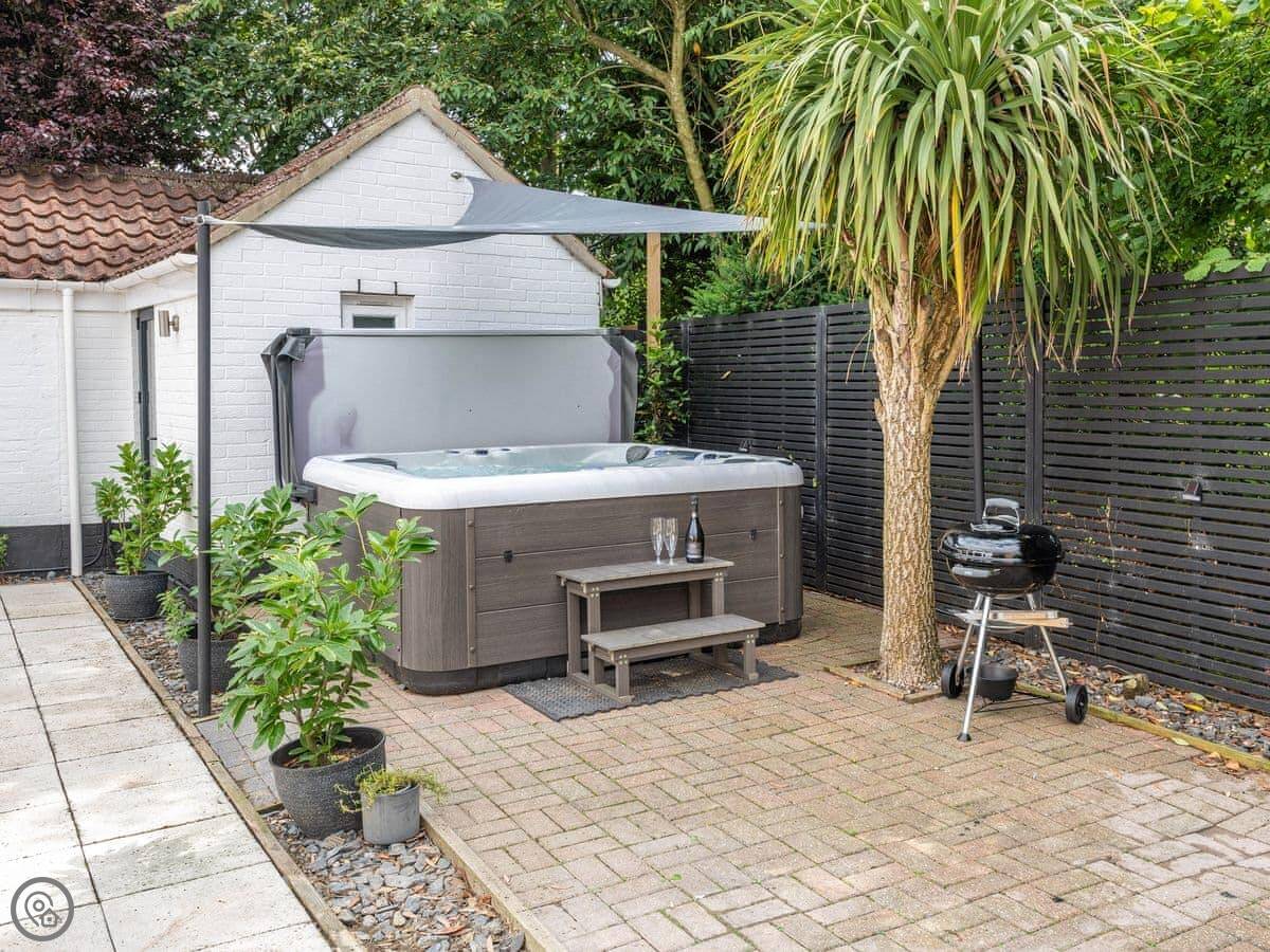 Outside, the garden is enclosed. There's a hot tub. There's also a shared meadow field on the site if you want more space.