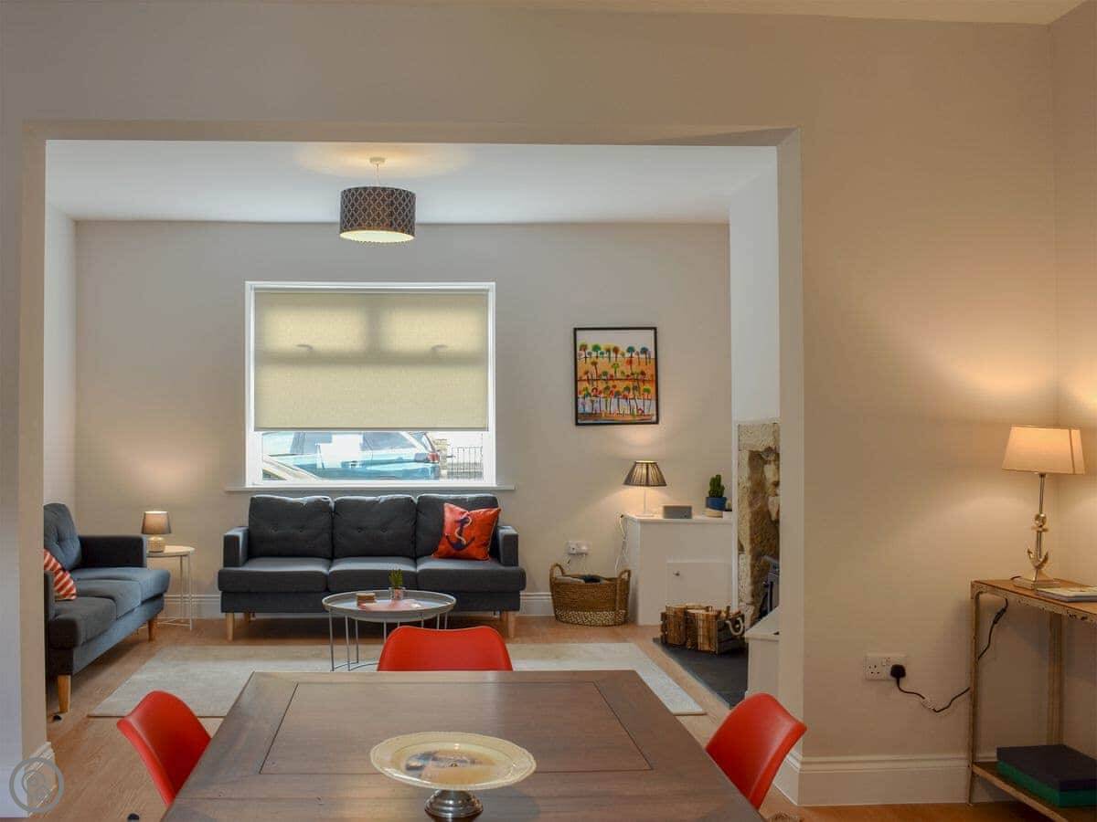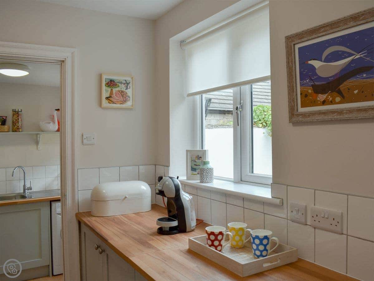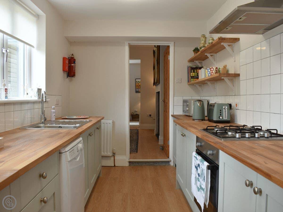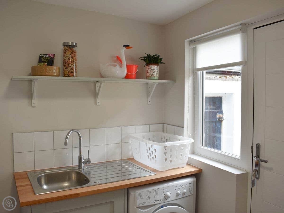 You've got an open plan living area downstairs with a wood burner. There are two sofas and a Smart TV. The kitchen was redone a few years ago. It has a coffee machine. There's a separate utility room with a washing machine, which is handy for wet coats or dog towels.