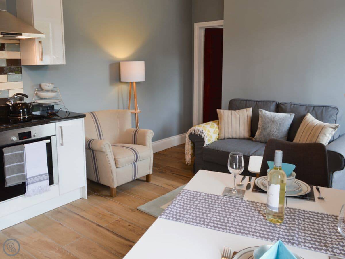 It's just for two people. The bedroom and bathroom are upstairs. It's got a 4 Star rating. The main thing is it's been done up well and it's clean. There's a balcony that gets the sun and looks out over the street. You can see the Bakewell Tart shop from it.
