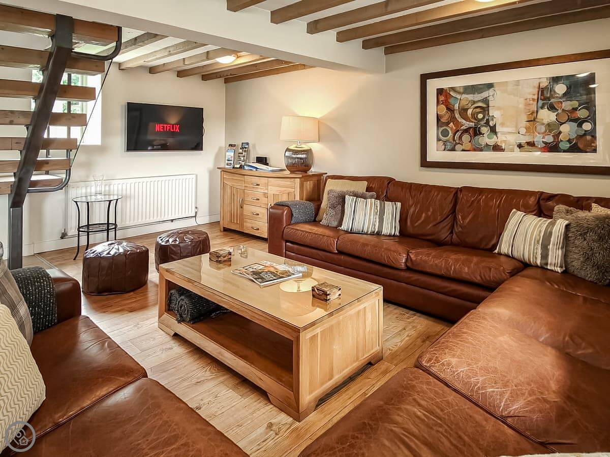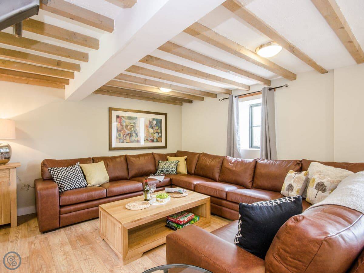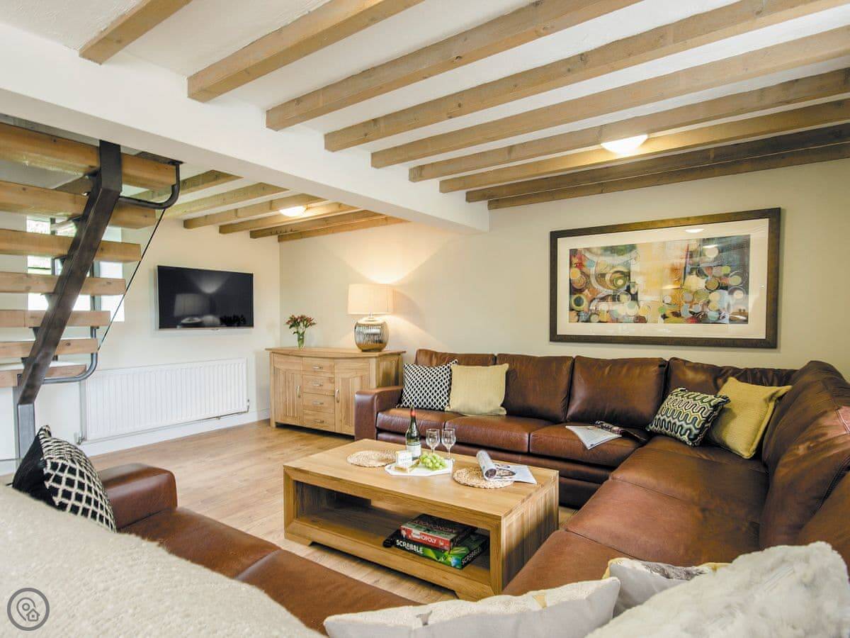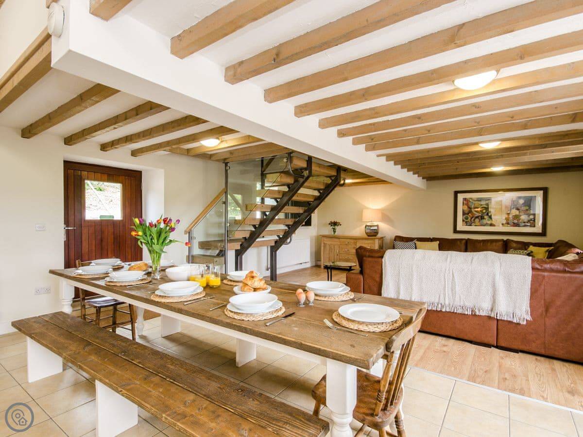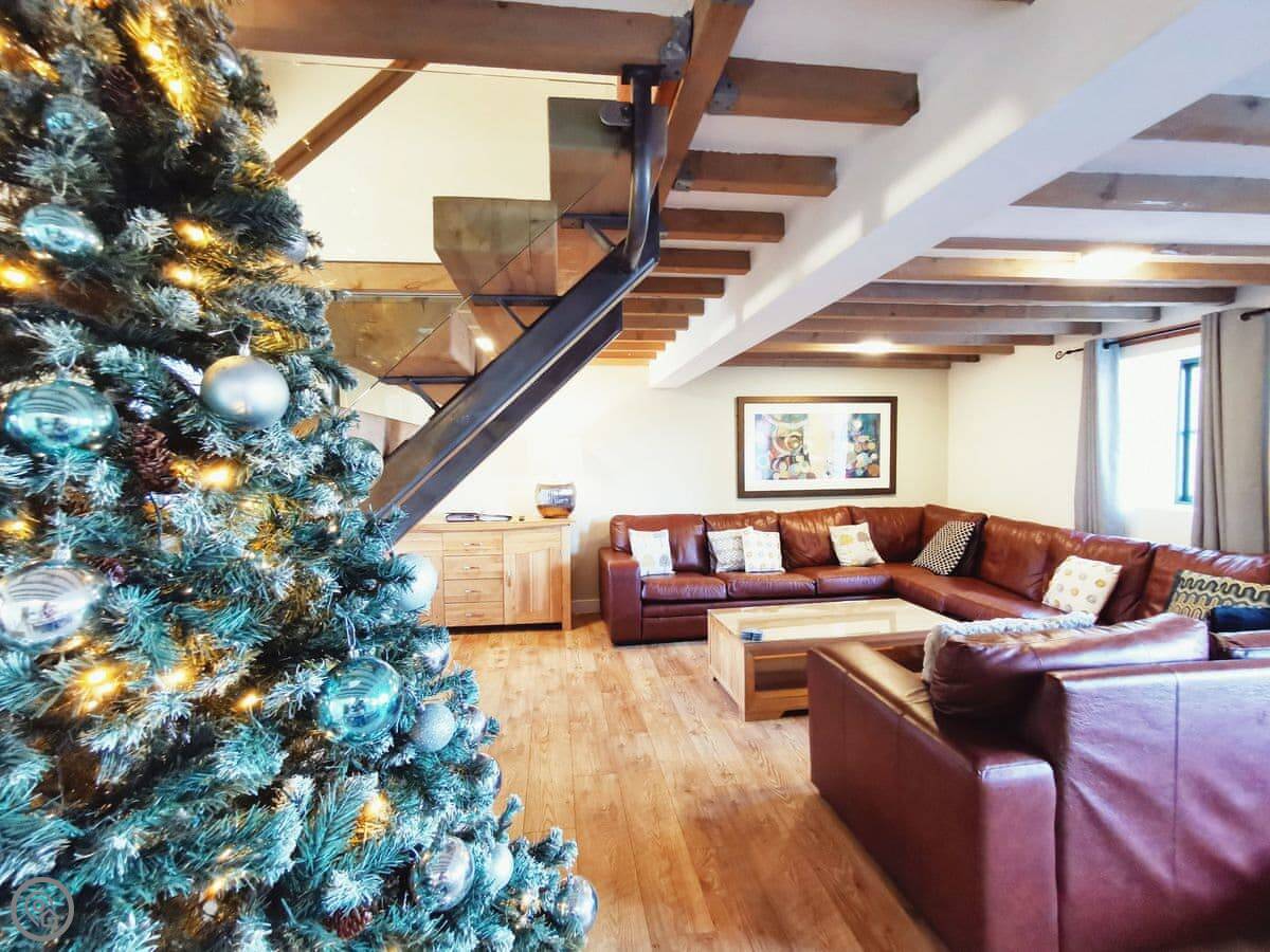 It sleeps up to 14 people. There are seven bedrooms and five bathrooms, so it's a big place. It's got a 4 Star rating. It's a converted barn, so you get the oak beams and stone walls. The main living area is open-plan.