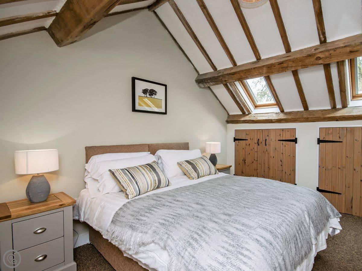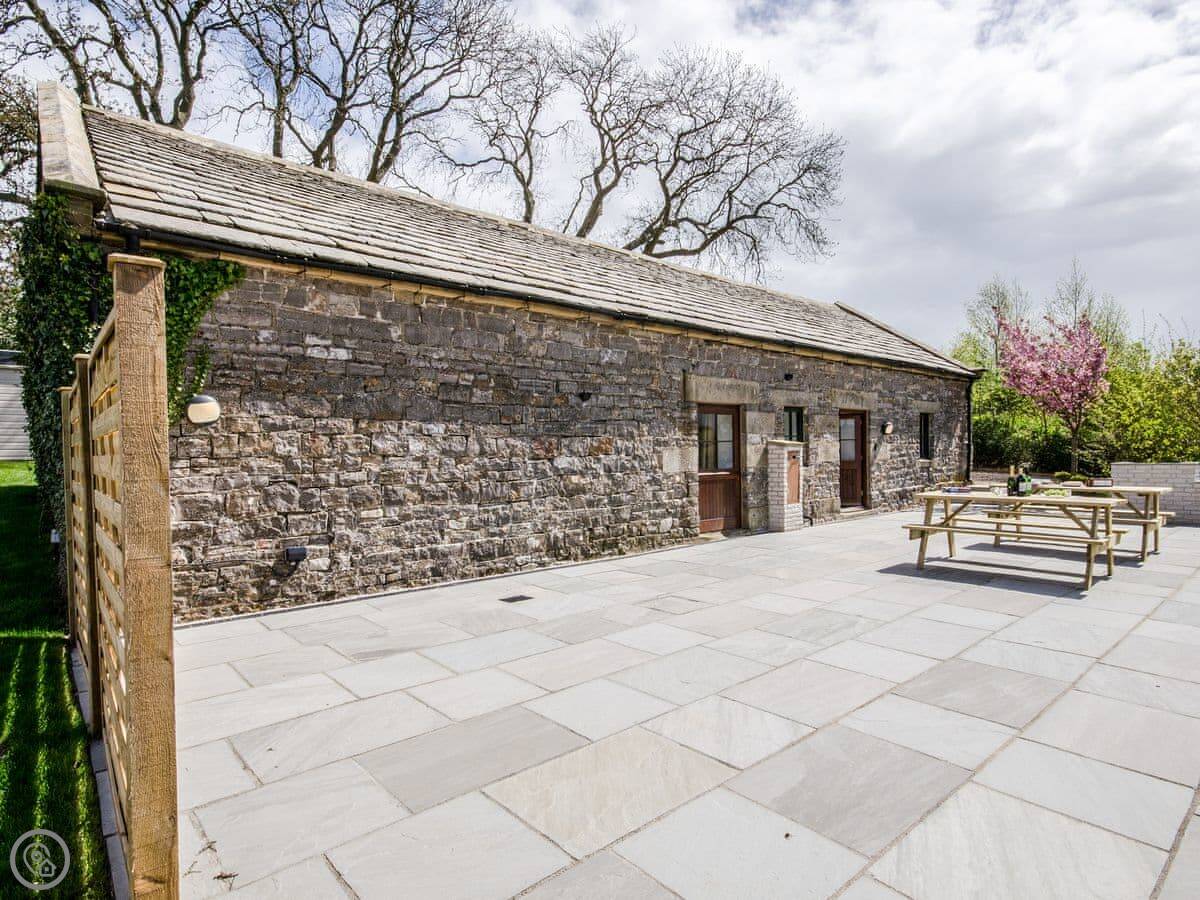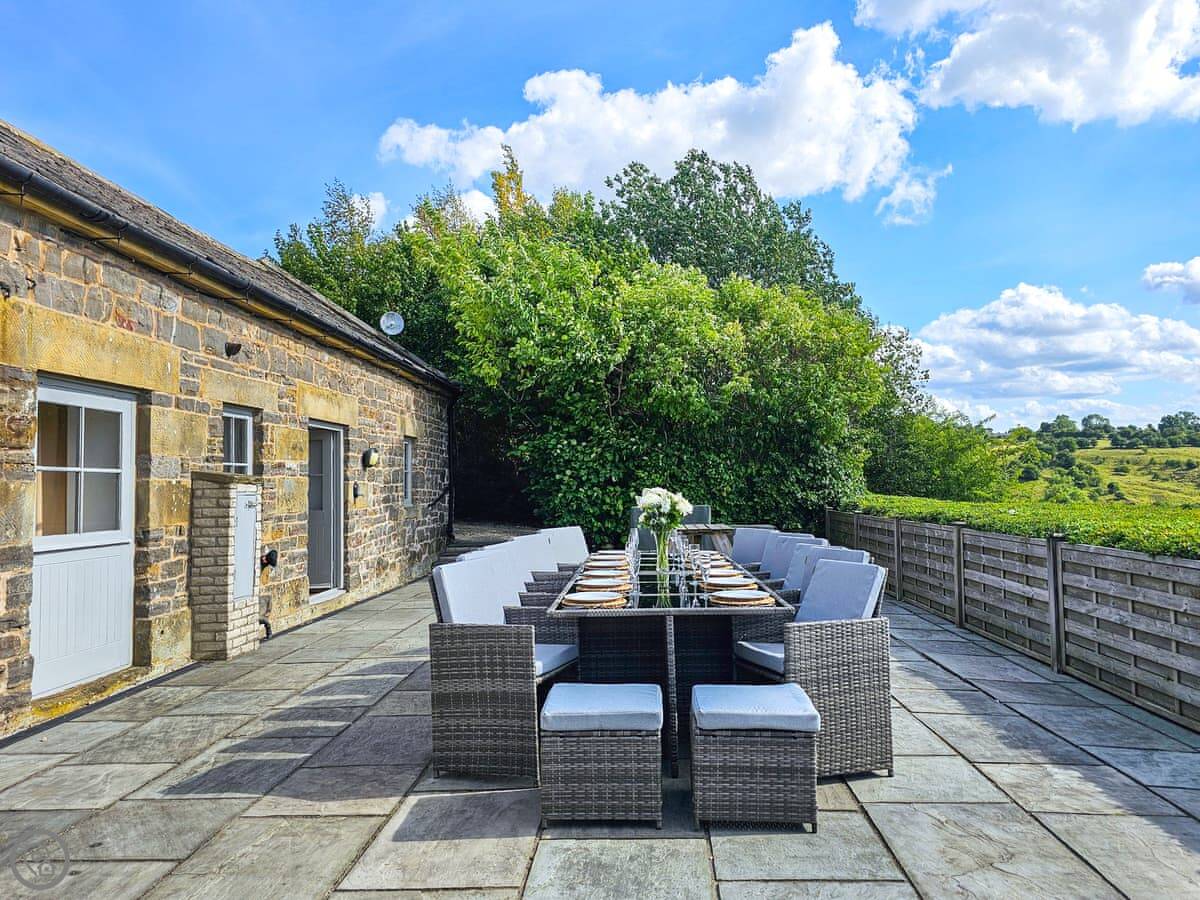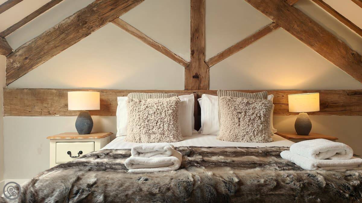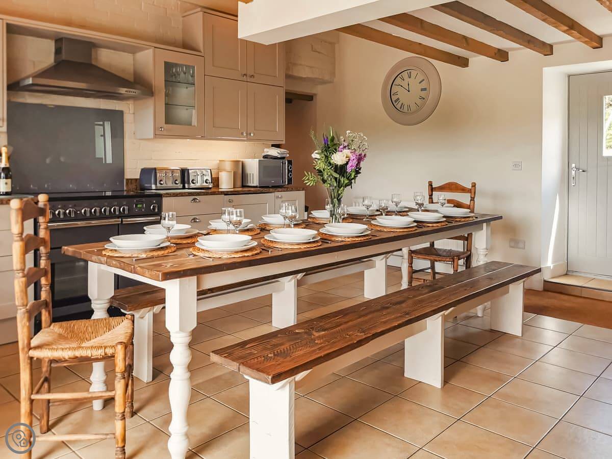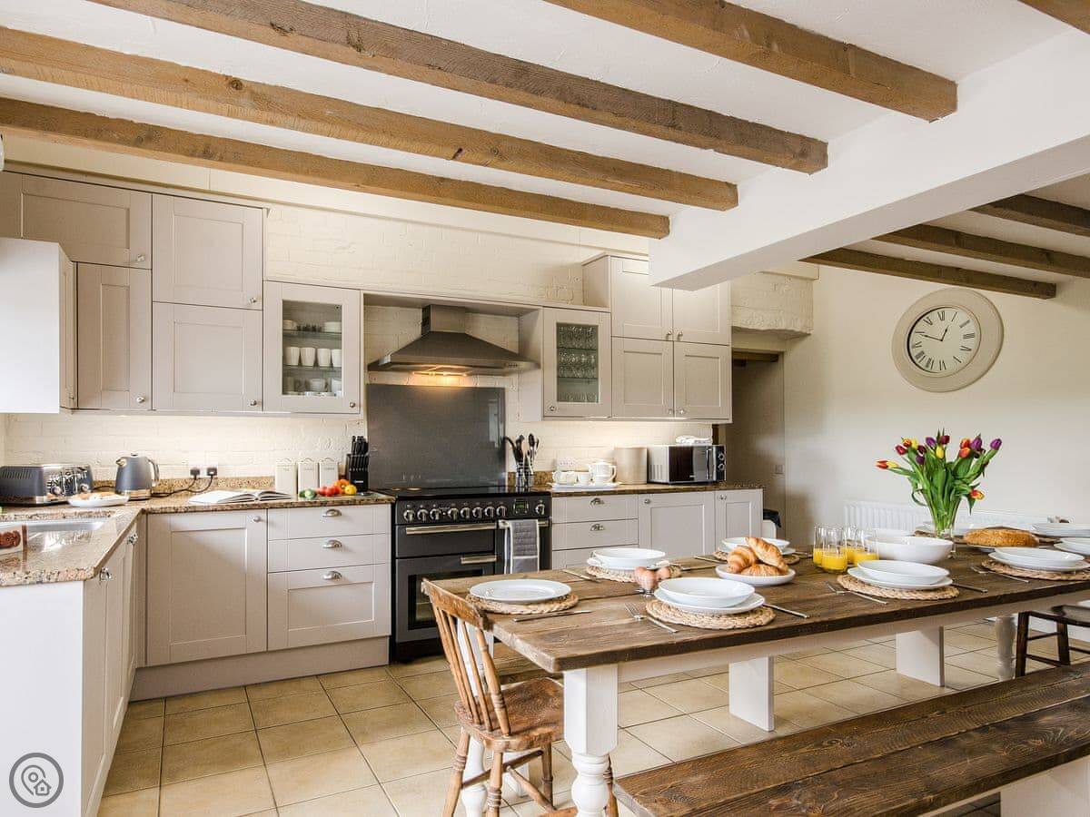It sleeps up to 14 people. There are seven bedrooms and five bathrooms, so it's a big place. It's got a 4 Star rating. It's a converted barn, so you get the oak beams and stone walls. The main living area is open-plan.