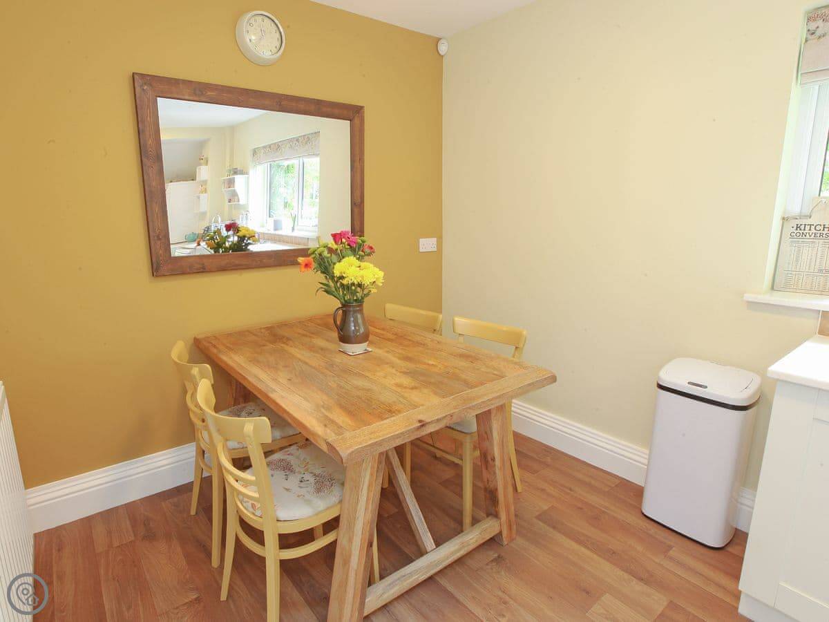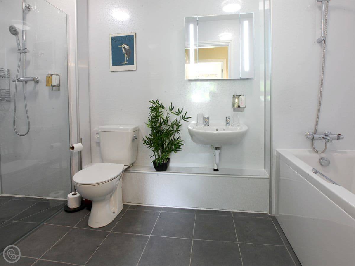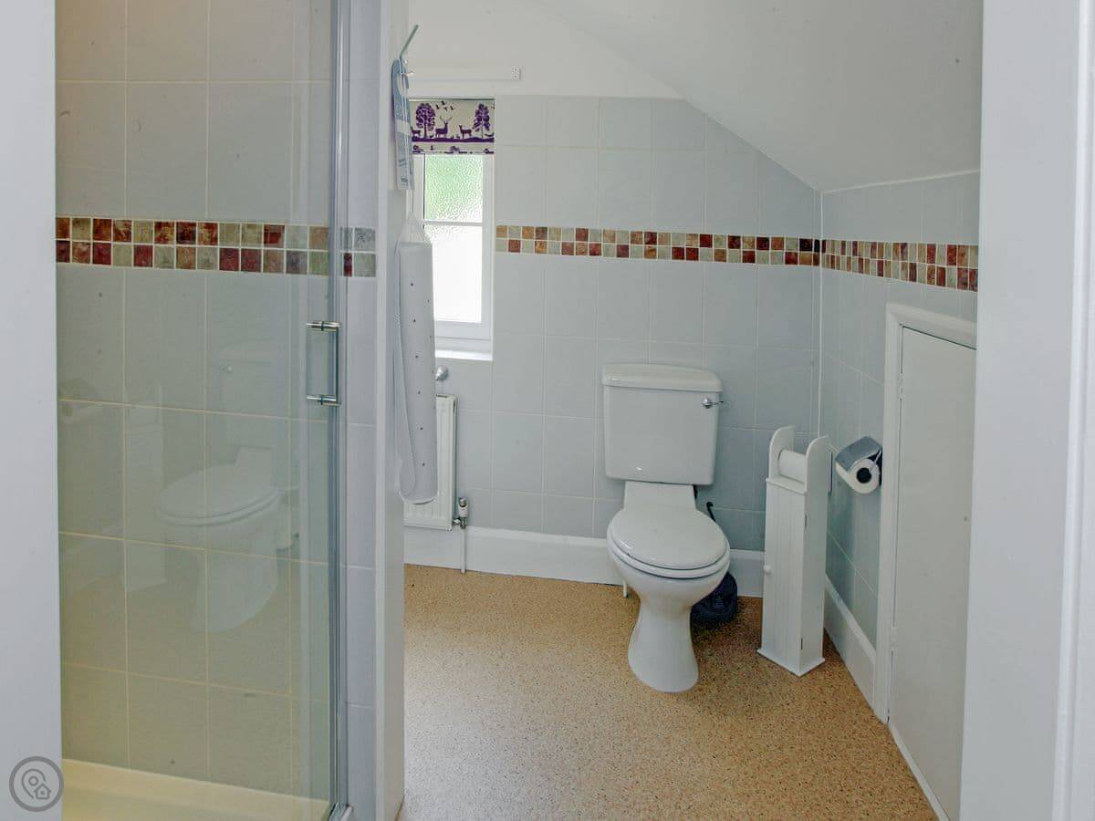 Facilities wise: there's WiFi, a TV, a washing machine, and a dishwasher. Bedding and towels are included. It's set up for families, with a cot, highchair, and stairgate. You can bring up to two dogs. There's a walk-in shower and grab rails in one bathroom.