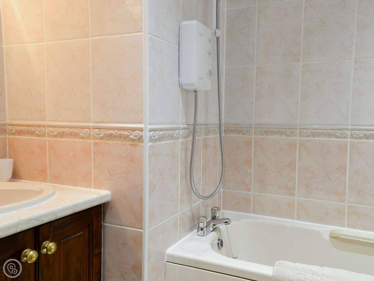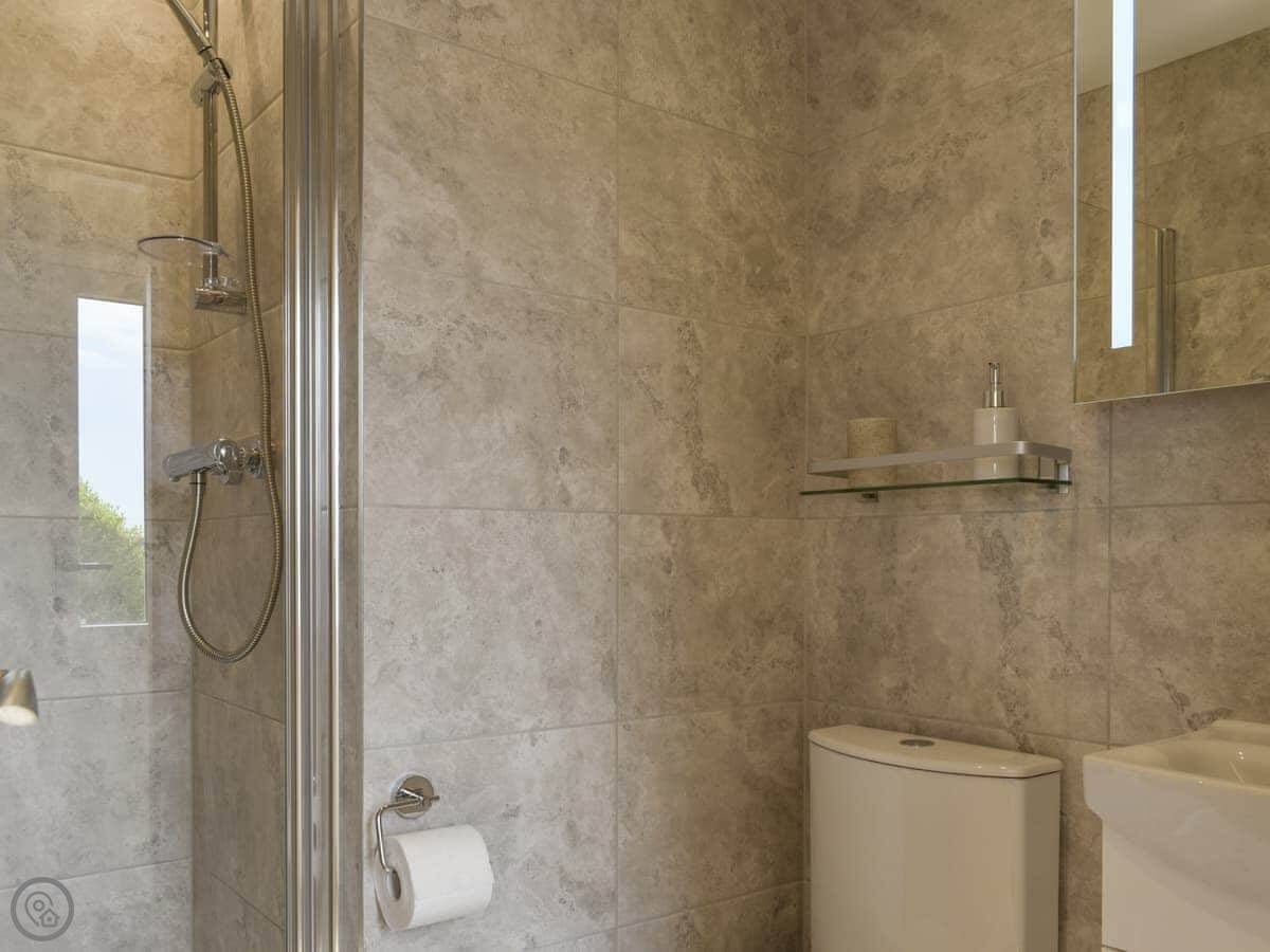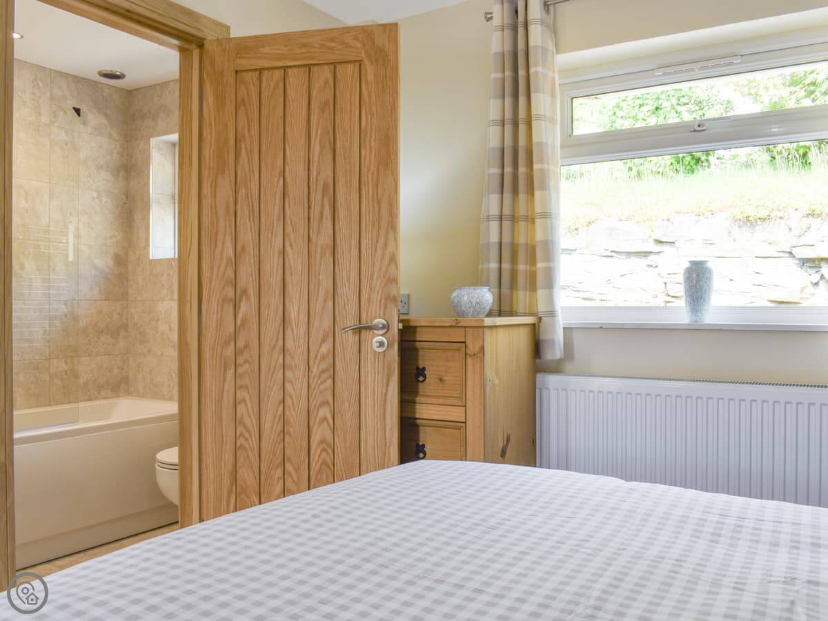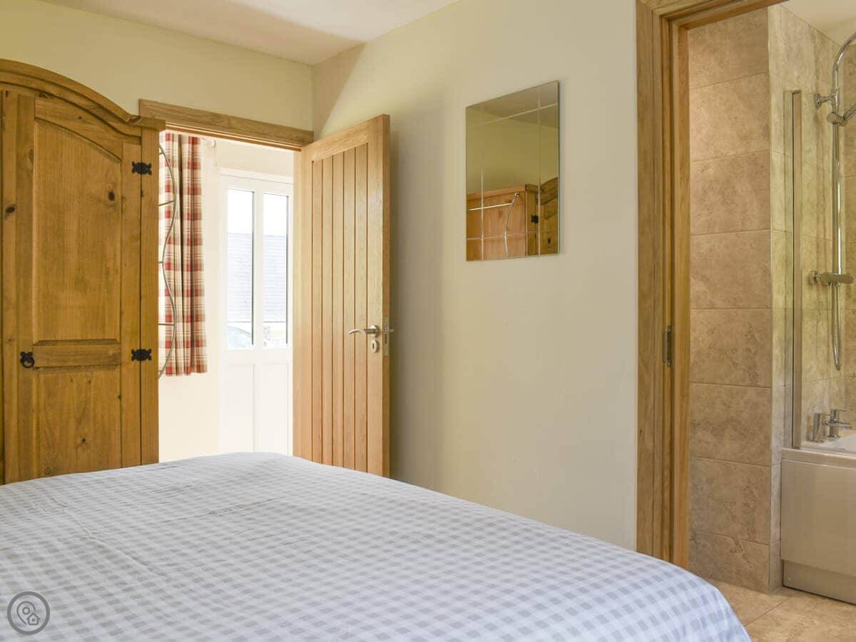 It sleeps four, all on the ground floor. Two bedrooms, both with king-size beds. One has its own bathroom, and there's a second shower room too. So it works for two couples.