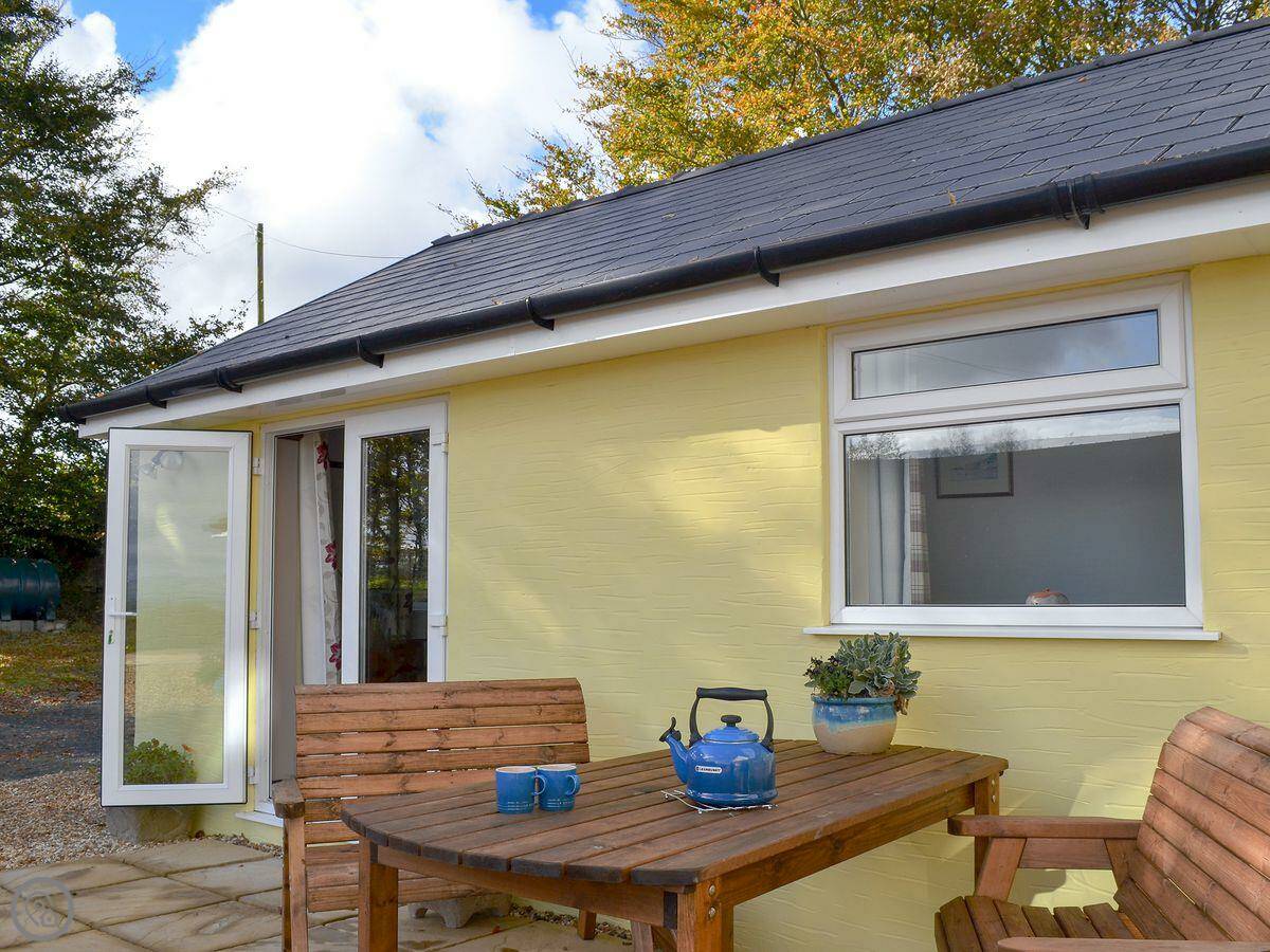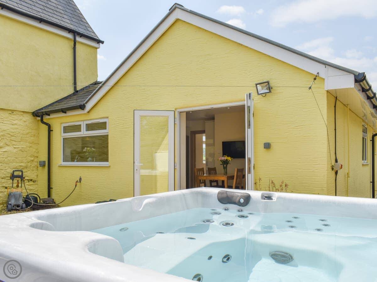 You get a kitchen and dining area with a sofa. The French doors open onto your own patio, which is enclosed. That's where the hot tub is. There's another seating area at the front.