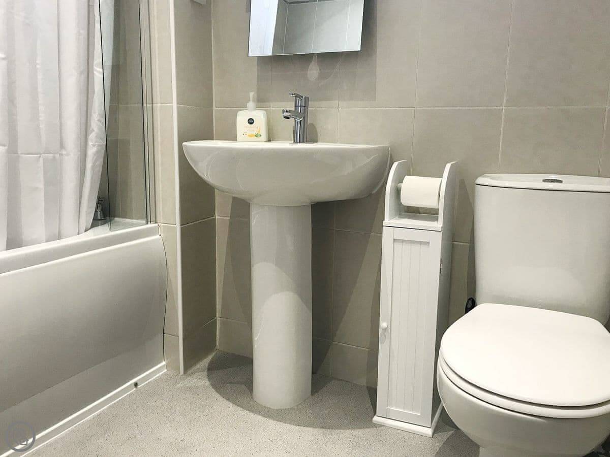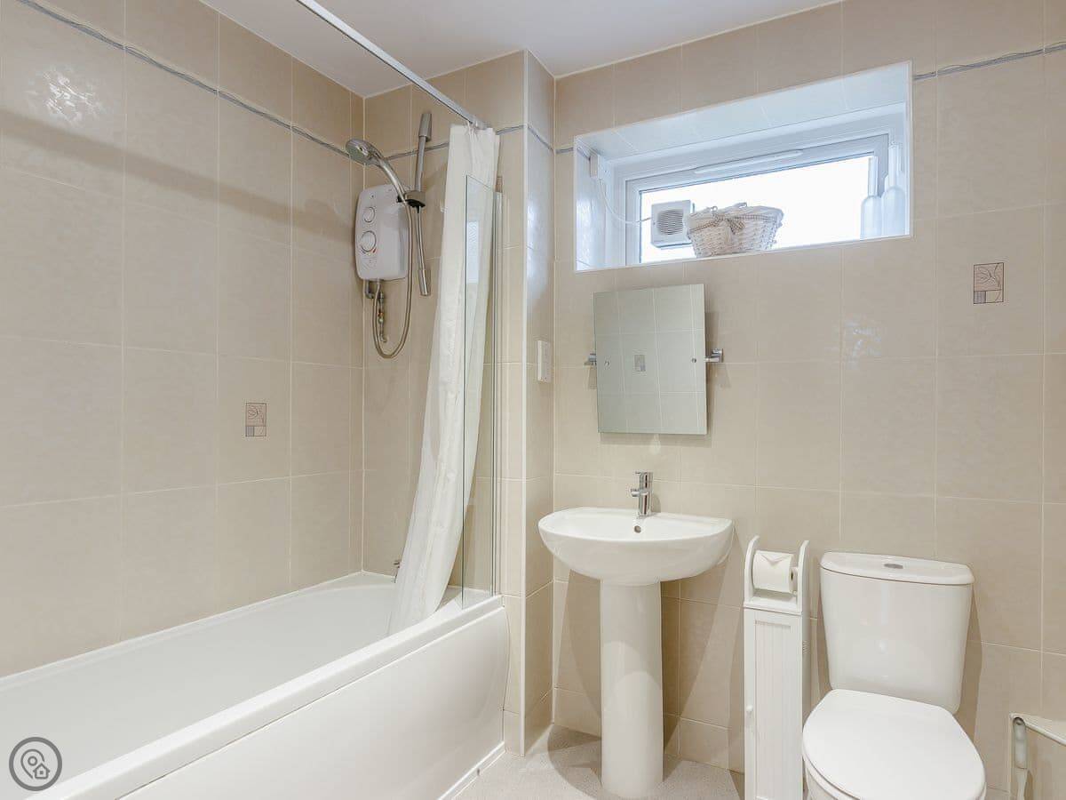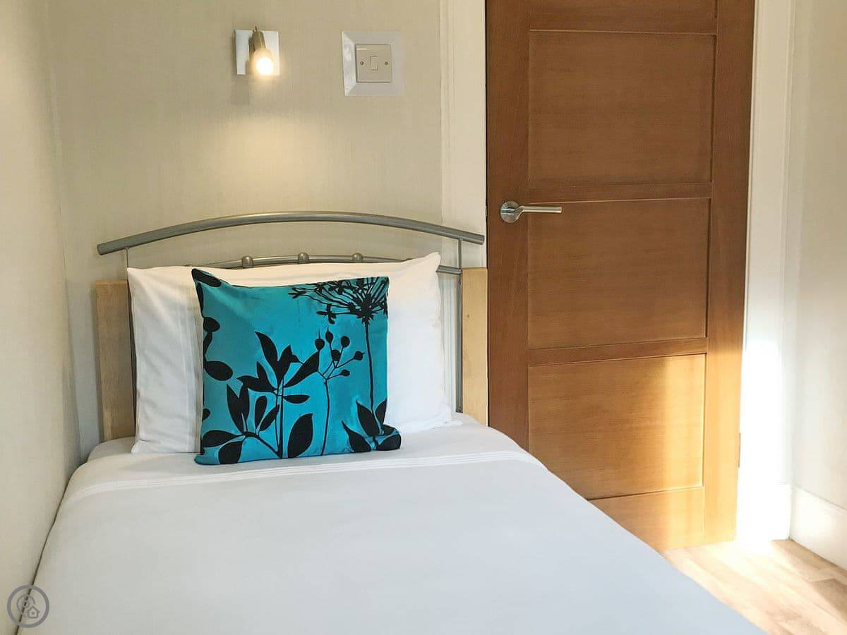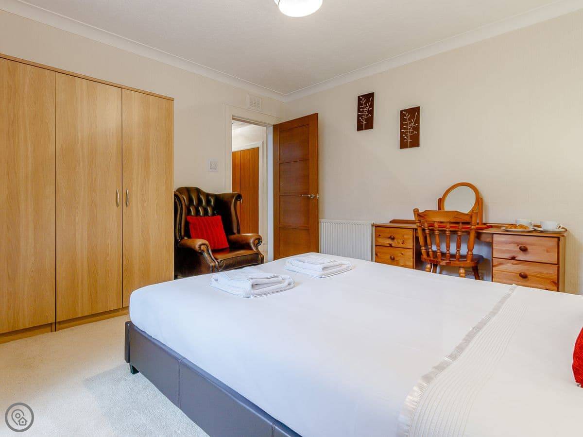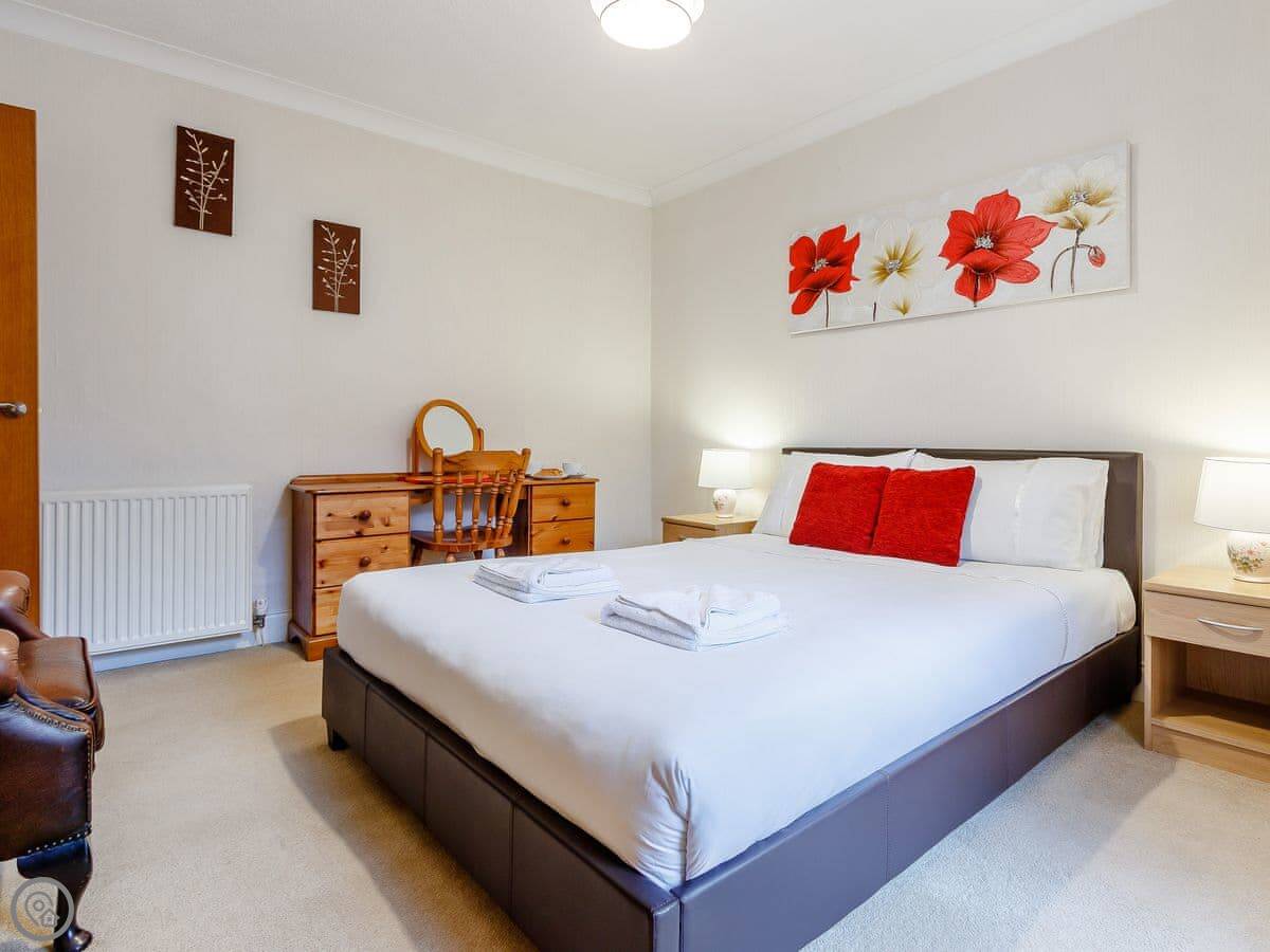 It sleeps five. Three bedrooms – a kingsize, a double, and a single – and one bathroom. The bathroom is a good size. The rating is 4 Star, so it’s comfortable.