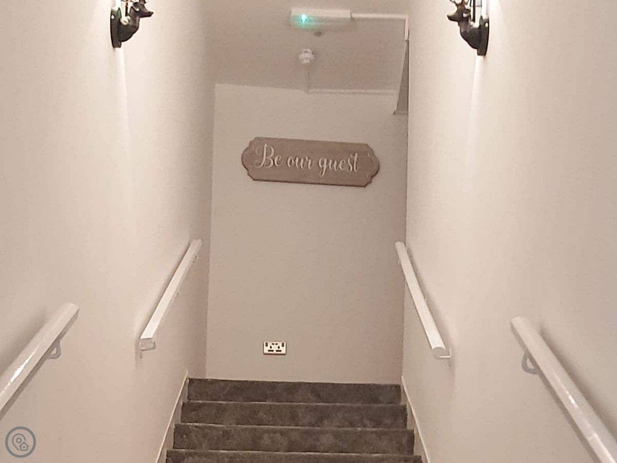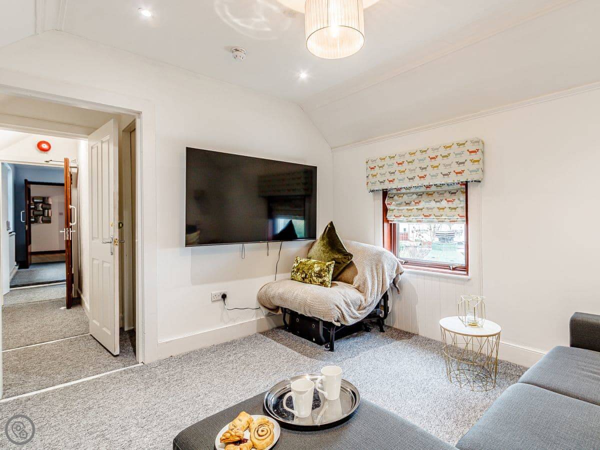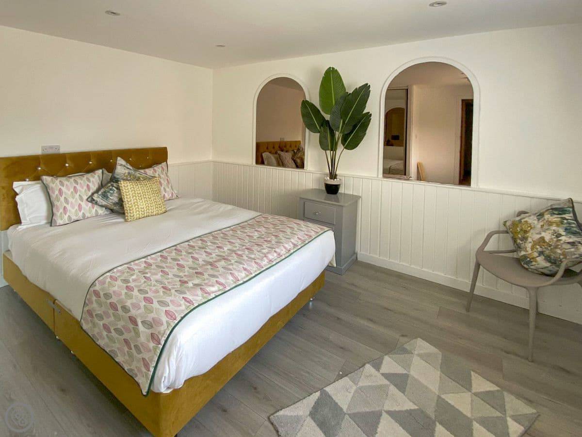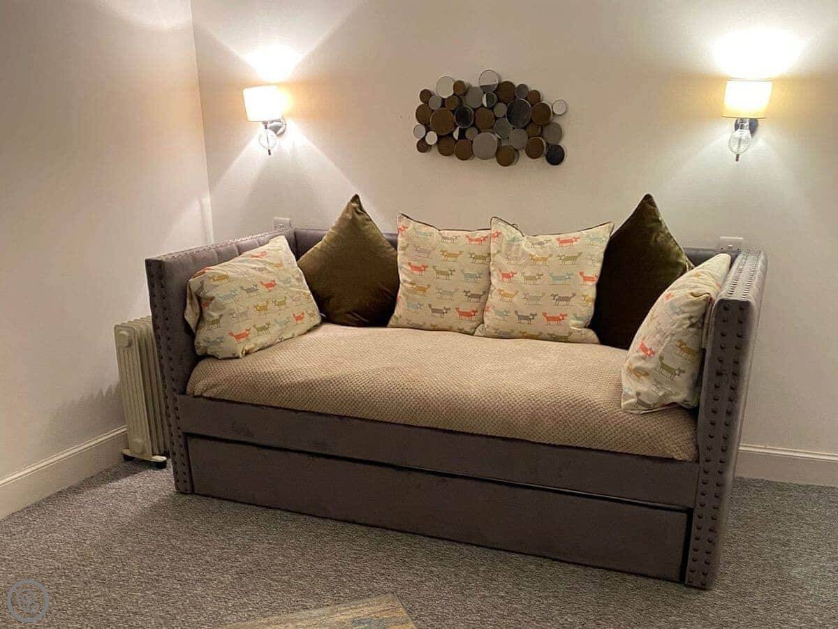 The Golden Crown Suite is in Tarbolton, a village in Ayrshire. It's a different sort of place. It's one big, open-plan suite that sleeps four. There's one main bedroom area and the lounge chairs convert into single beds if you need them.