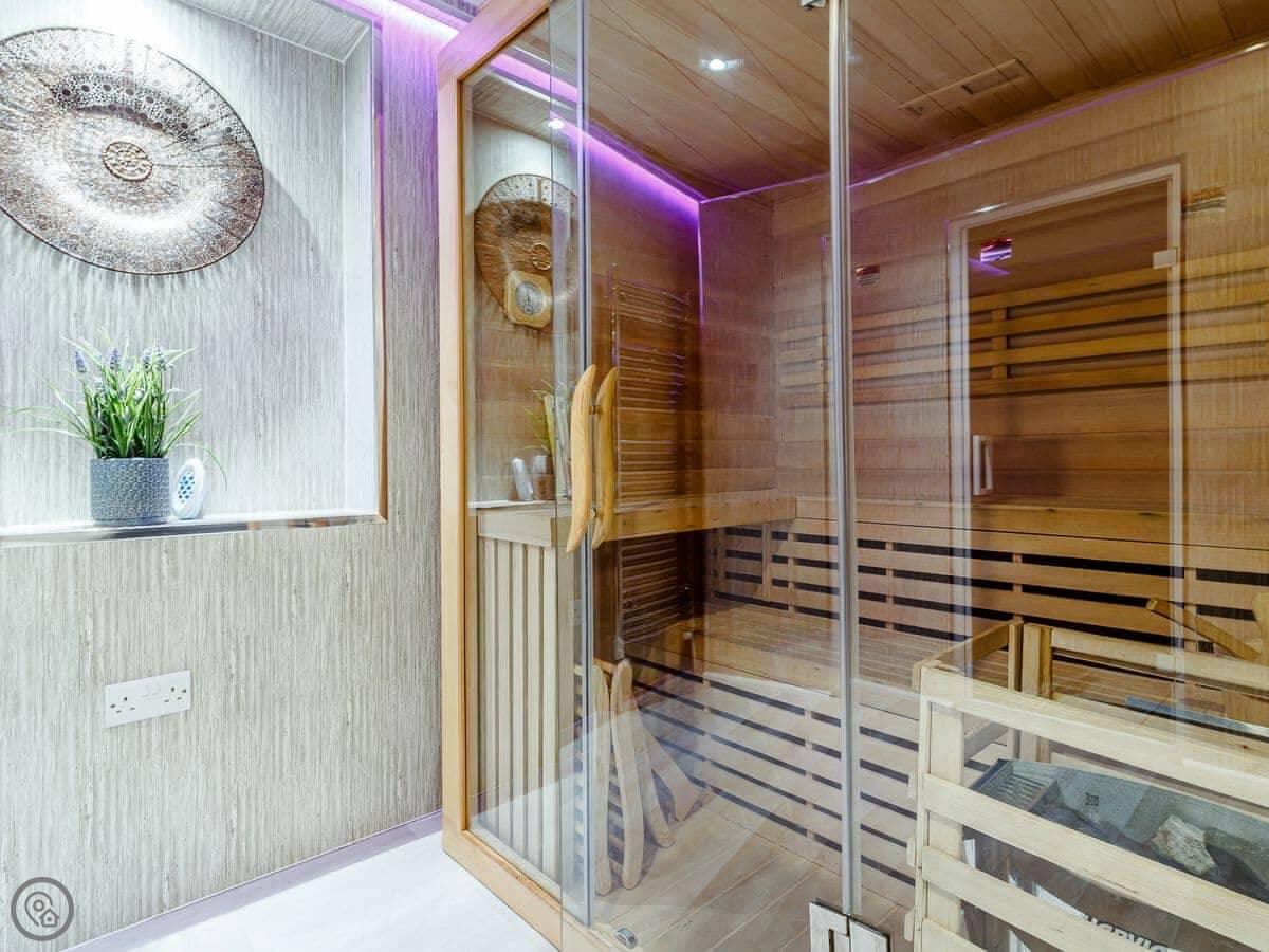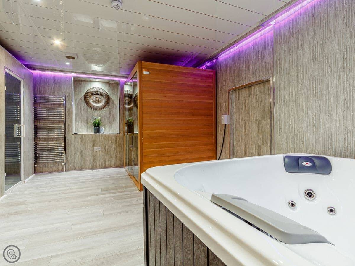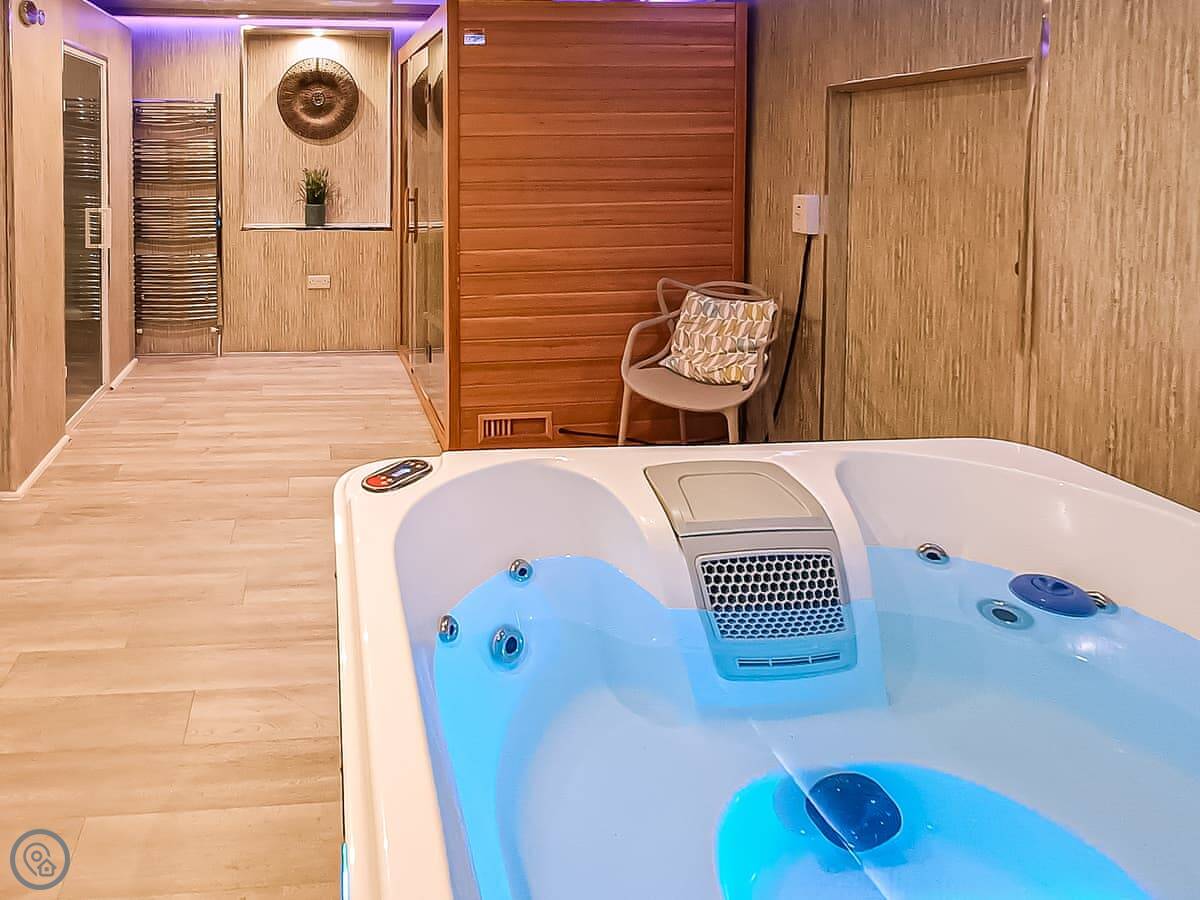 The main thing here is the spa. It's yours, private. It has a hot tub, a sauna, and a steam room. Robes are provided. You also get an 85-minute treatment each in the on-site treatment room, which is just next to the suite. There's a selection of ESPA products to use while you're staying.