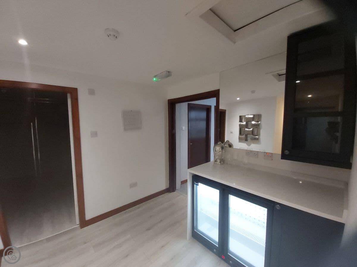 Inside, it's all one space. The bedroom area has a large TV. There's a small kitchen with a dishwasher, and a little cocktail bar area. The decor is quite bold, with a lot of black and gold and green.