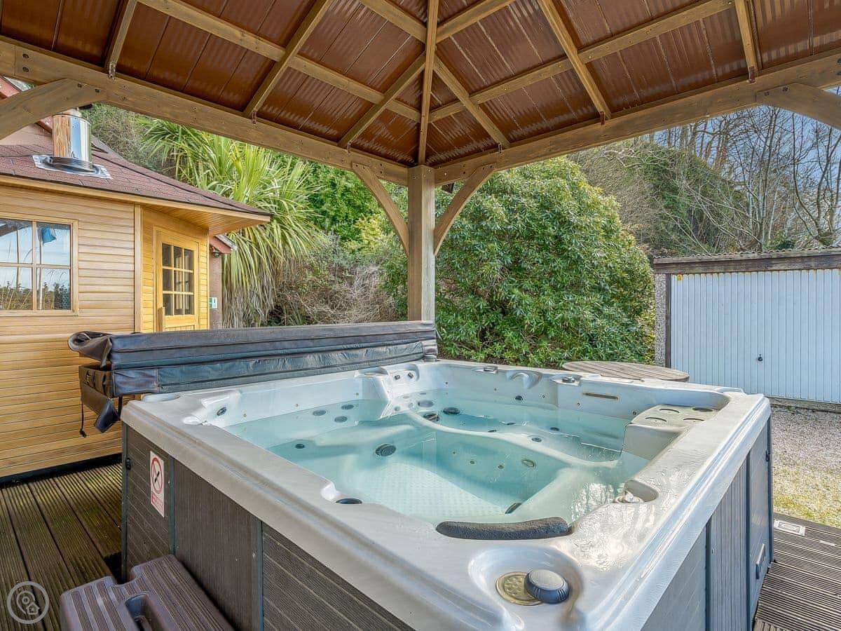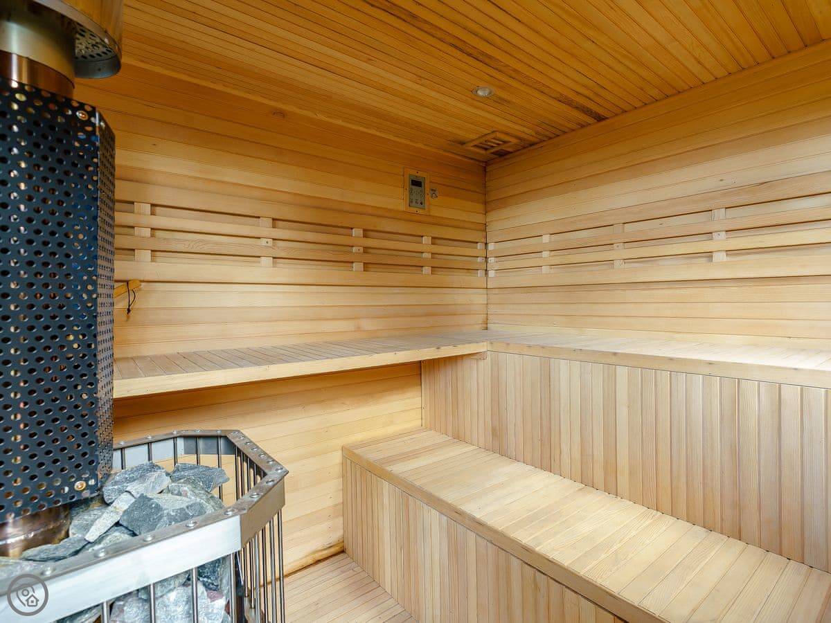 For the facilities, it has two private hot tubs, each fitting six people. There's also a wood-burning sauna, an infra-red sauna, and a steam room. They're all there for you to use.