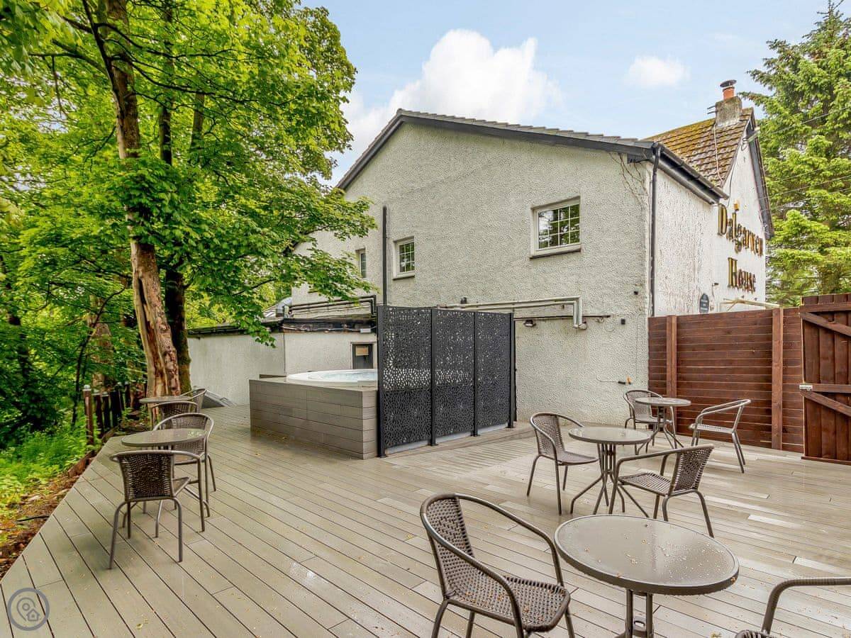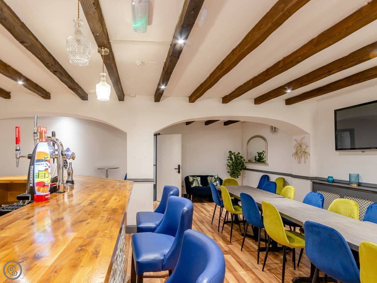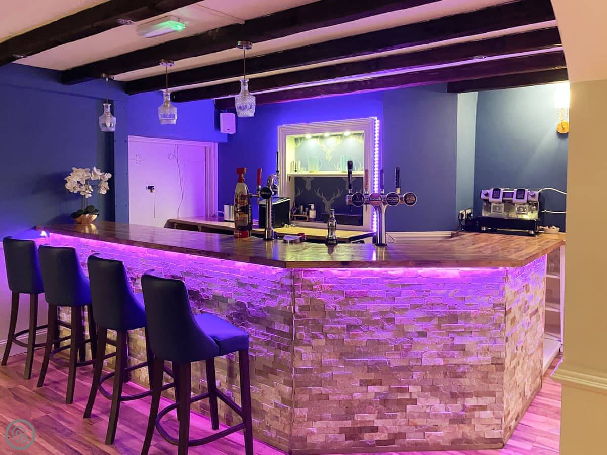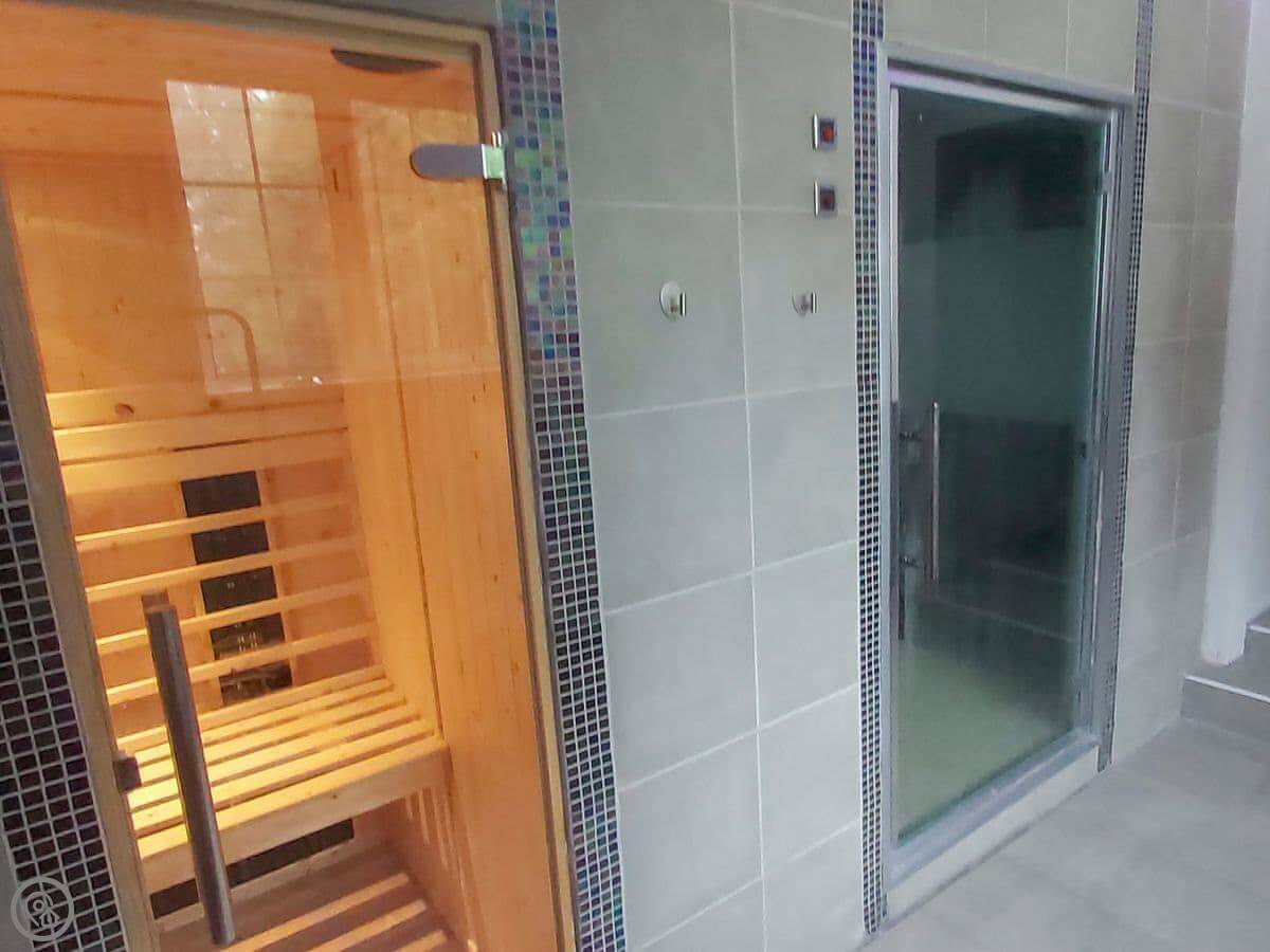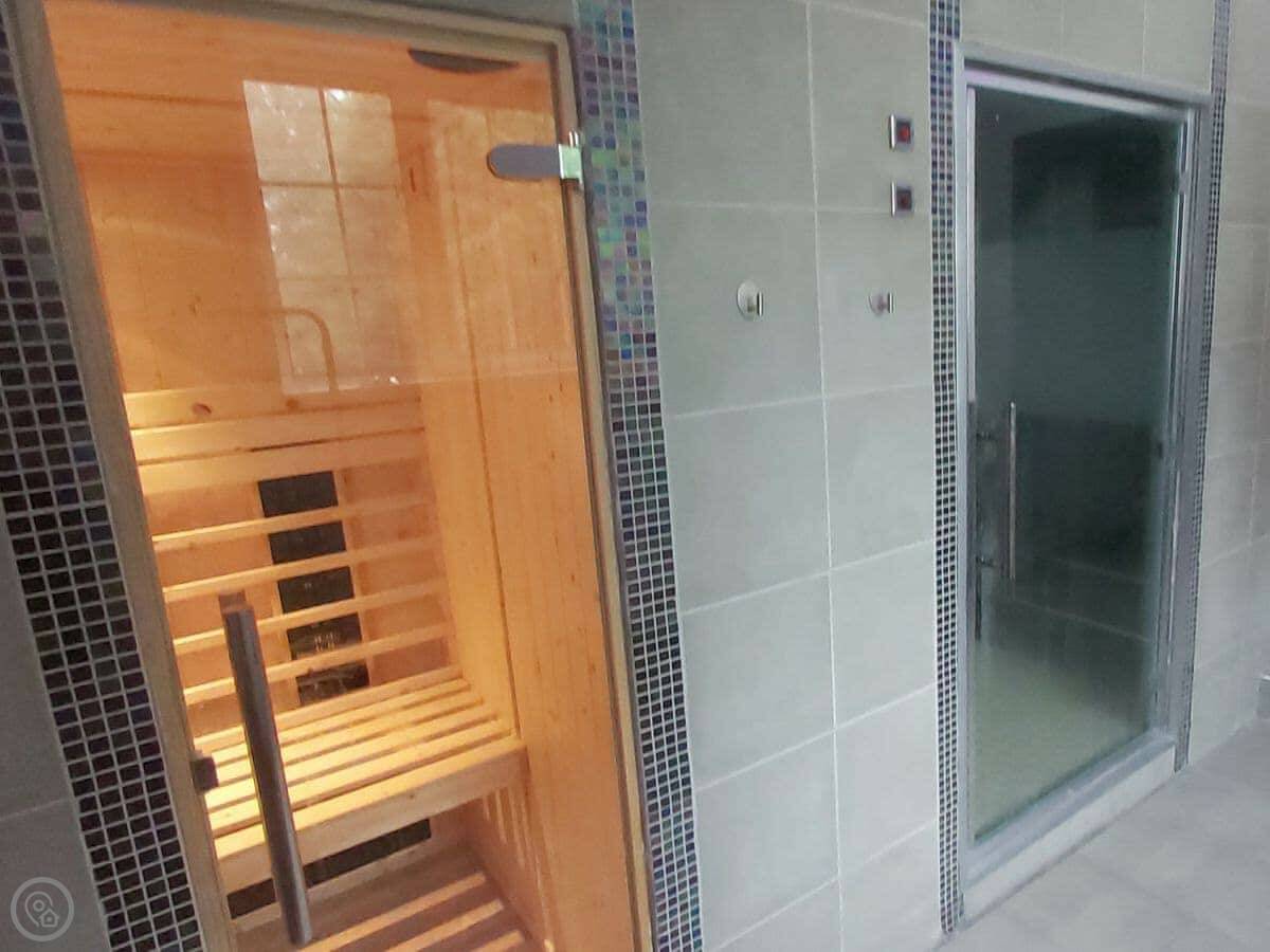 It has nine bedrooms and each one has its own bathroom. It's rated 4 Star. It's set up for parties and gatherings. There's a private bar, a function room, and a games room. The main draw is the spa part: there's an outdoor commercial hot tub that fits ten people, and an indoor thermal suite with a sauna and steam room, just for your group. The hot tub area is fenced off for privacy.