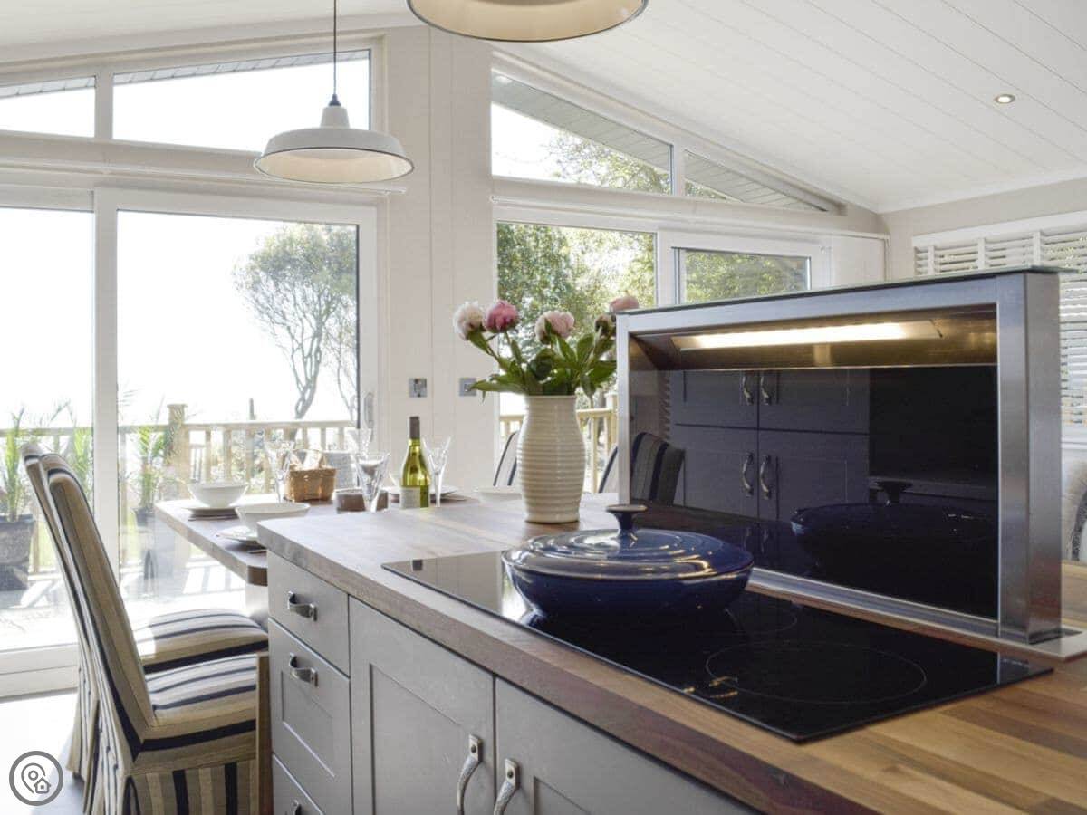 The living area is open plan with big windows that open onto a deck. The deck is enclosed, which is good if you have dogs or children. It looks straight out to sea. You can sit out there with a coffee or something in the evening.