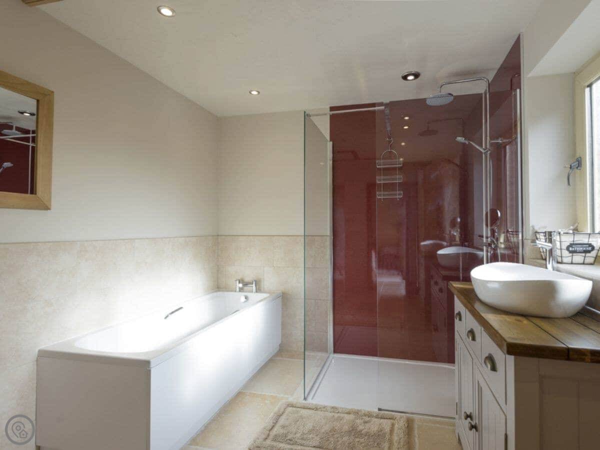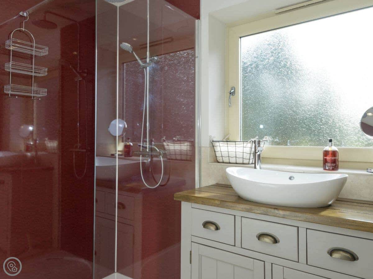It's got a wood burner in the living area. The kitchen is open plan. The bedroom is on the ground floor with a shower room ensuite. The shower is a walk-in one.