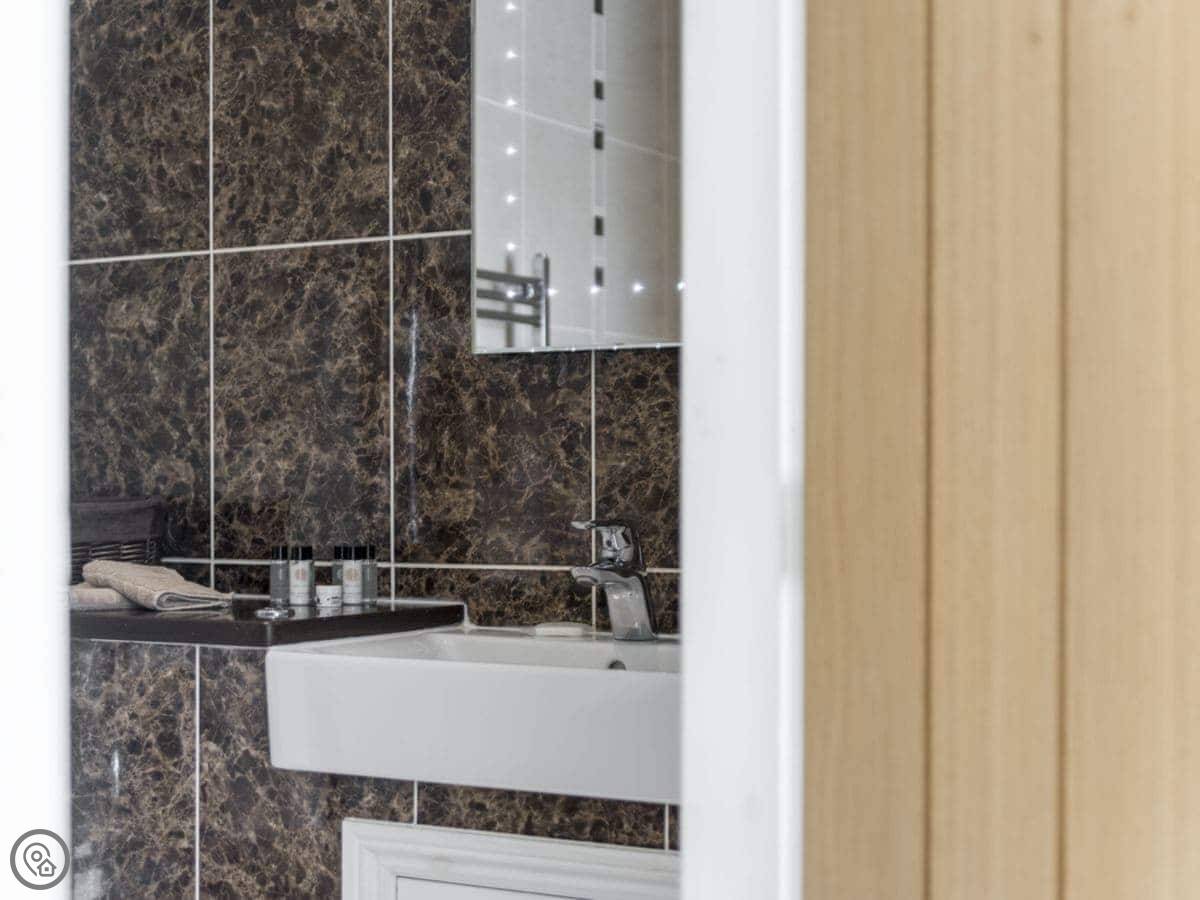 Inside, it's all on one level once you're up the stairs. The main room is open plan. Wood burner, TV, kitchen area. There's WiFi. The bedroom is up a small flight of stairs from the living area, which is a bit different. It's a good size with a big shower room attached.