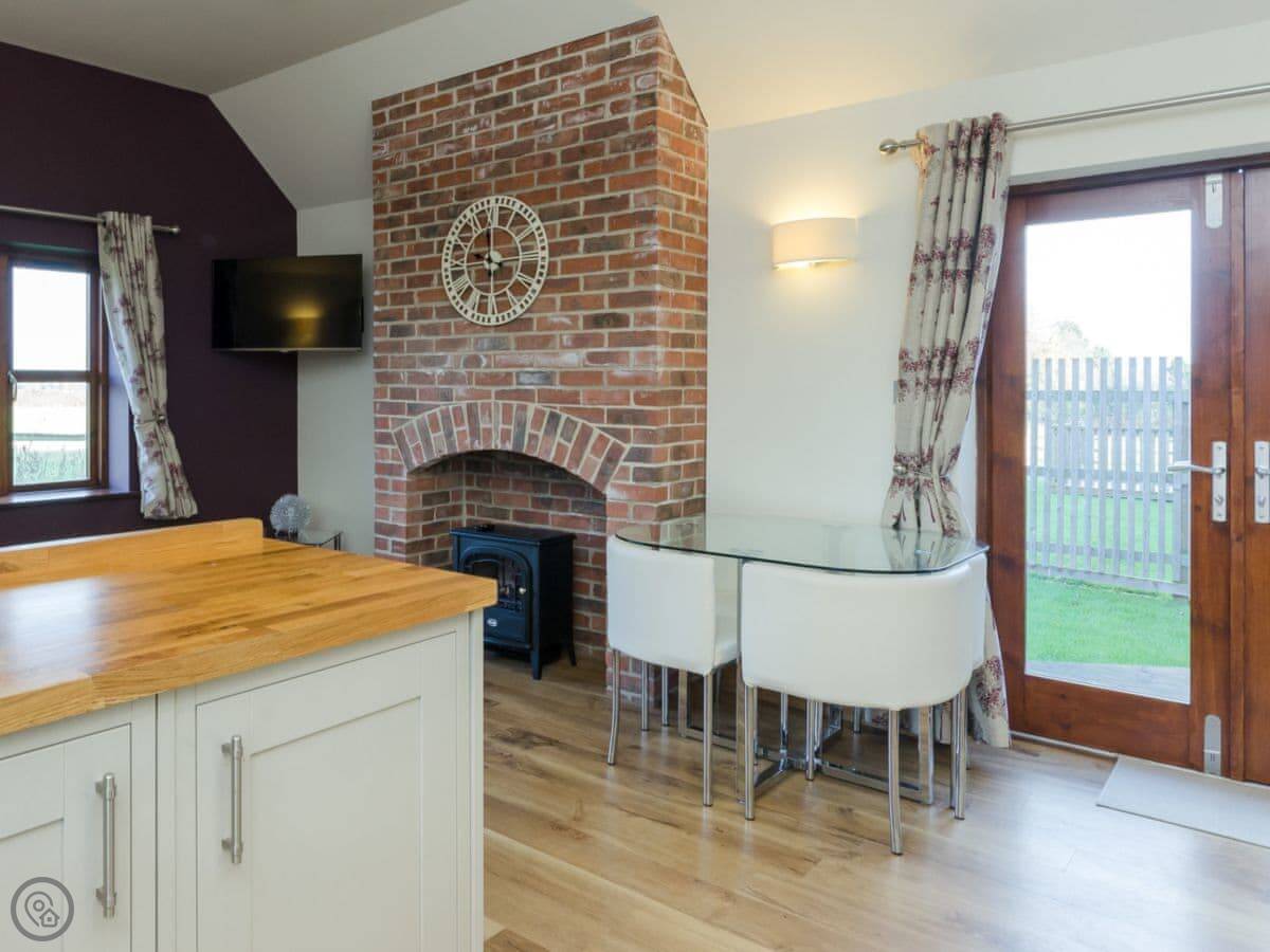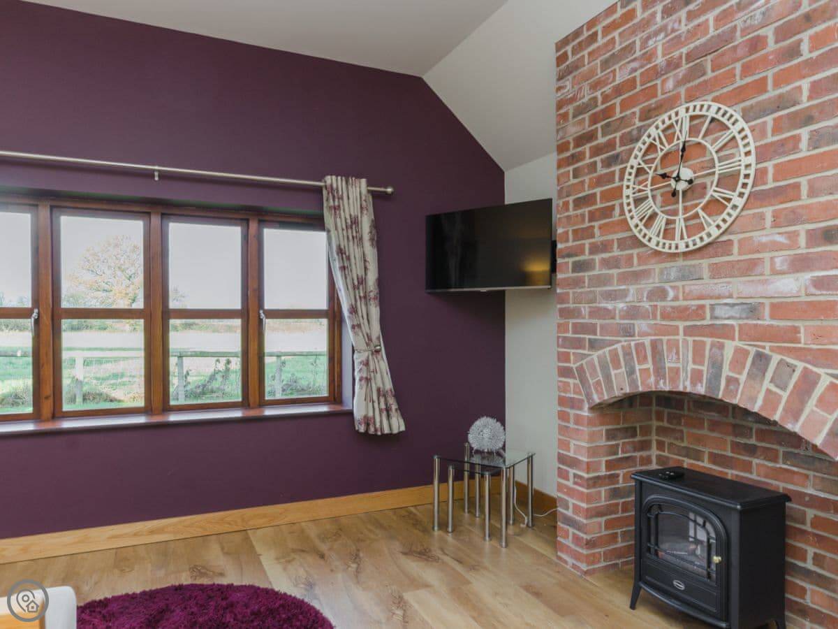 Saddleback Cottage is near a village called Hadley End, up in Staffordshire. It's one of three cottages around a shared courtyard. Yours is the end one. You get your own garden, which looks out onto fields.