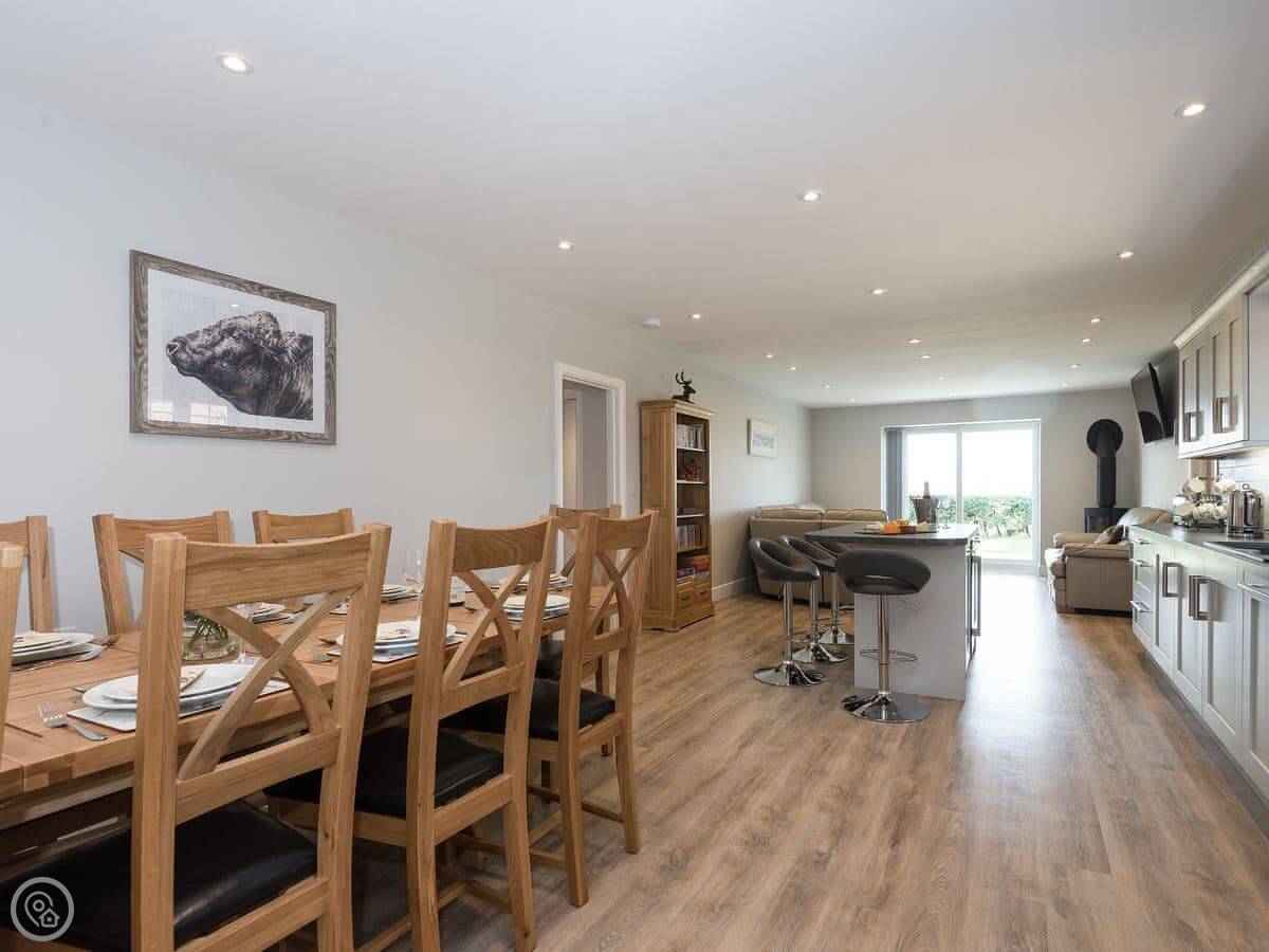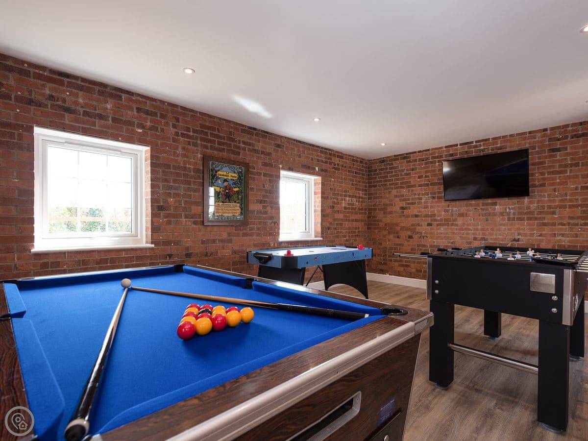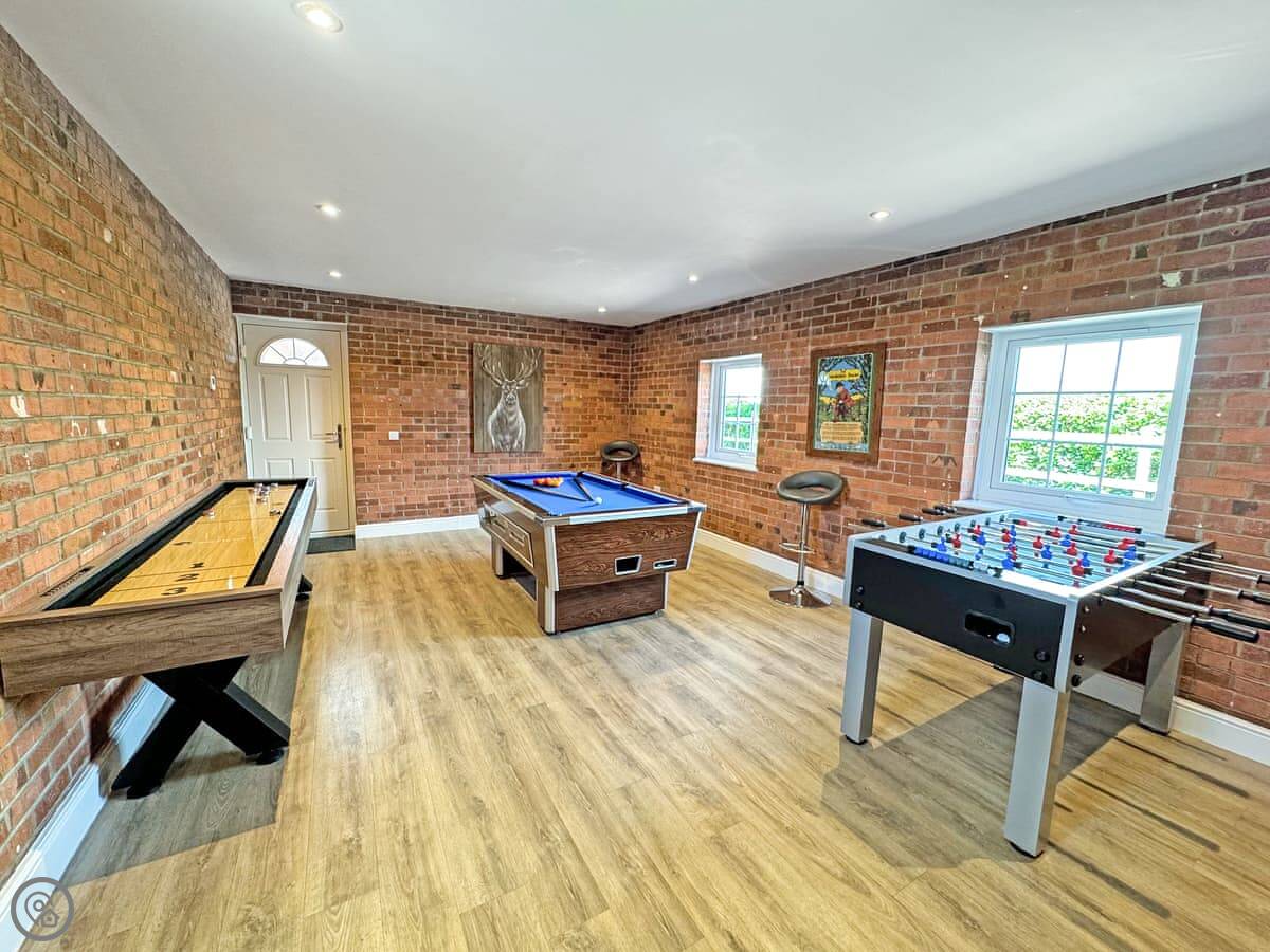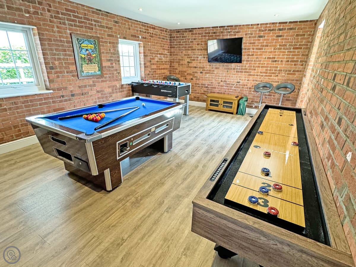 Inside, it's open plan. There's a wood burner for cooler evenings. There's a games room upstairs with a pool table and things to keep people entertained. It's got all the stuff you'd expect: WiFi, TV, washing machine, dishwasher. Bedding and towels are included. There's parking on the drive.