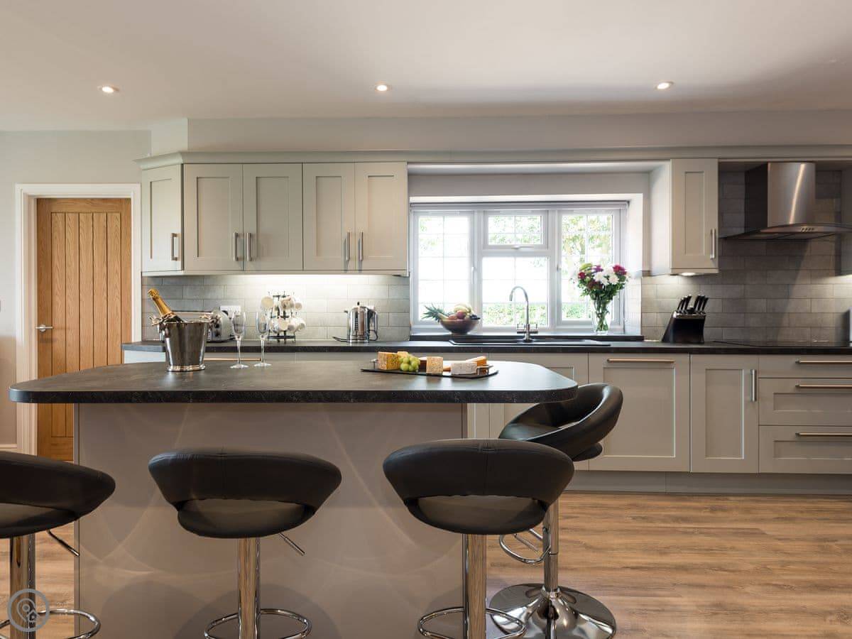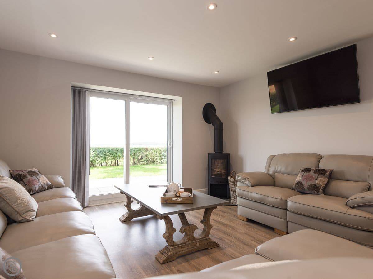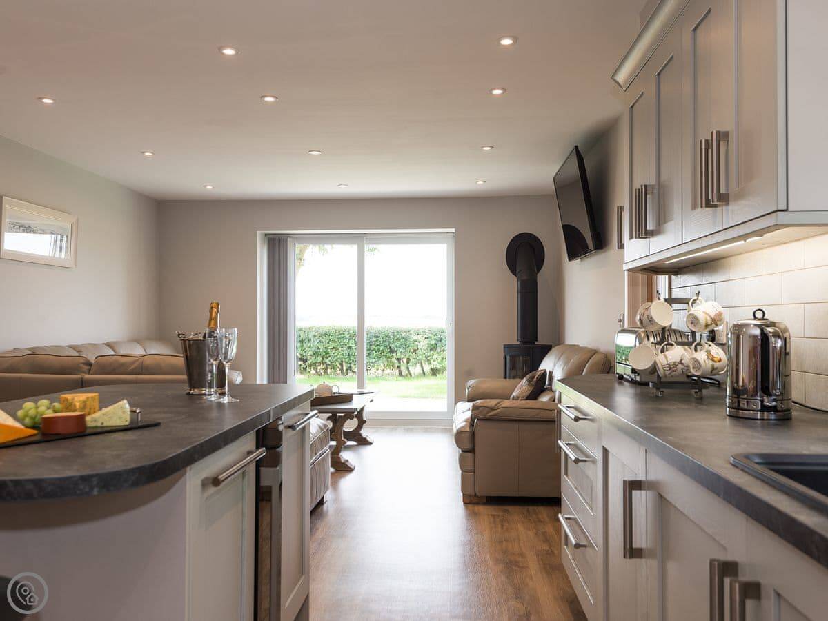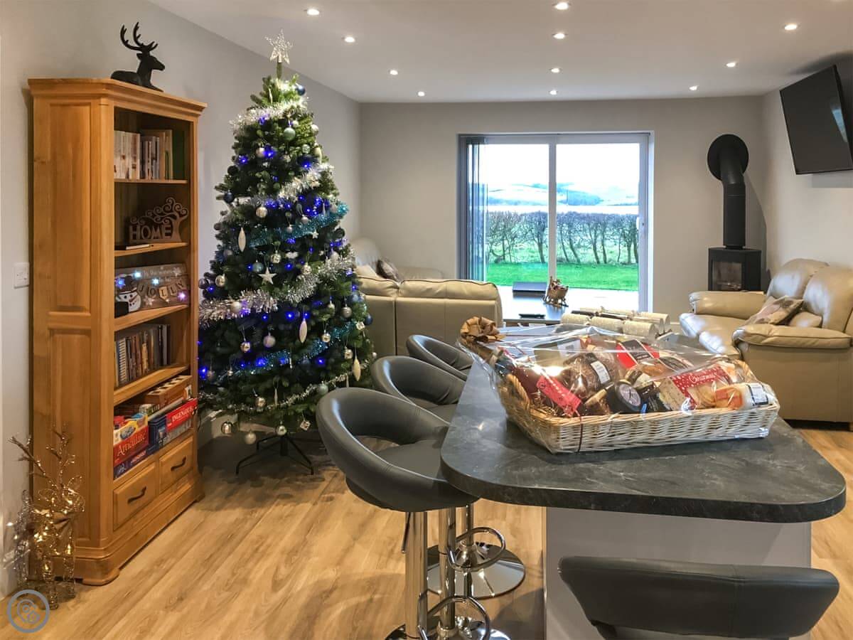 Inside, it's open plan. There's a wood burner for cooler evenings. There's a games room upstairs with a pool table and things to keep people entertained. It's got all the stuff you'd expect: WiFi, TV, washing machine, dishwasher. Bedding and towels are included. There's parking on the drive.