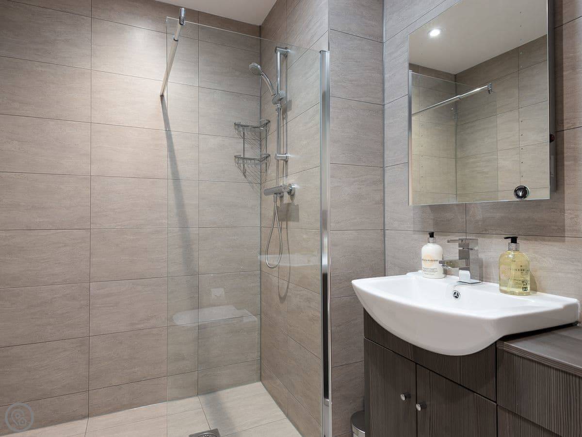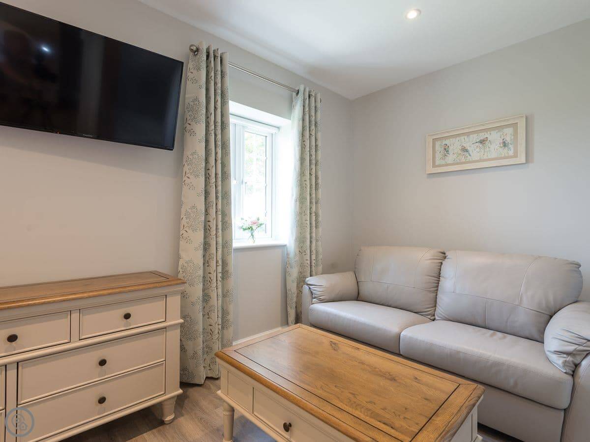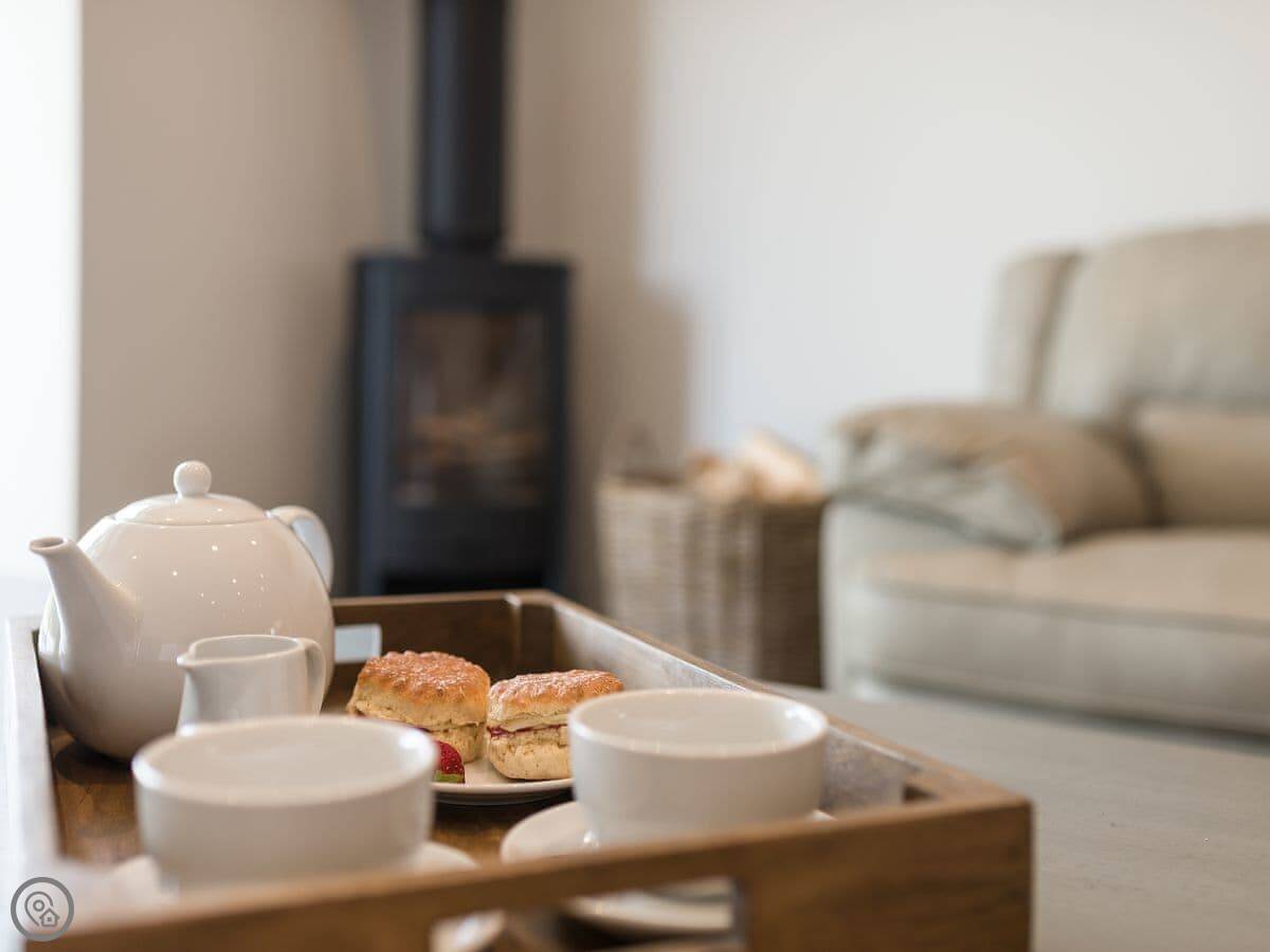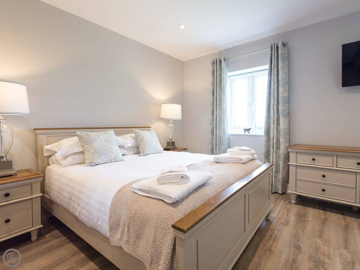 Inside, it's open plan. There's a wood burner for cooler evenings. There's a games room upstairs with a pool table and things to keep people entertained. It's got all the stuff you'd expect: WiFi, TV, washing machine, dishwasher. Bedding and towels are included. There's parking on the drive.