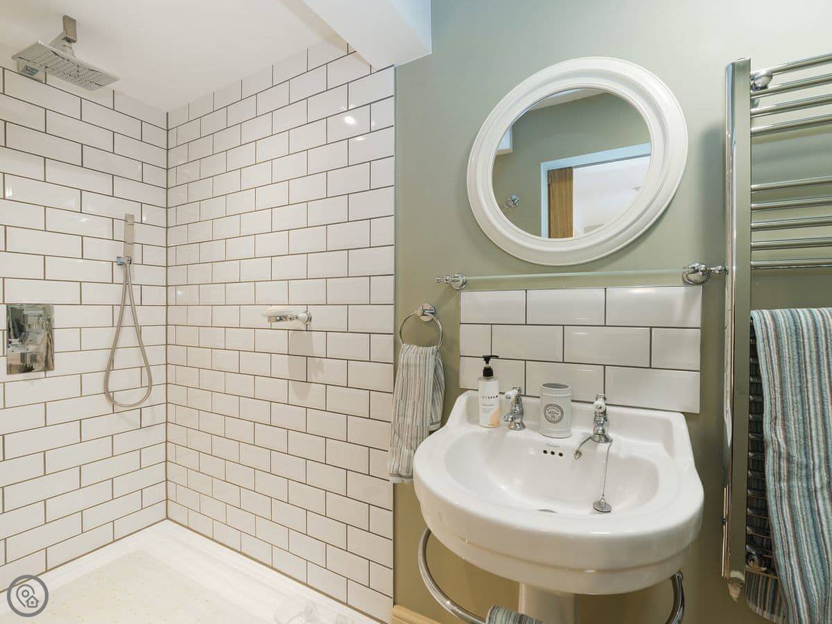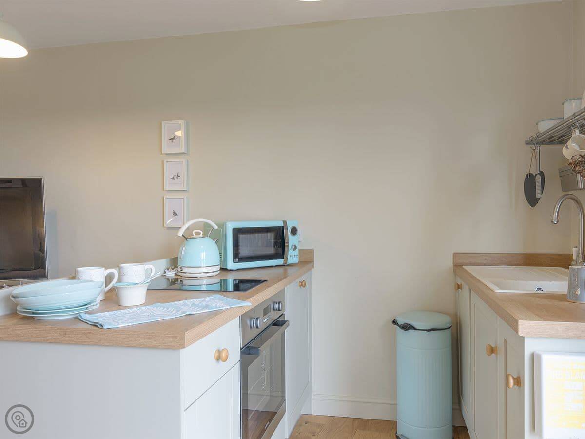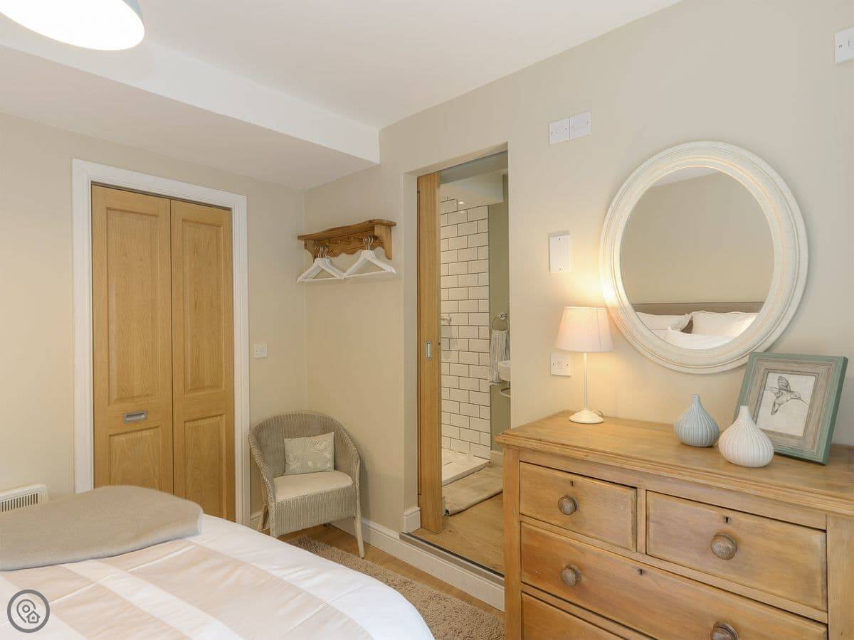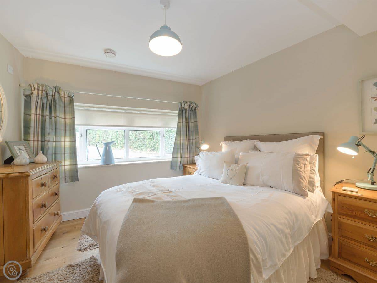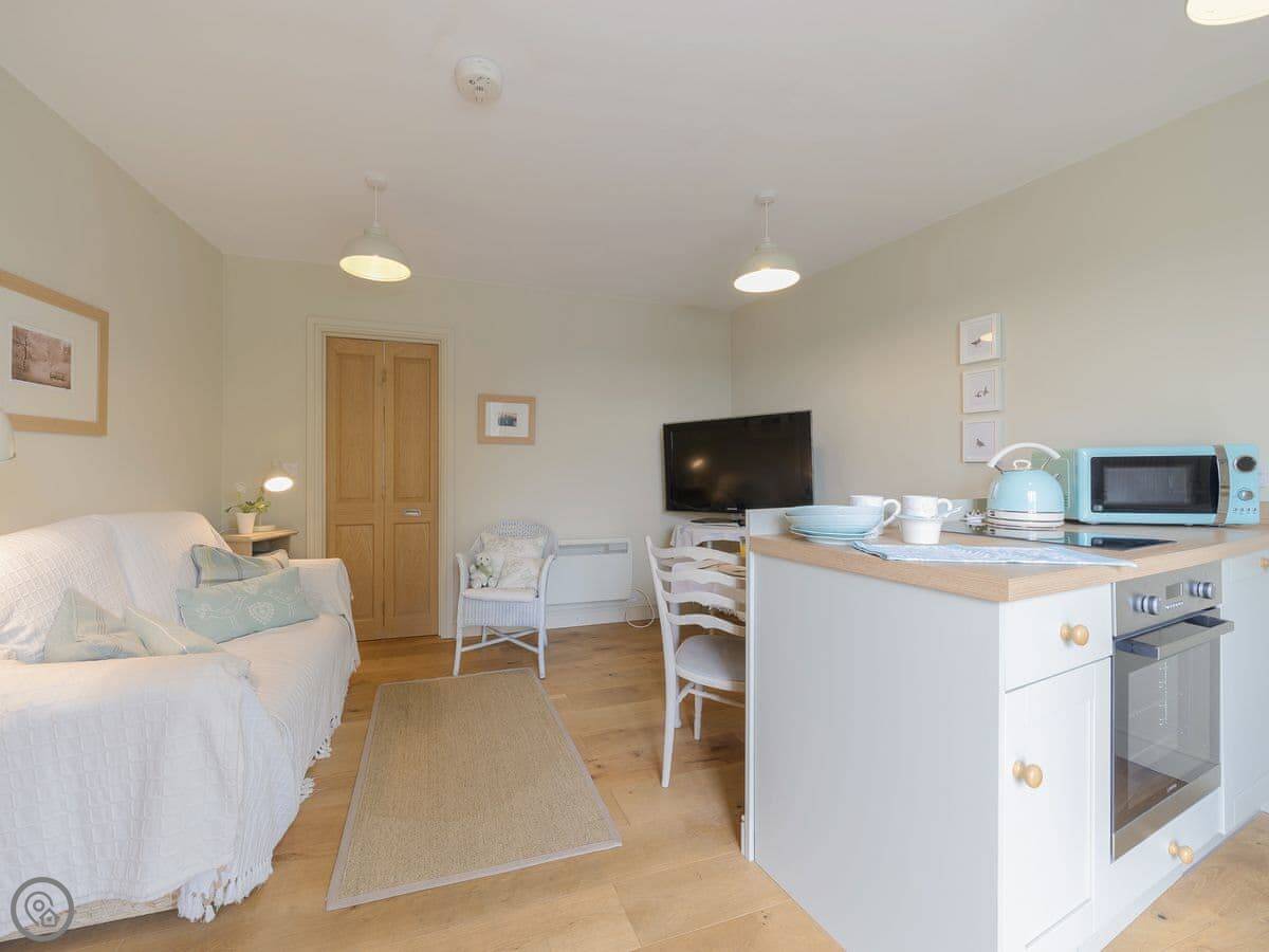 It's all on one level. One bedroom, one bathroom with a walk-in shower. The bed is a double. The kitchen and sitting area are open plan. There's a TV and WiFi. There's a dishwasher and a washing machine. Parking is right outside.