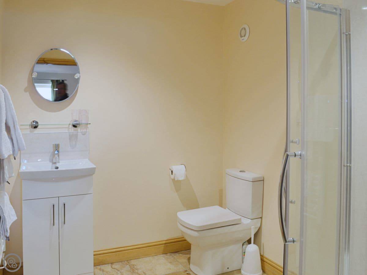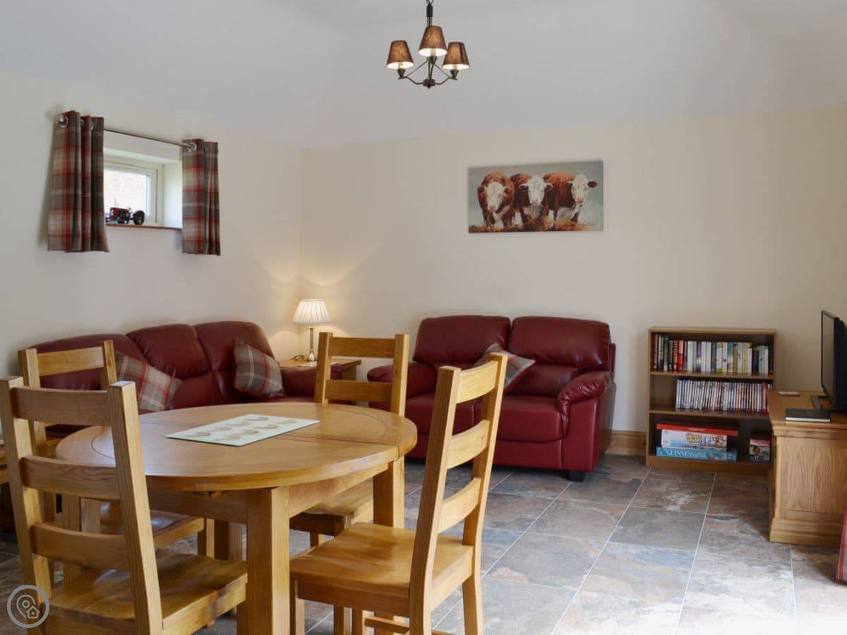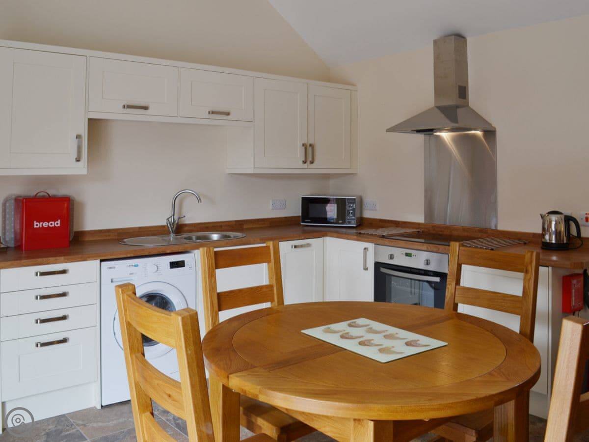 Inside, it's all open plan downstairs. Kitchen, dining area, and sitting area in one room. It has a TV, WiFi, a washing machine, and a dishwasher. We include all bedding and towels. We can provide a cot and a highchair.