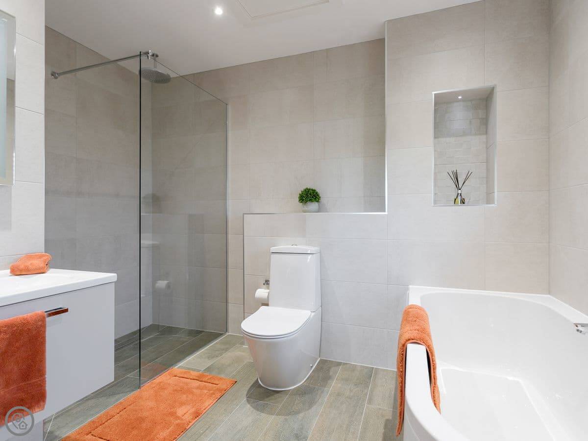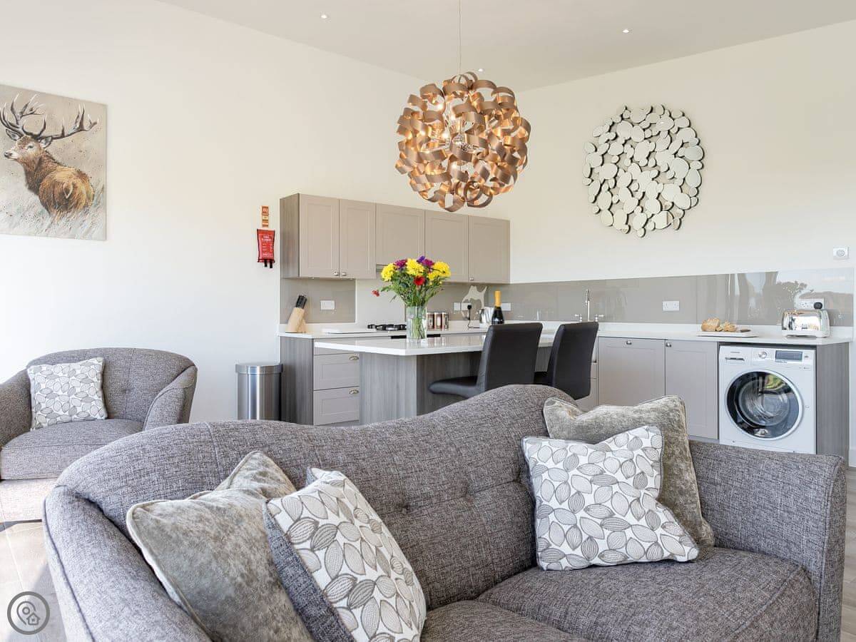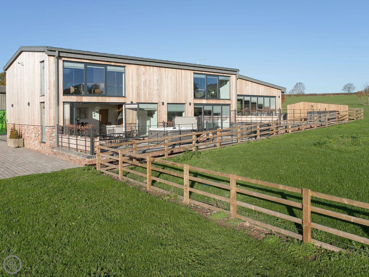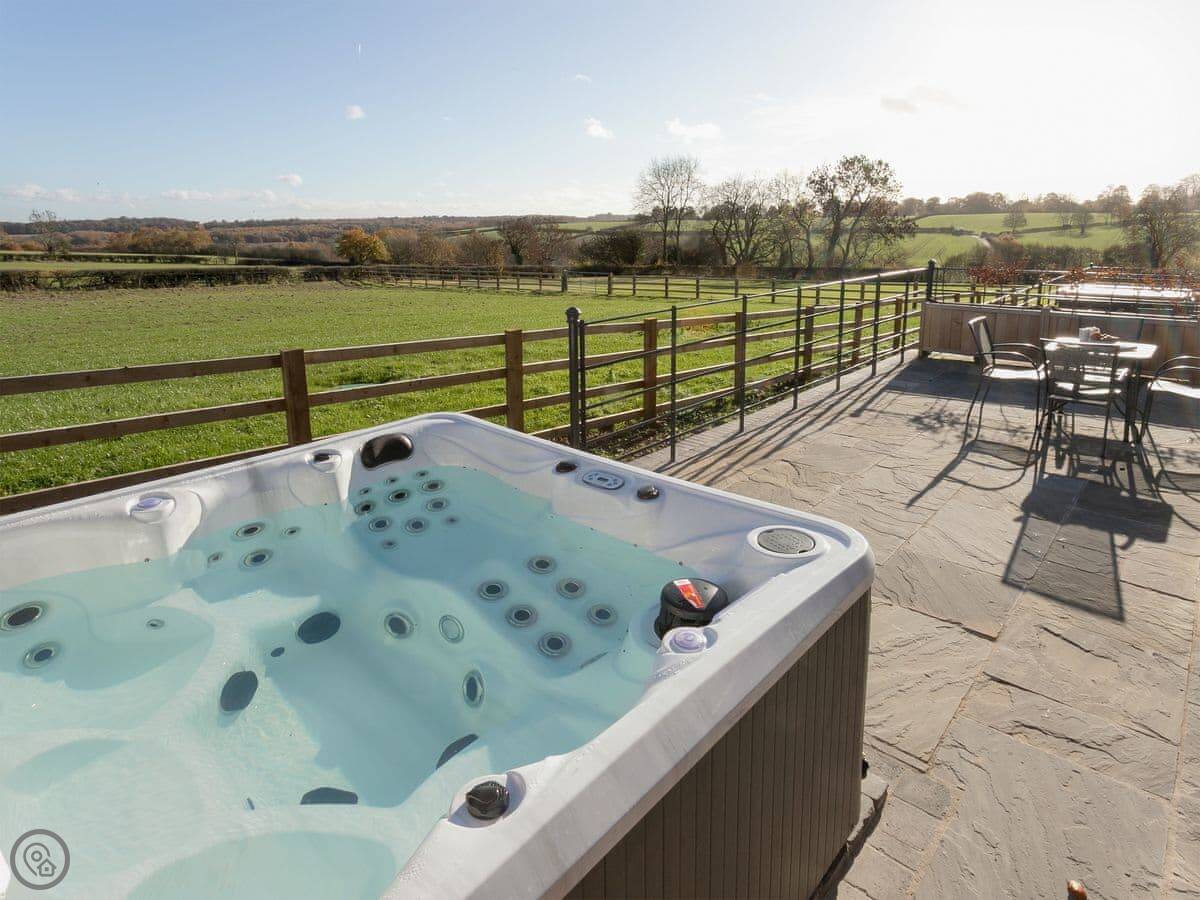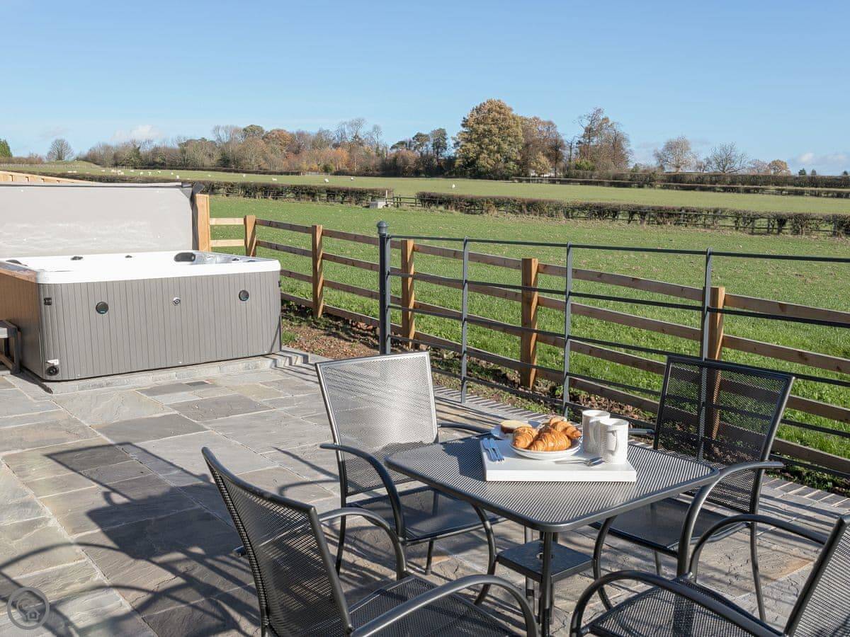 The main thing is the big bi-folding doors at the front. They open right up and the view is just fields. It's very quiet. Inside, it's all open plan. The kitchen has a dishwasher and a washing machine. The bathroom has a walk-in shower and a separate freestanding bath. There's a private hot tub in the garden.