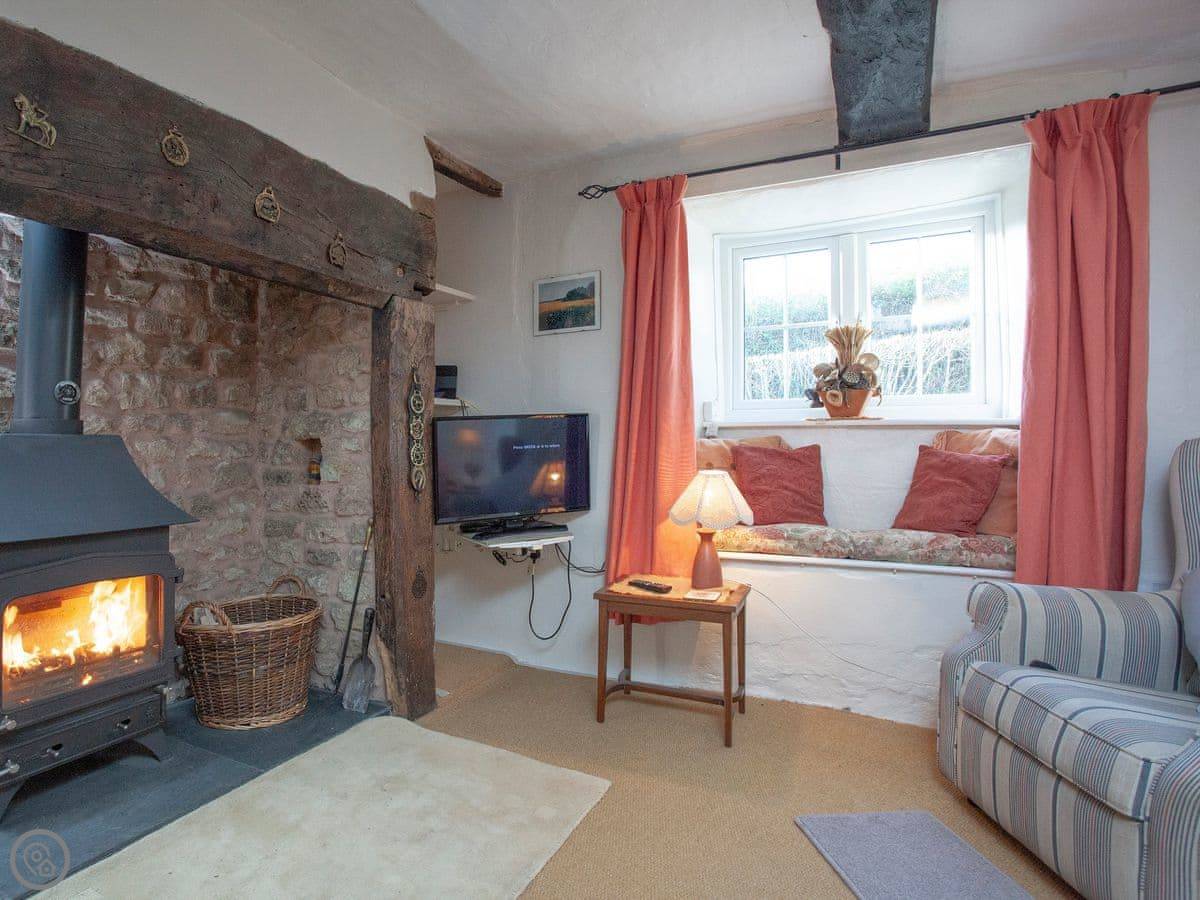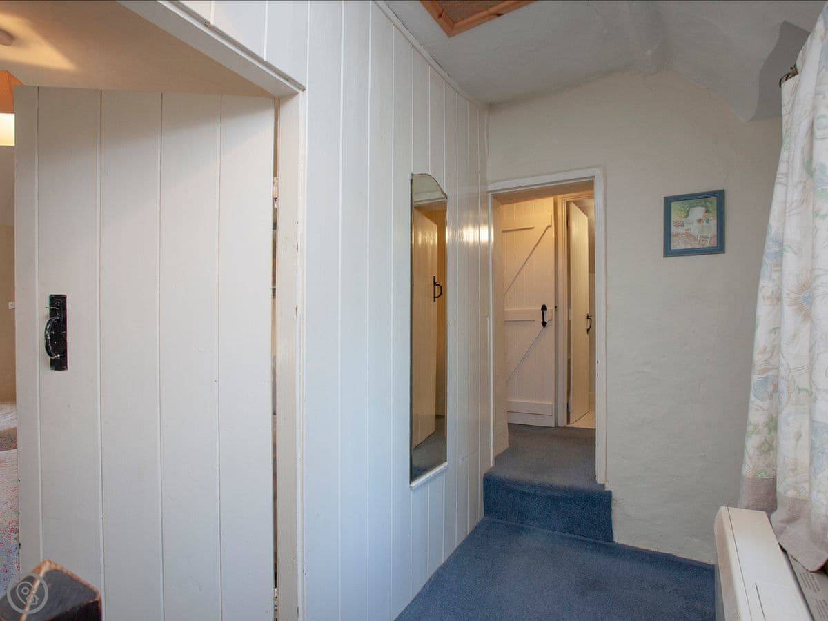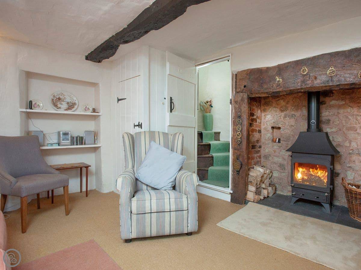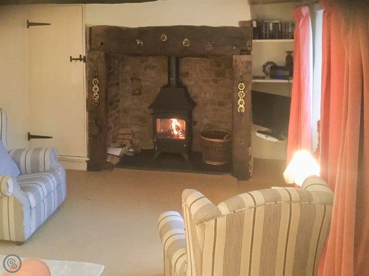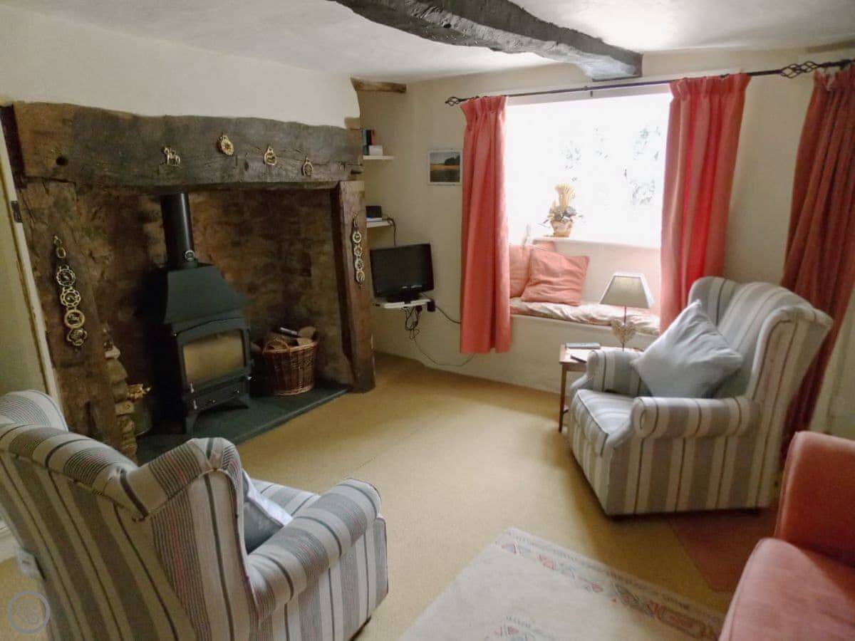 It sleeps five. There are three bedrooms and one bathroom with a shower. It's got a 4 Star rating, which means it's comfortable and well looked after. The main thing inside is the big inglenook fireplace. It's got a wood burner in it. It's a proper fireplace. The stairs are steep. They're old cottage stairs.