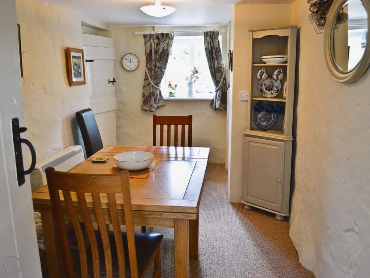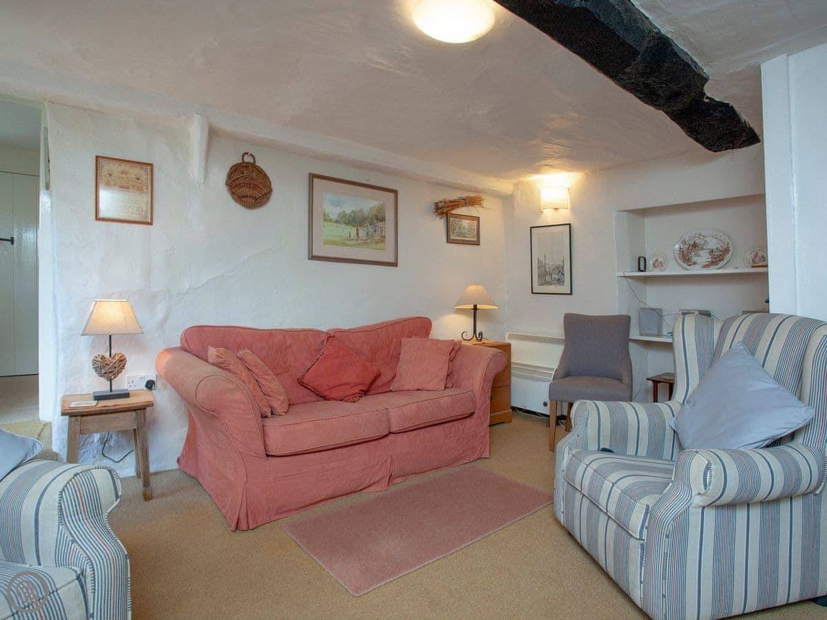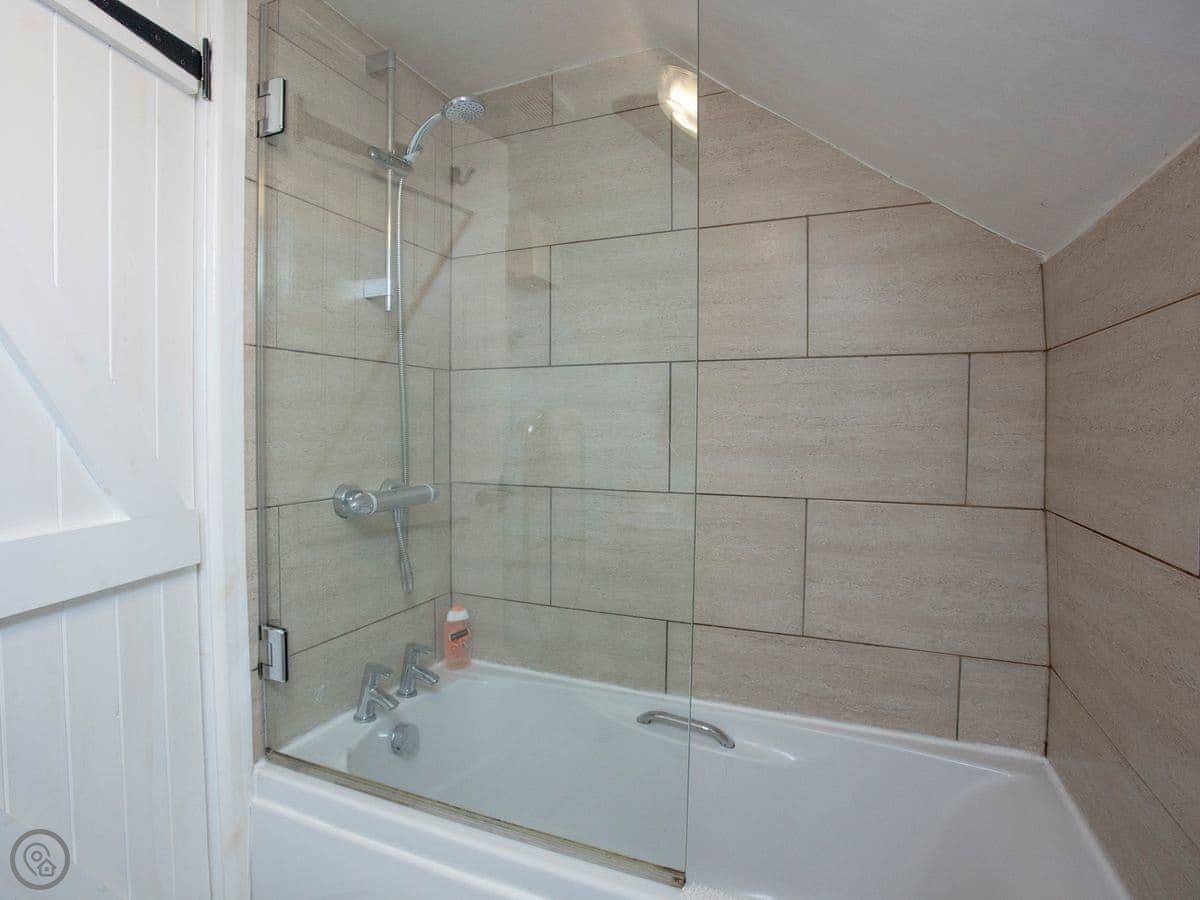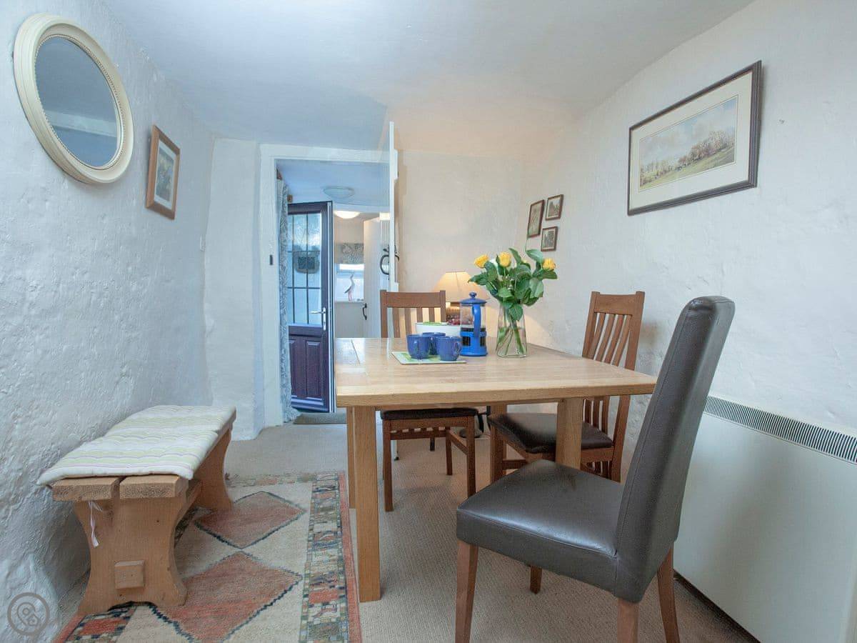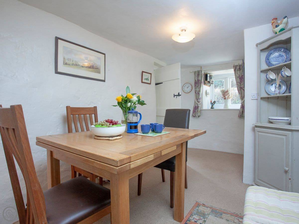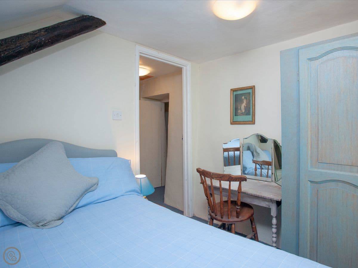 It sleeps five. There are three bedrooms and one bathroom with a shower. It's got a 4 Star rating, which means it's comfortable and well looked after. The main thing inside is the big inglenook fireplace. It's got a wood burner in it. It's a proper fireplace. The stairs are steep. They're old cottage stairs.