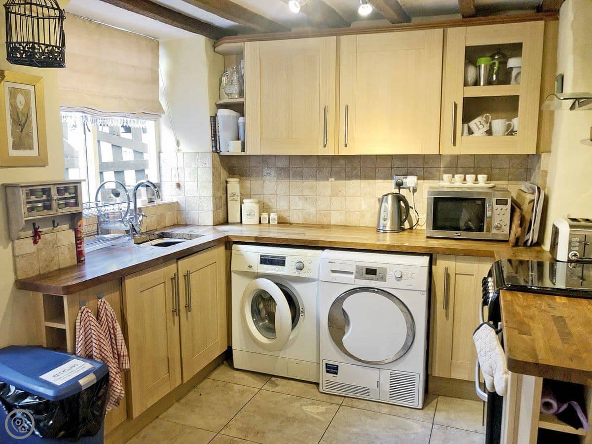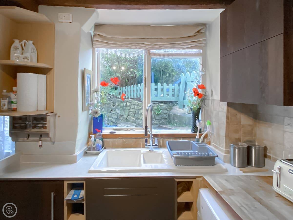 Inside, it's got a washing machine, dishwasher, Wi-Fi, and TV. Bedding and towels are included. There's a cot, highchair, and a stairgate if you need them. The entrance is wheelchair accessible.