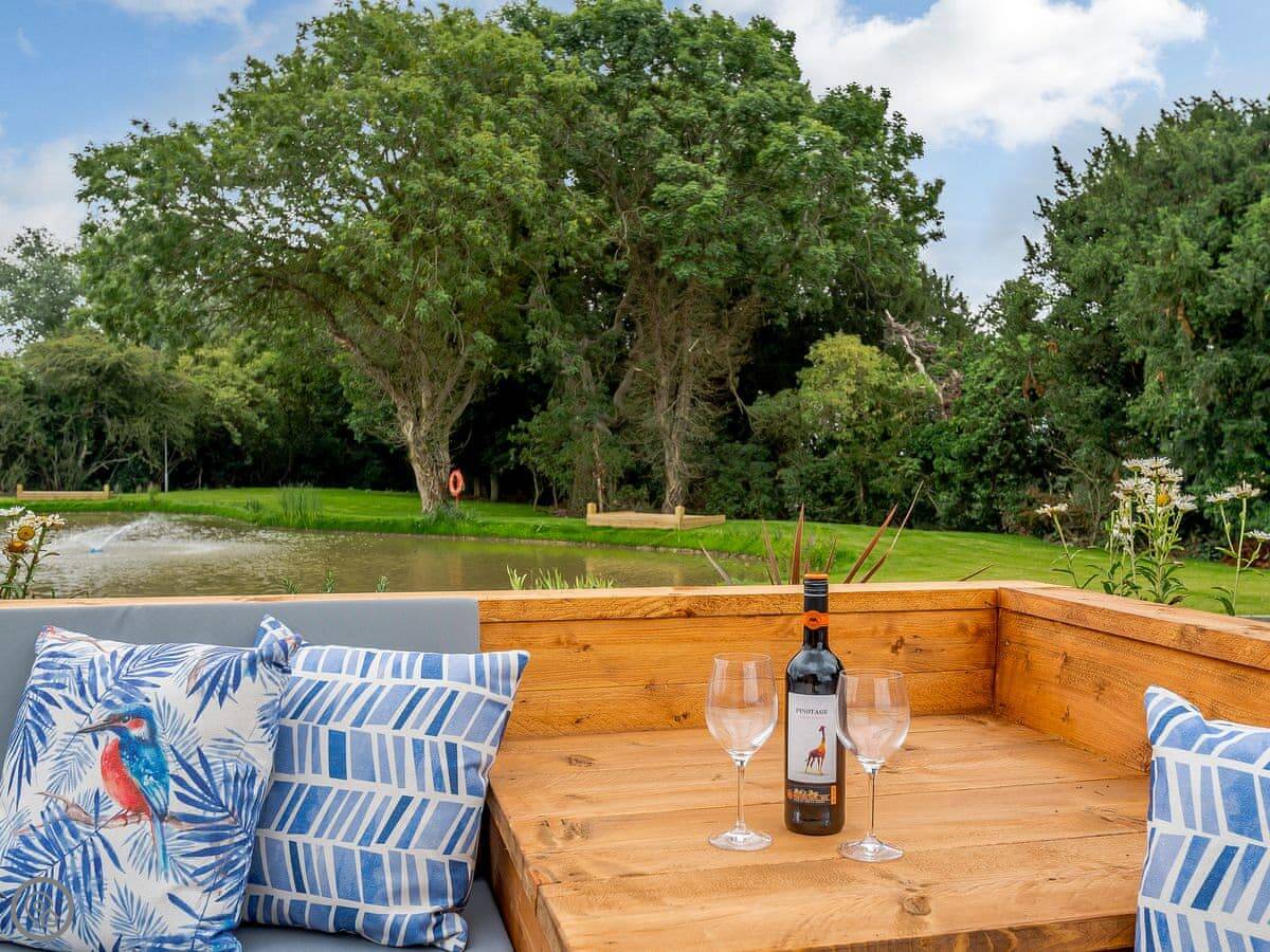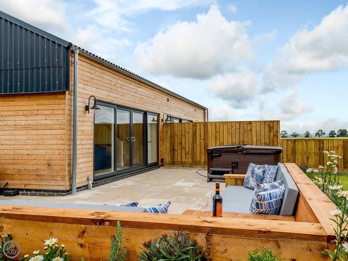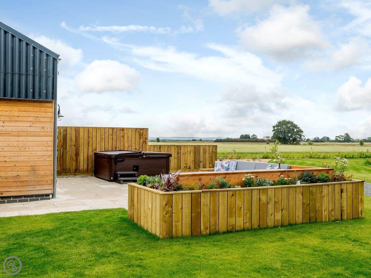There’s a patio with a hot tub. The hot tub is yours to use. The garden looks out over a small river. You can fish there if you have a licence. There’s a BBQ too.