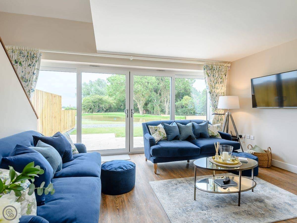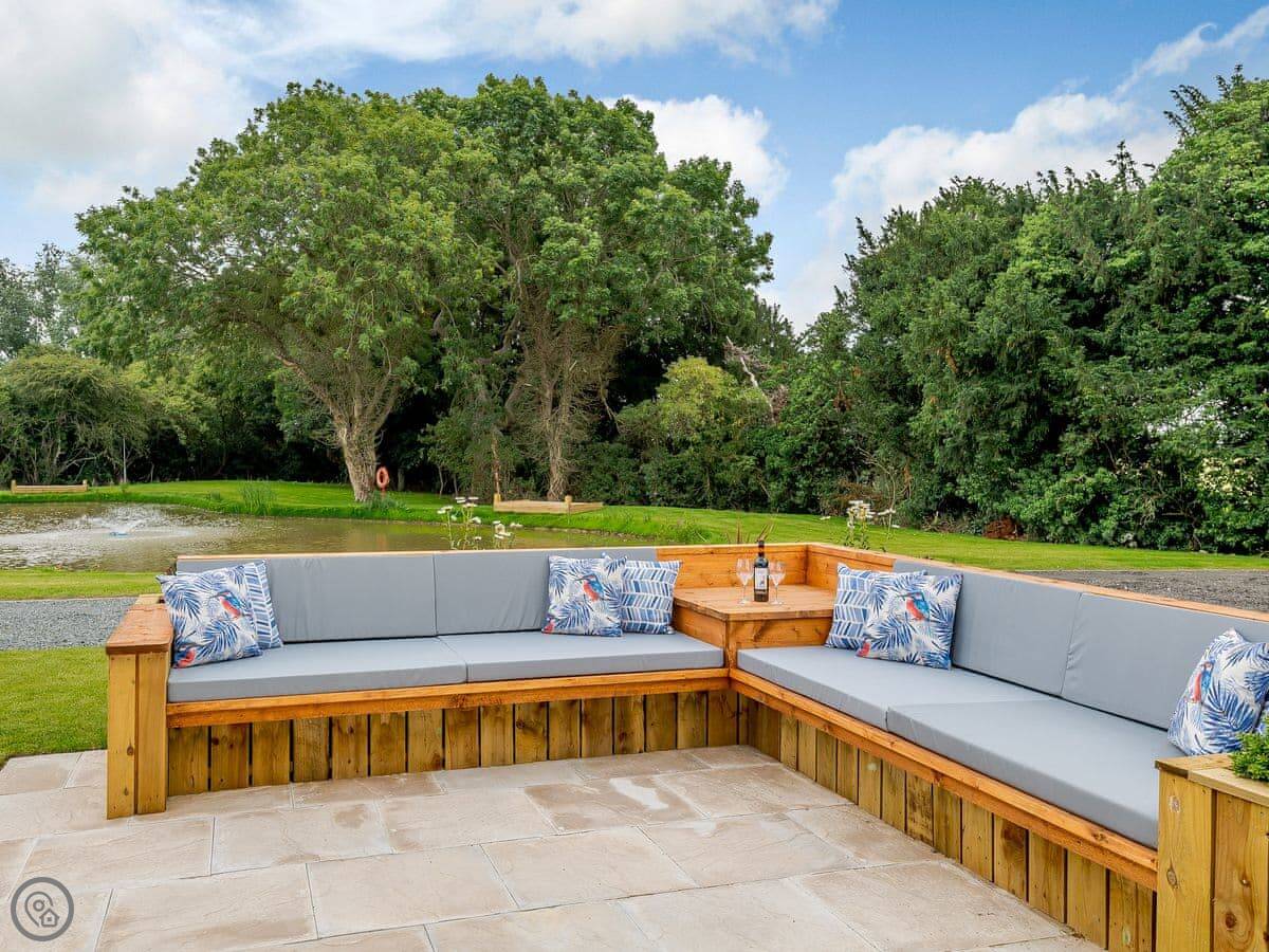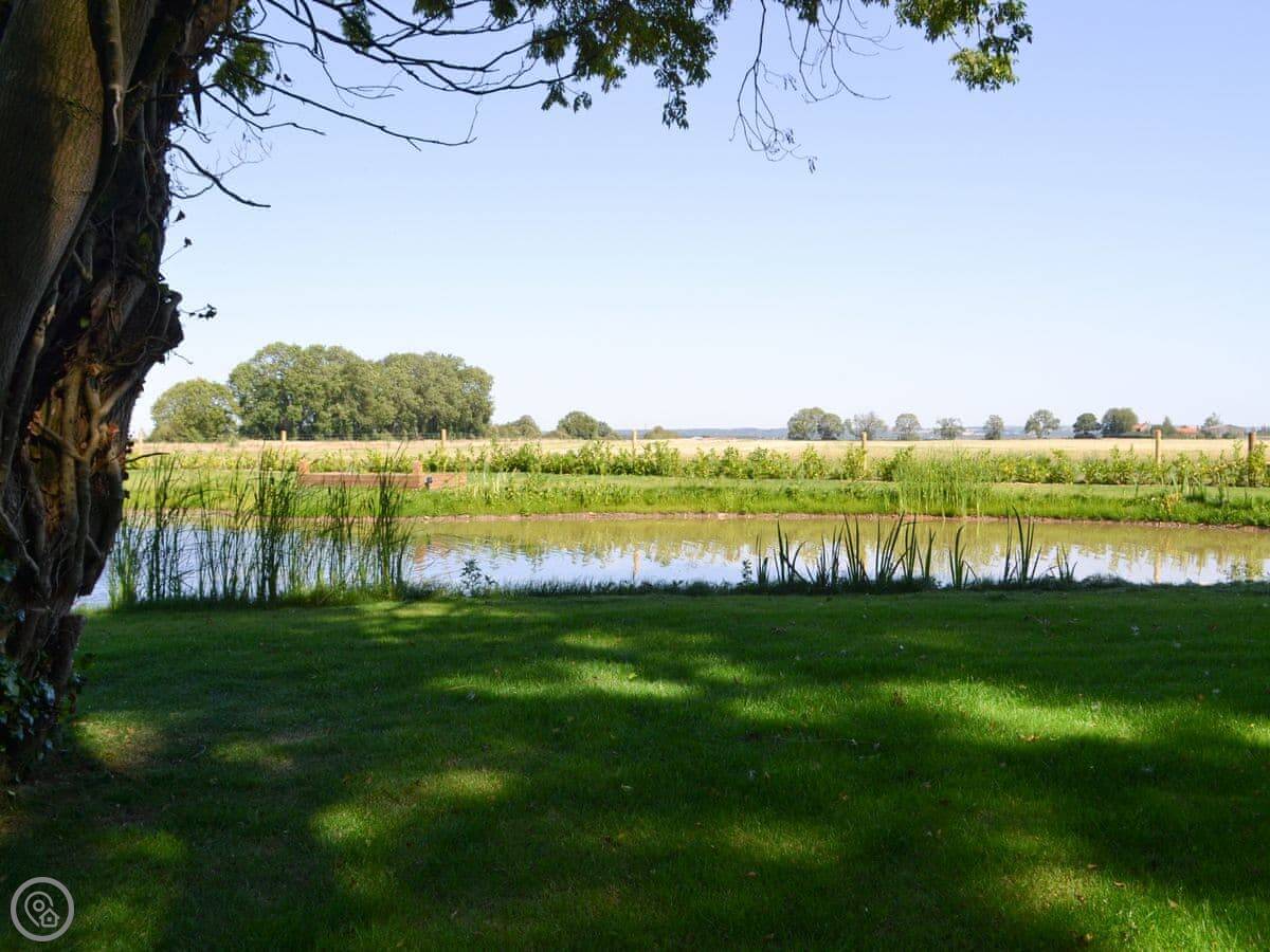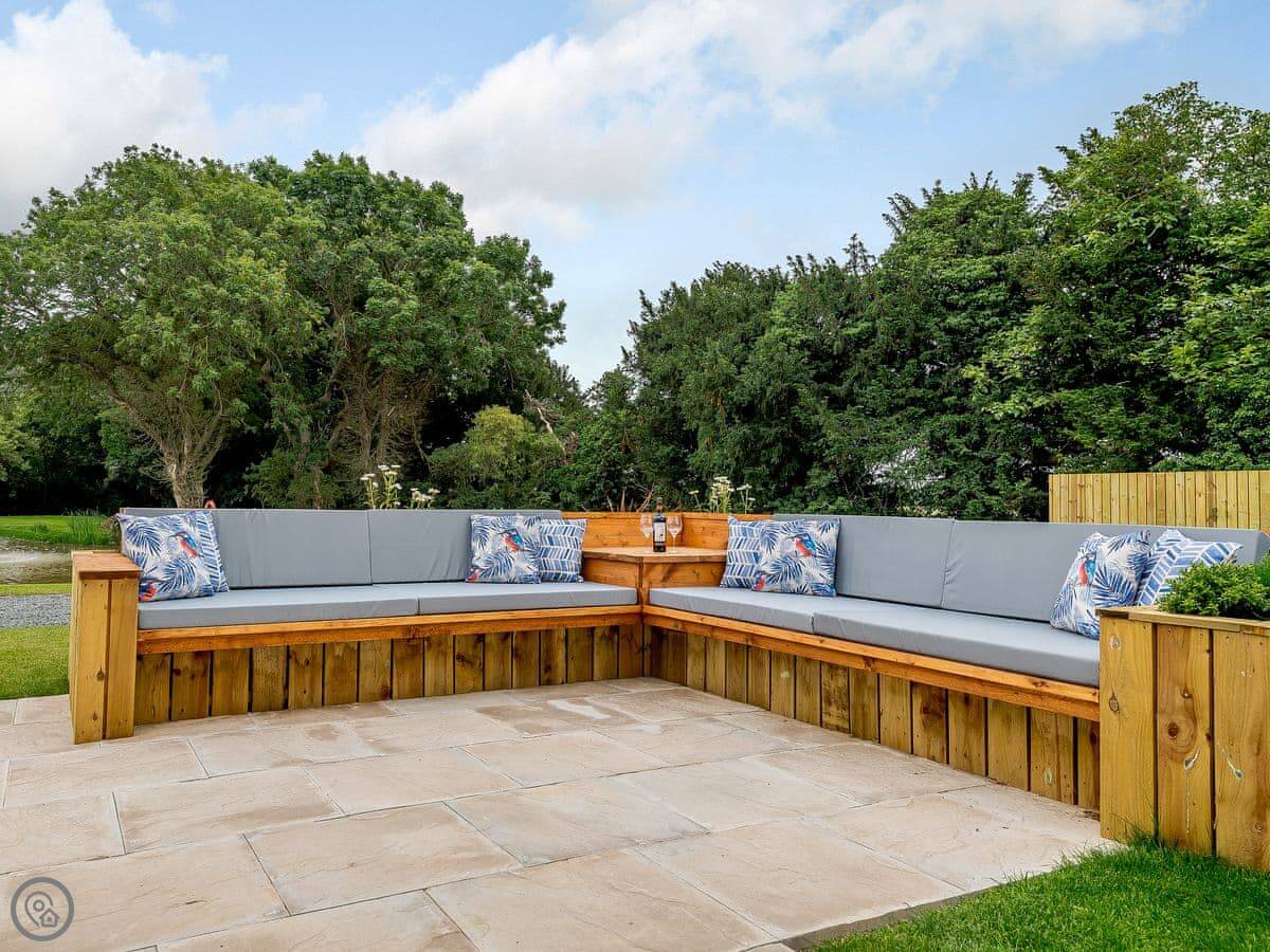 There’s a patio with a hot tub. The hot tub is yours to use. The garden looks out over a small river. You can fish there if you have a licence. There’s a BBQ too.
