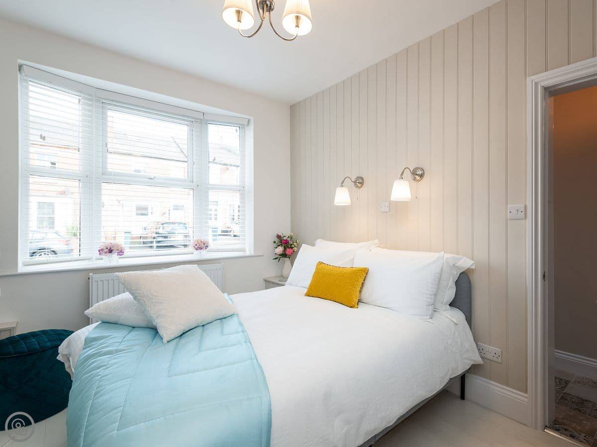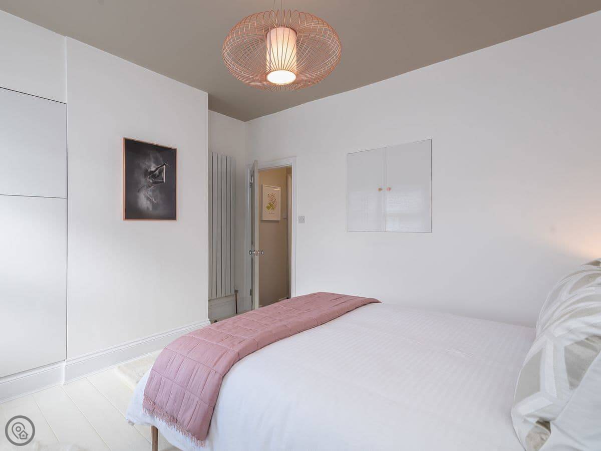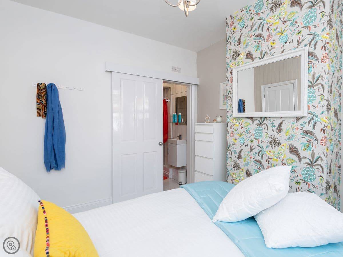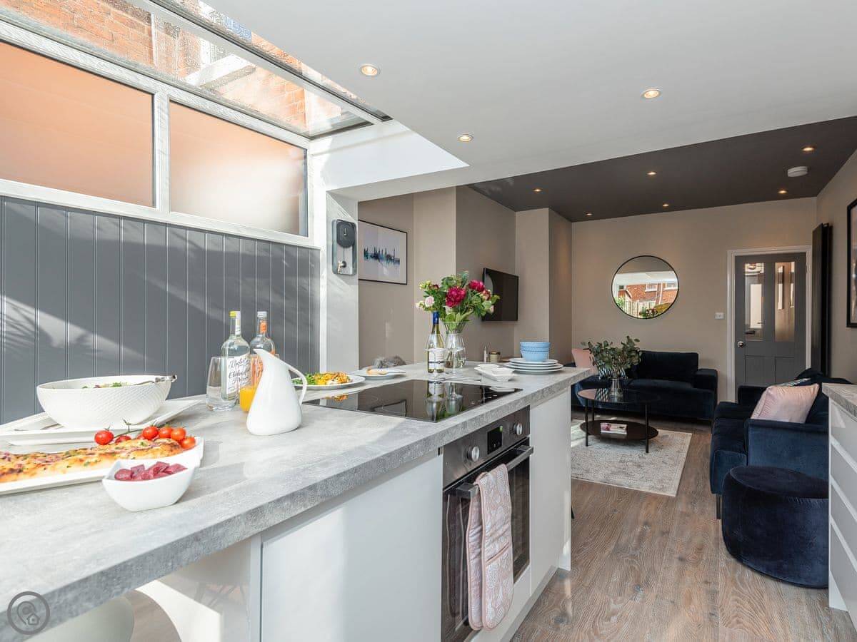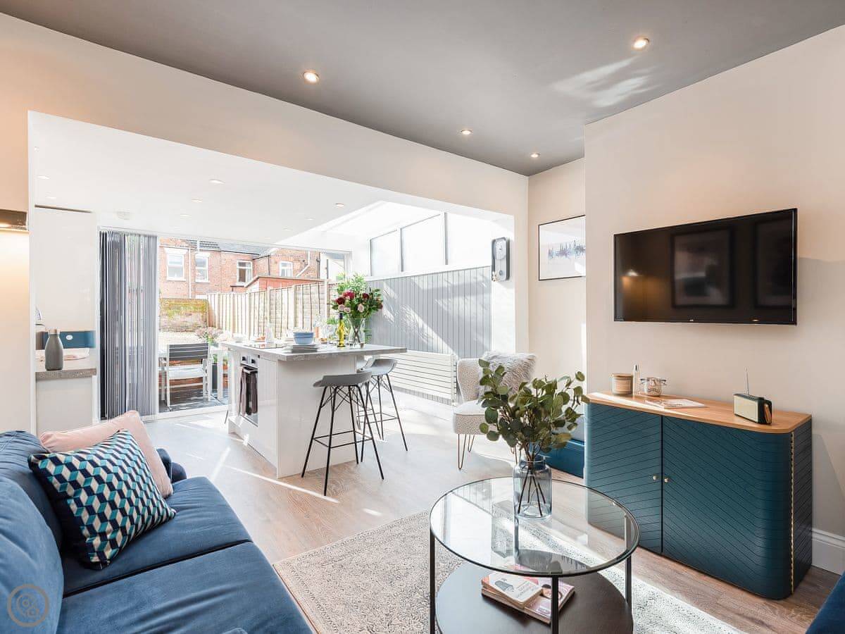 It’s a modern refurbishment inside. Three bedrooms, each with its own shower room. That’s handy with six people. The main living space is open plan with a kitchen island and big doors that open up to the garden. The garden faces south so it gets the sun.