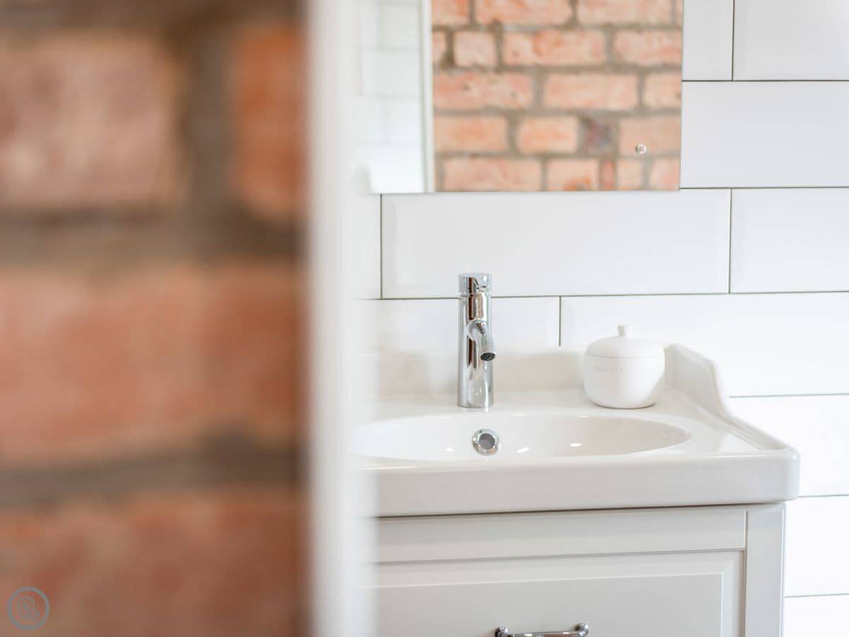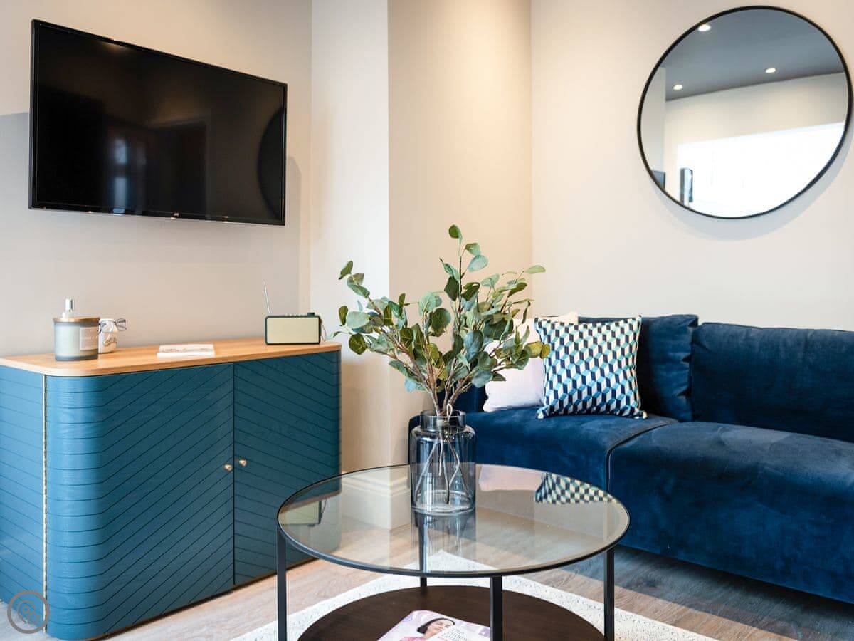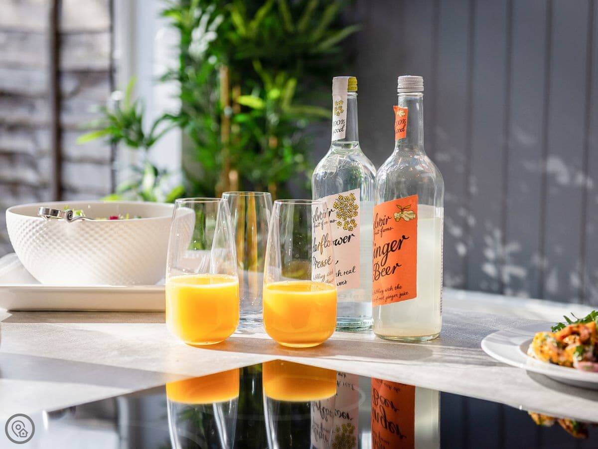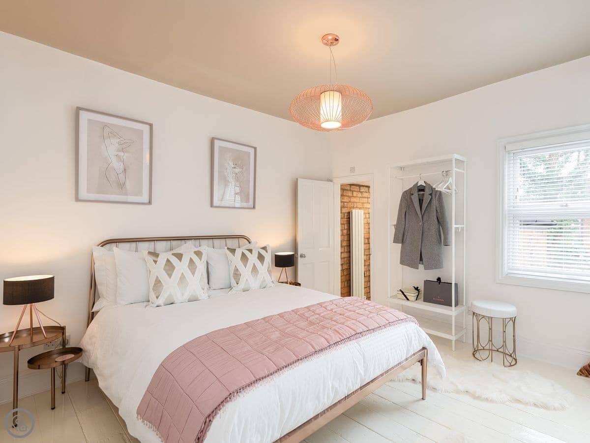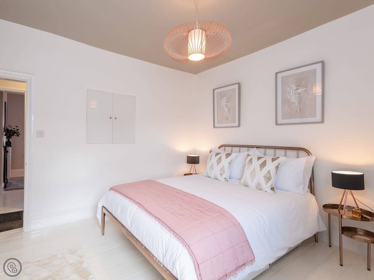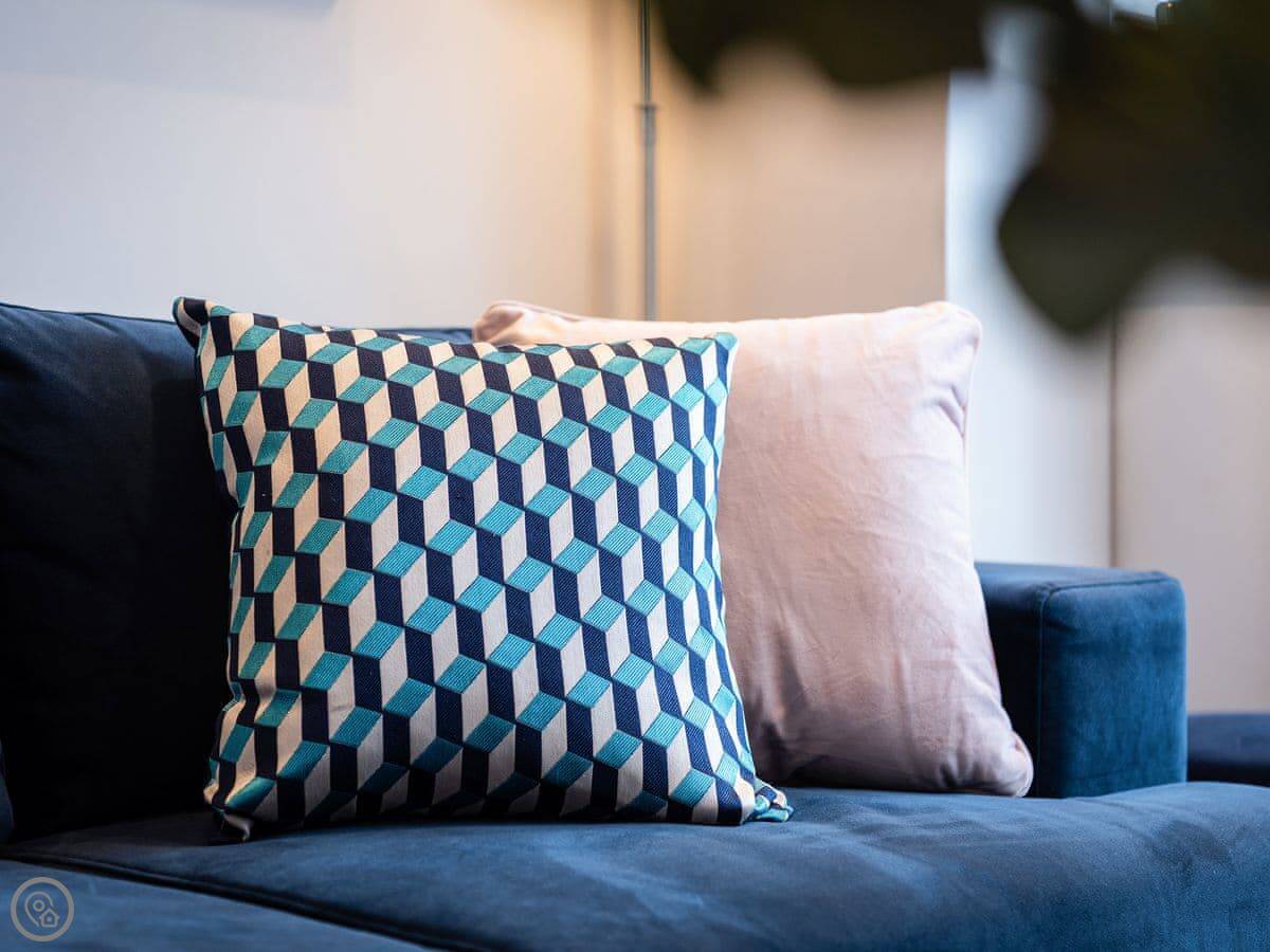 It’s a modern refurbishment inside. Three bedrooms, each with its own shower room. That’s handy with six people. The main living space is open plan with a kitchen island and big doors that open up to the garden. The garden faces south so it gets the sun.