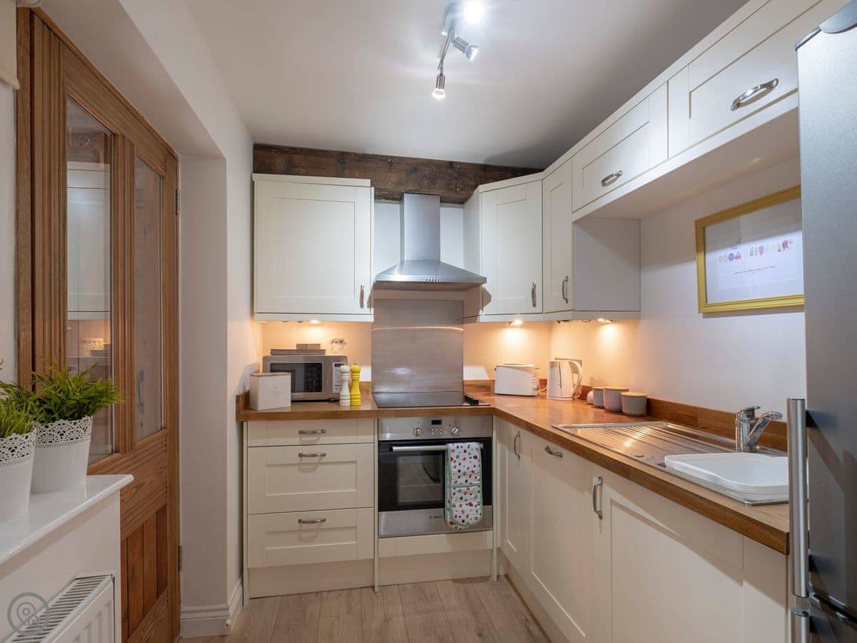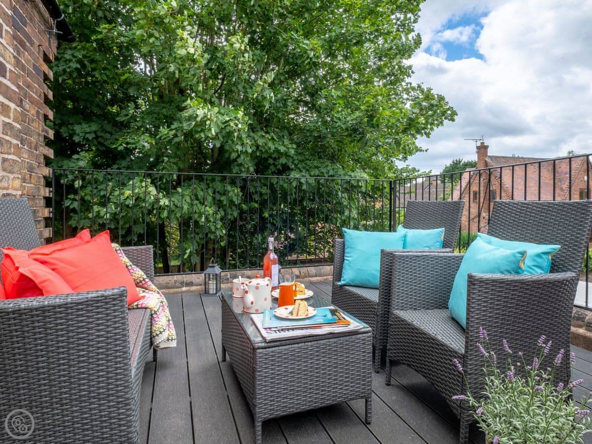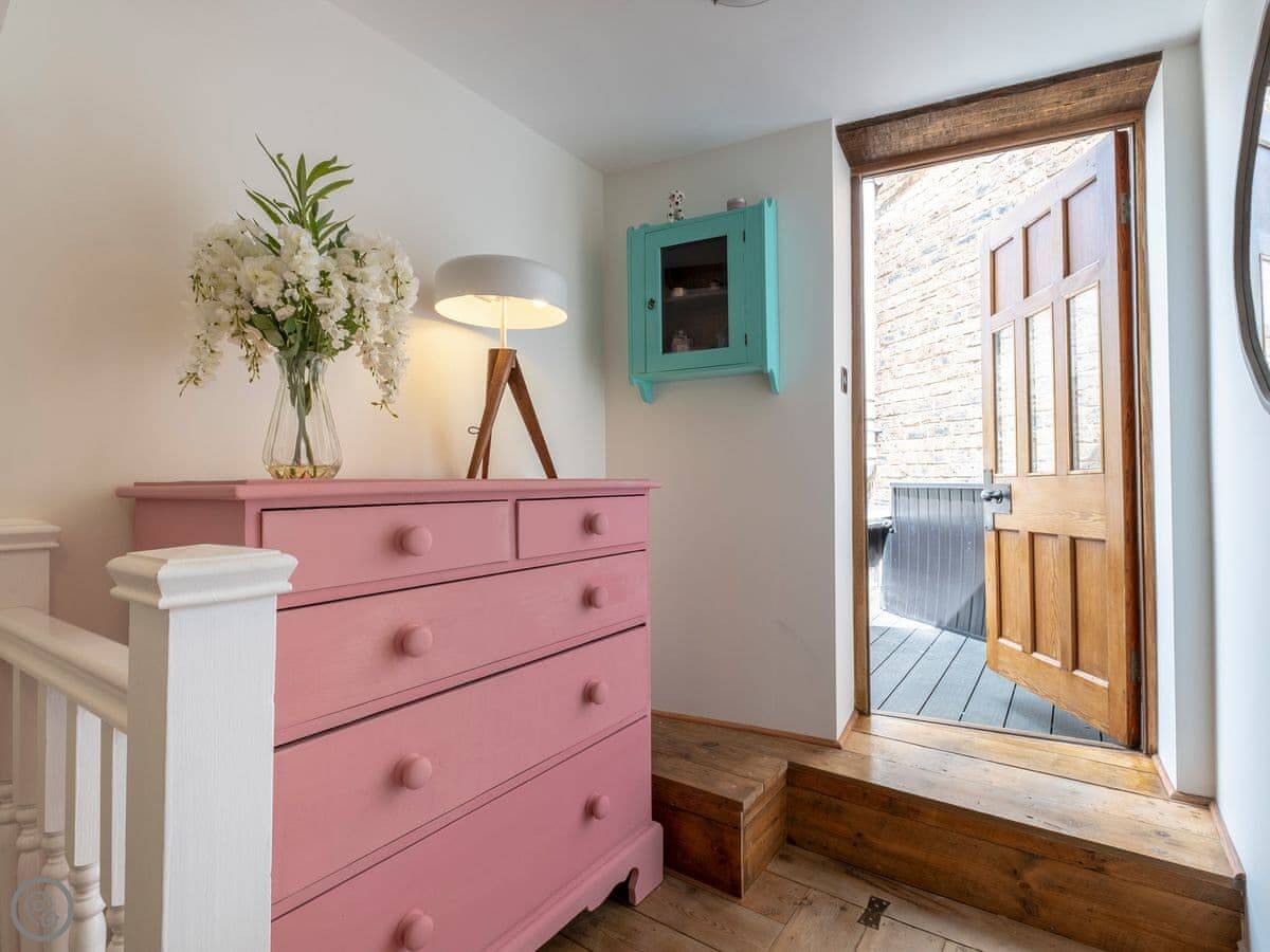 Inside, it's comfortable and clean. It has a 5 Star rating, which means it's in good order and has everything you'd need. There's a kitchen, a washing machine, a dishwasher. WiFi. Outside you get a small decked balcony off the first floor. It's private.