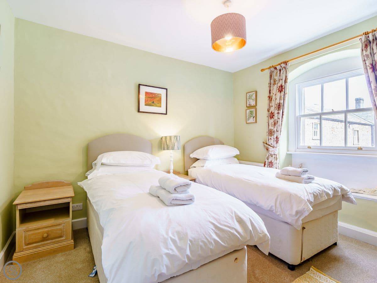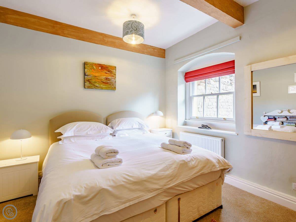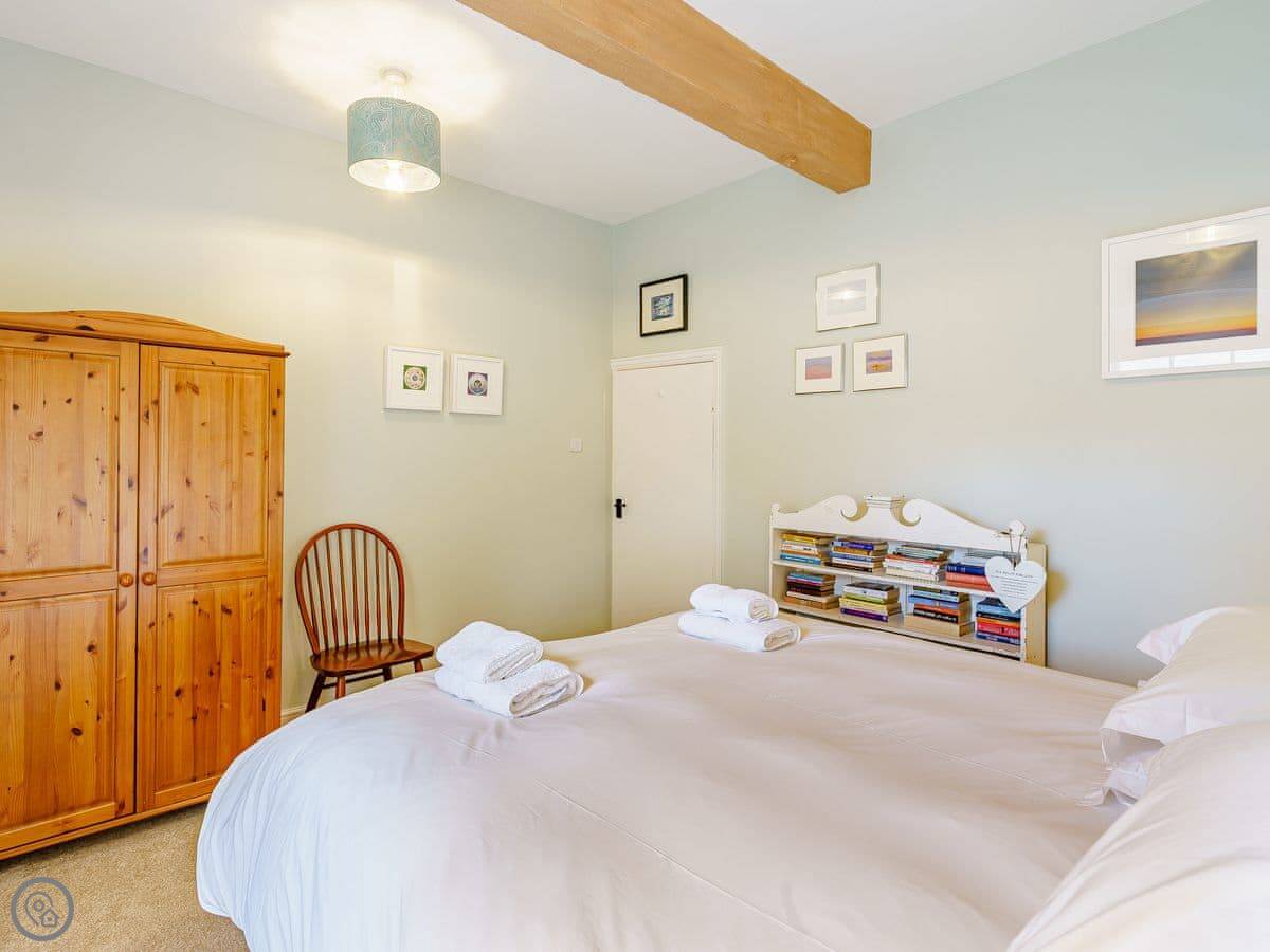 It sleeps six. Three bedrooms, two bathrooms, so one is ensuite. The beds can be doubles or twins, you just need to ask beforehand. The stairs are cottage stairs. They're fine, but they turn a corner and are a bit steep.
