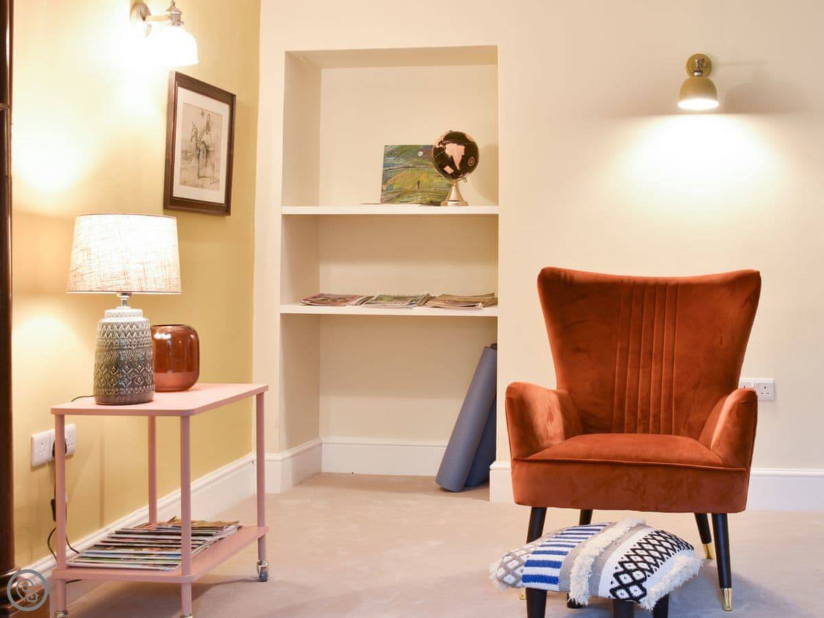 It's got a 4 Star rating. That means it's well looked after, with good beds and a proper kitchen. The living room has a wood burner effect stove, it's electric but gives a good glow. There's a separate little room off it with a table for games or reading. It's a quiet spot.