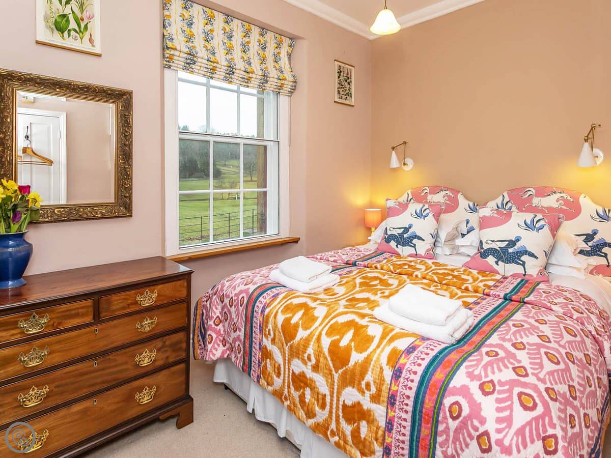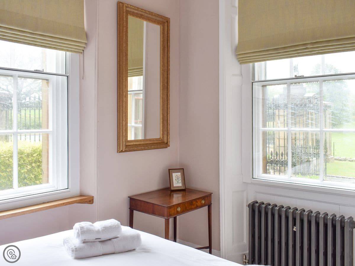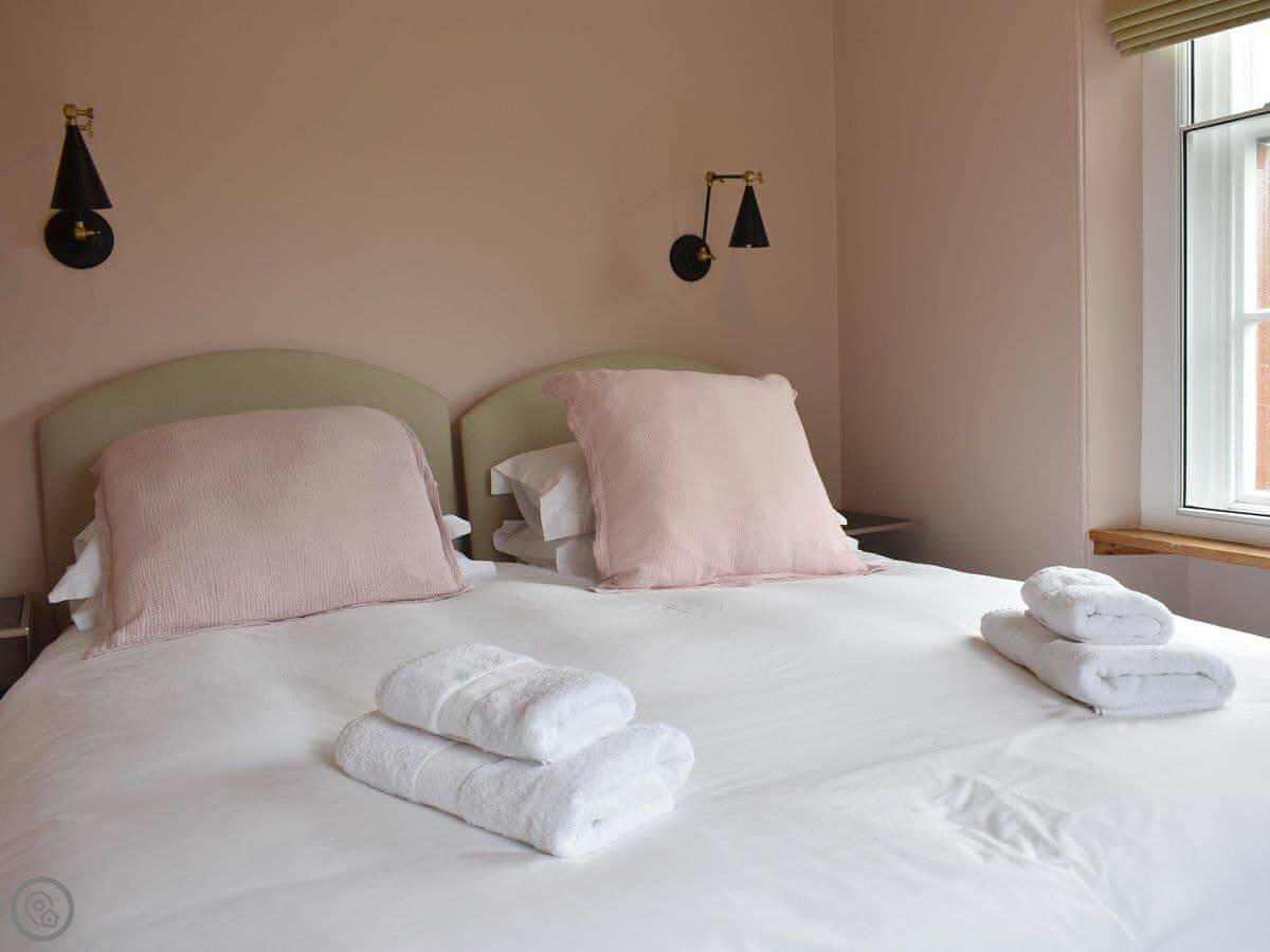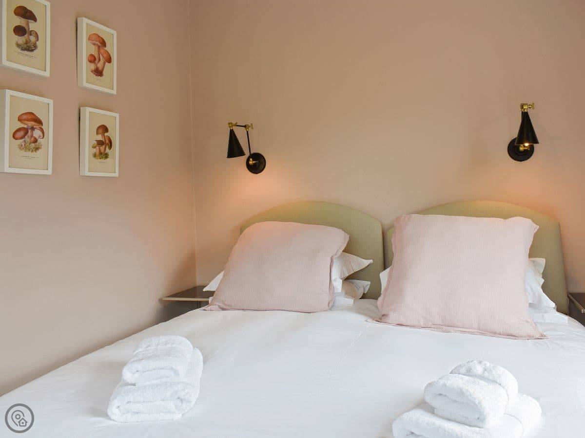 It sleeps four. Two bedrooms, both with super king beds. One bathroom with a roll-top bath. It's got a 4 Star rating. Everything's on the ground floor, which is handy.