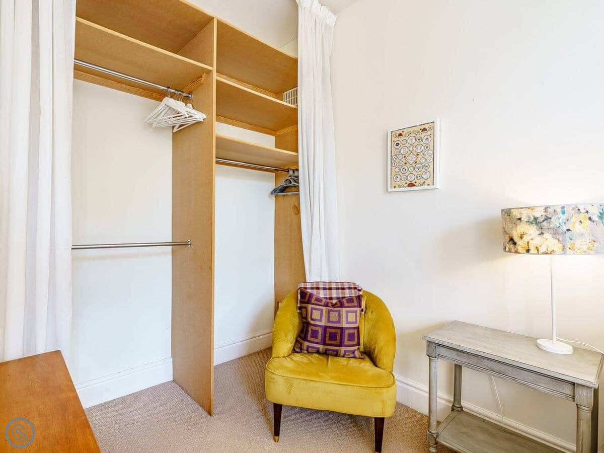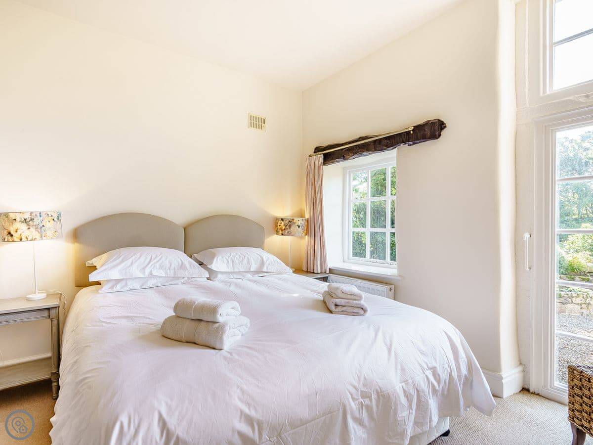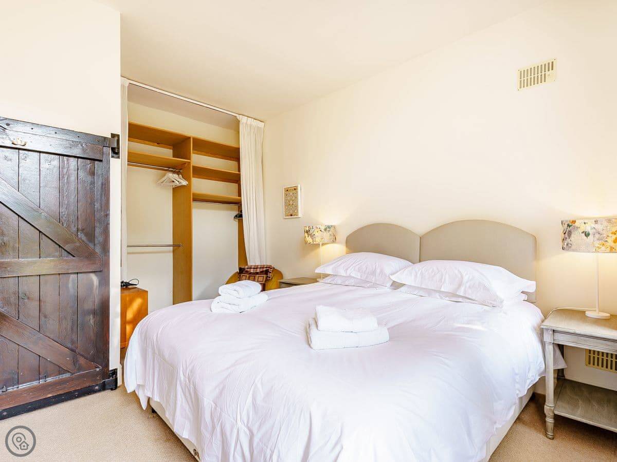 It sleeps two adults. There's a super king bed downstairs that you can split into twins if you ask. Upstairs is an attic room with two small single beds, so it's really only suitable for children. The stairs up there are quite steep and low, you have to mind your head. One bathroom with a shower.