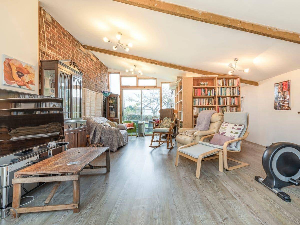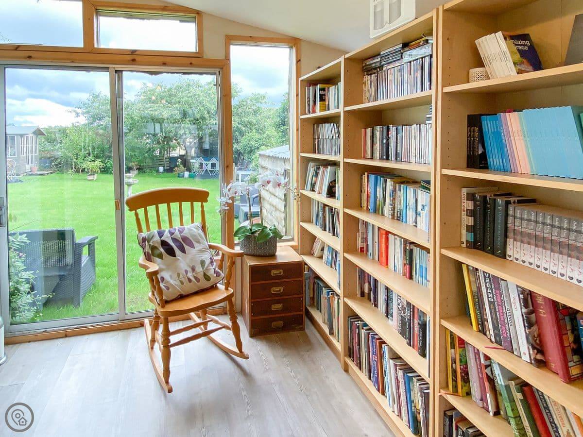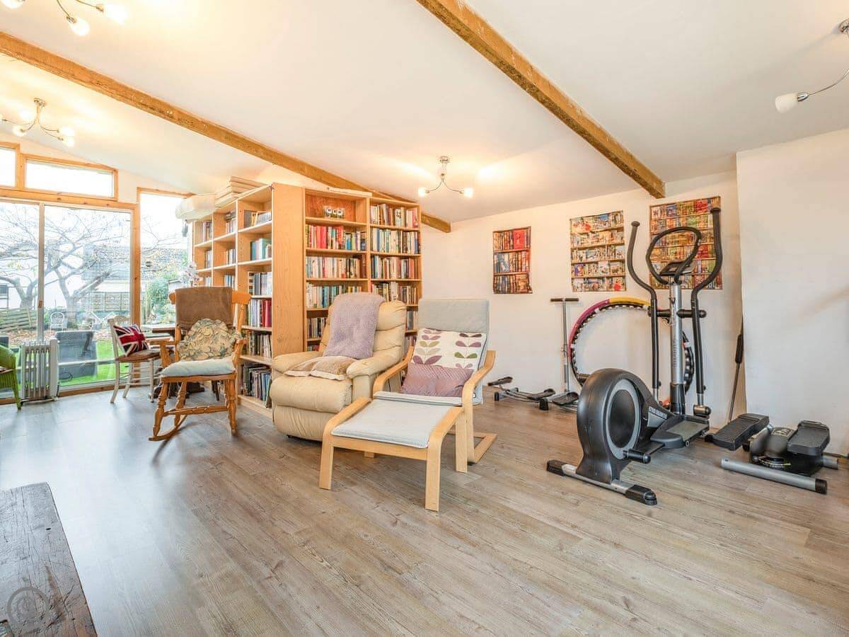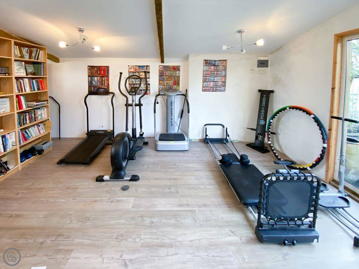 Outside, there's a walled garden with seating and a summer house. At the back there's a separate studio building with a TV, some exercise equipment and a couple of armchairs.