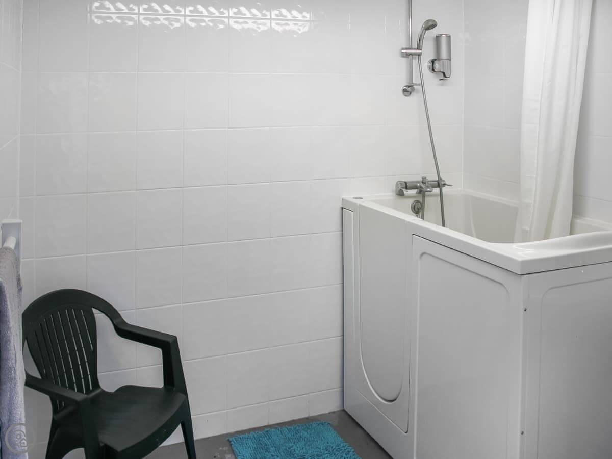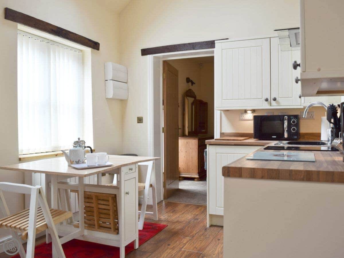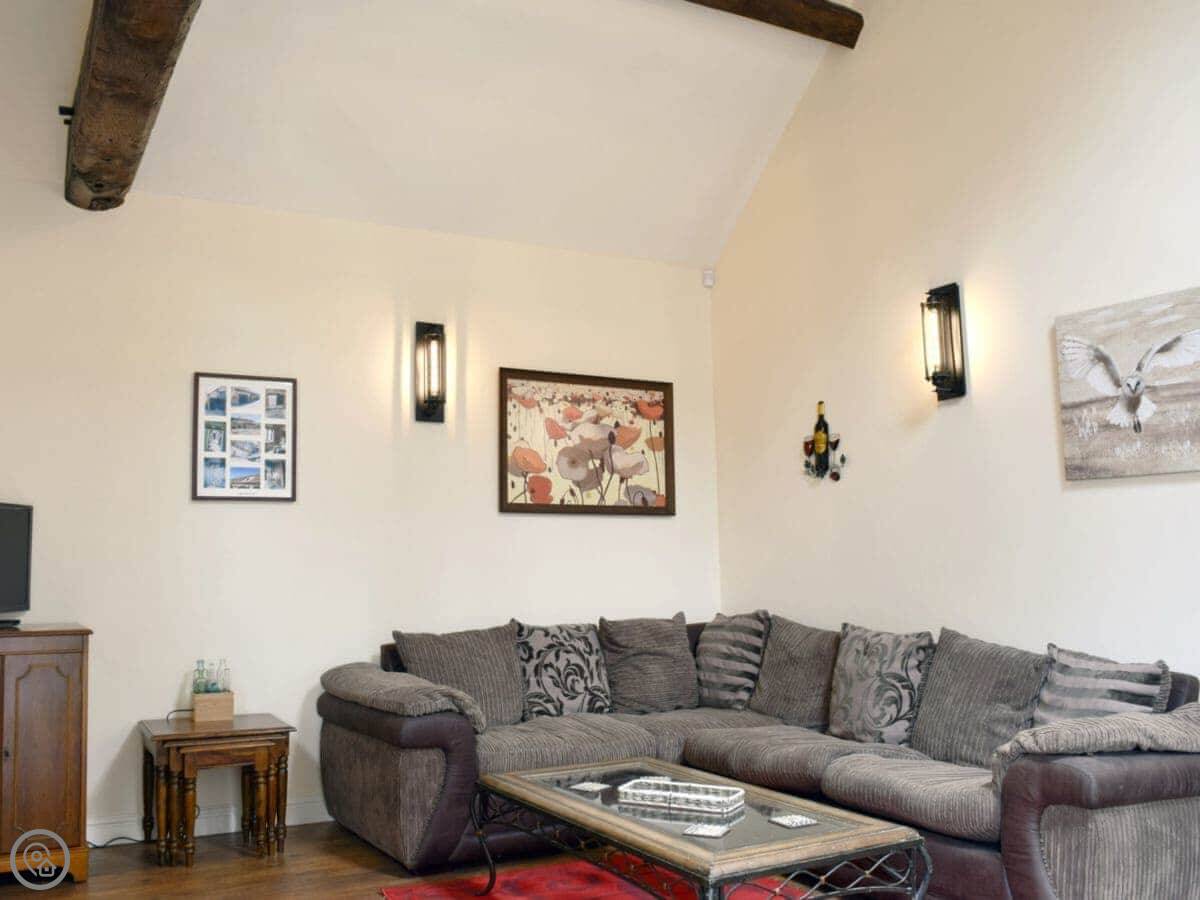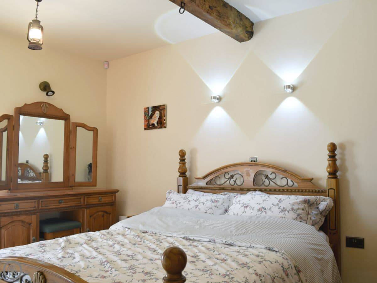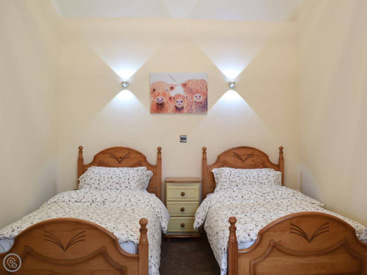 It sleeps four, in two bedrooms. Has one bathroom, which is on the ground floor. It's got a 4 Star rating. Everything is on one level except the bedrooms. It's completely wheelchair accessible. The lane is quiet but it's not a private drive, so cars do pass by occasionally.