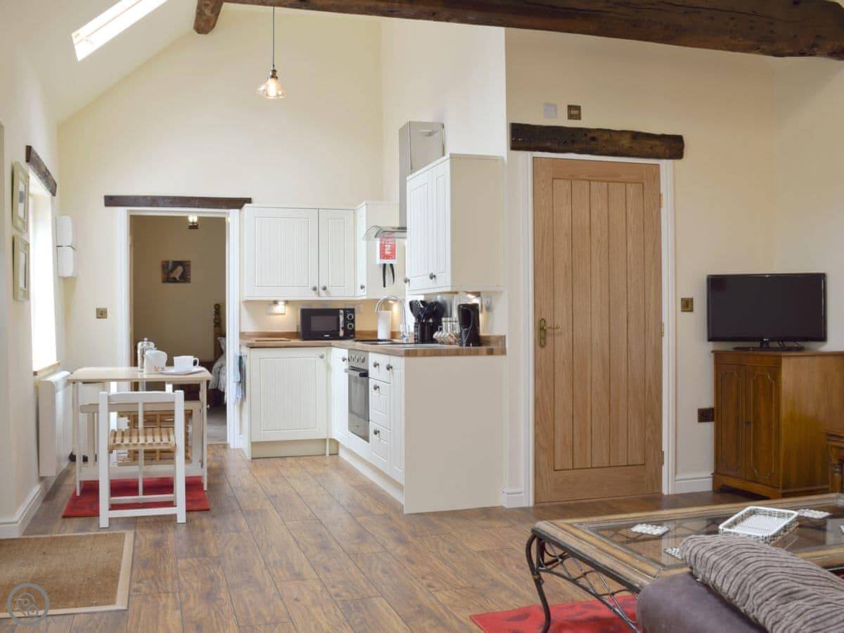Inside is open plan. There's a kitchen, dining area, and living space together. It's clean and modern, with good wifi and a TV. There's a washing machine and all the bedding and towels are included. You can bring up to two dogs.