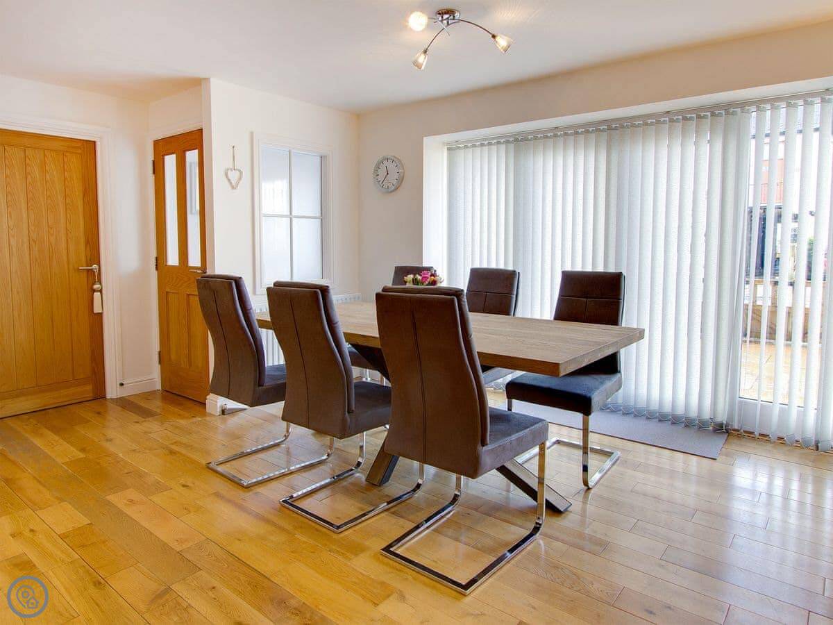 The kitchen is modern, with a dishwasher and washing machine. The dining table is big. Patio doors open onto a courtyard with a BBQ. It's not a big garden, but it's private. There's a downstairs toilet.