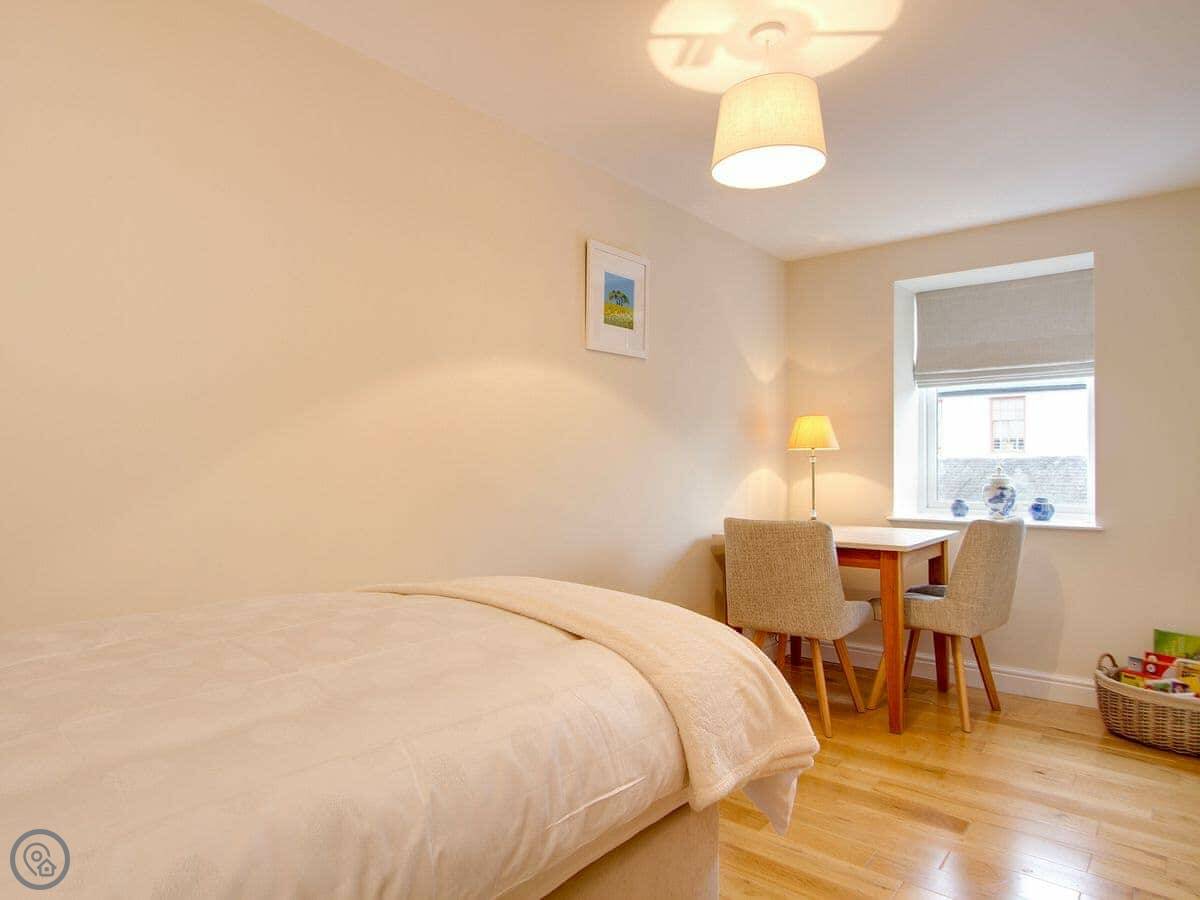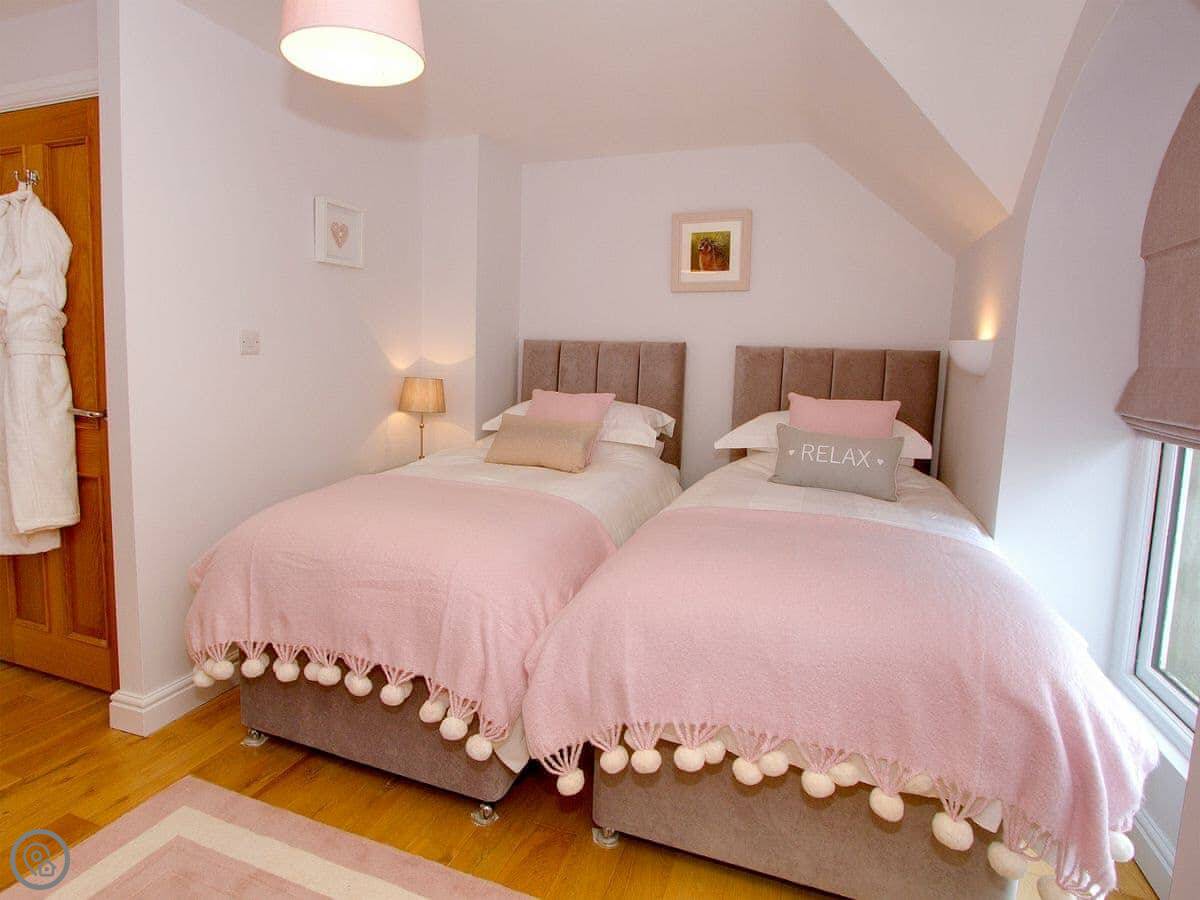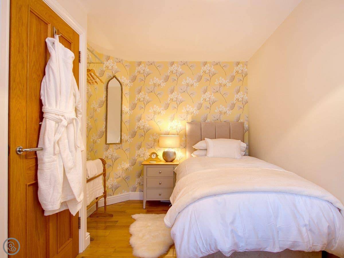 It sleeps five, in three bedrooms. Two of the bedrooms have en-suite shower rooms. There's a single bedroom on the first floor, next to the living room. All the bedding and towels are included.