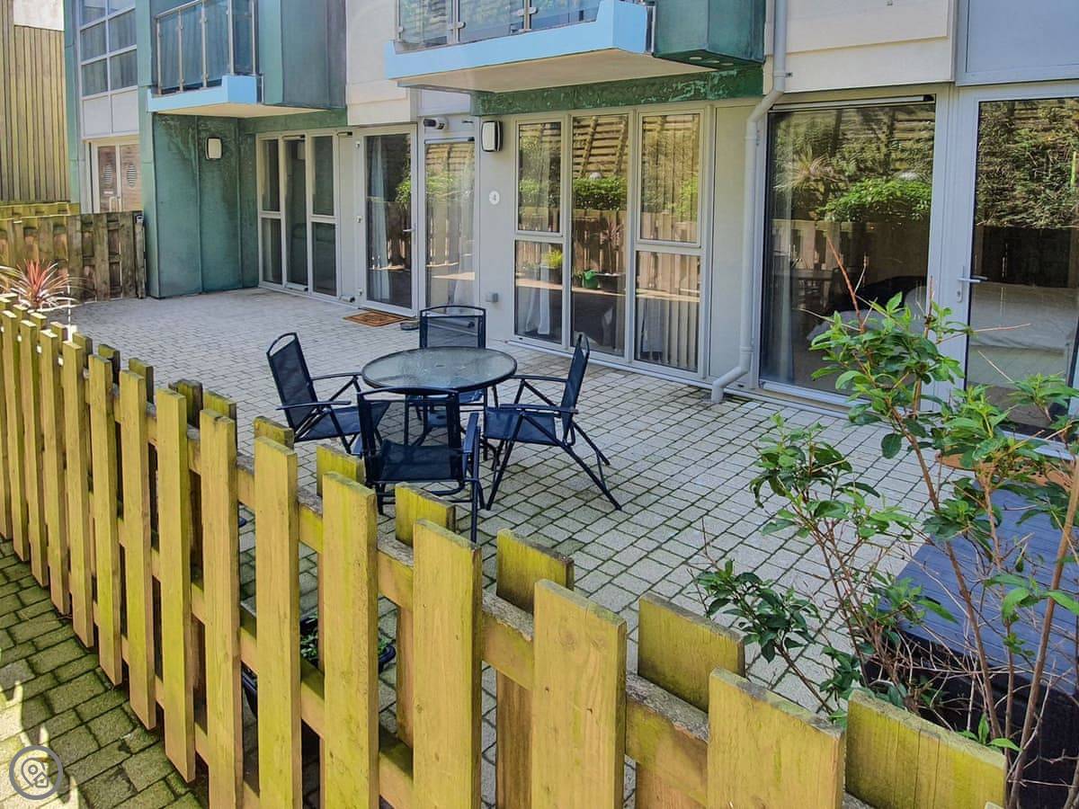 The living space is open plan. The kitchen's fine for doing holiday meals. There's a TV and a sofa. The best bit is the outside space. You get a small enclosed patio garden round the back. It's got seating. It's private and gets the sun.