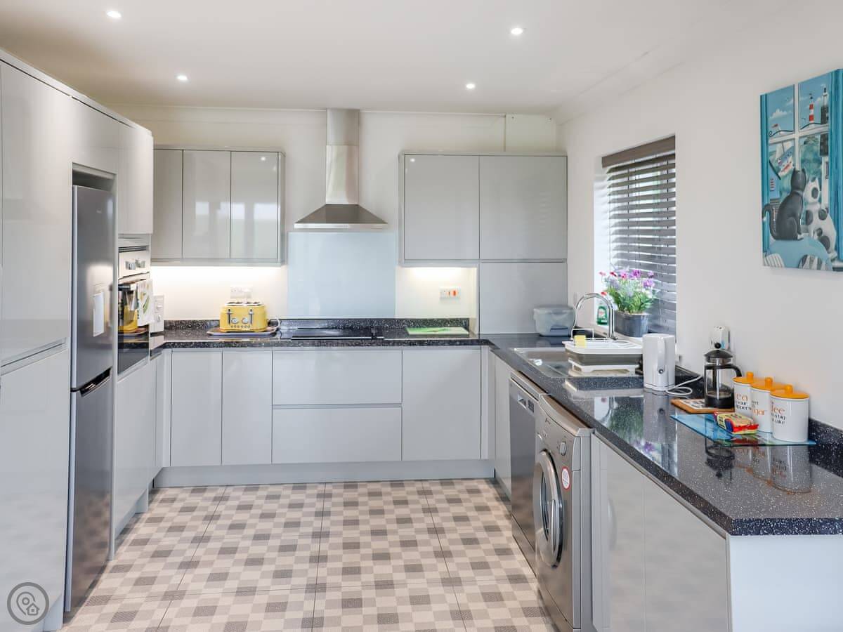 The living area is open plan with patio doors. There's a TV, WiFi, a dishwasher and a washing machine. Bedding and towels are included. We can provide a cot and highchair. Parking is on site.
